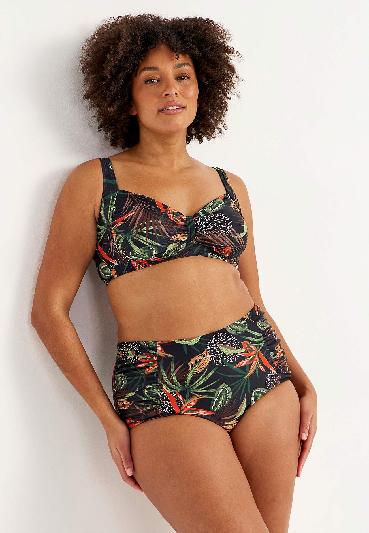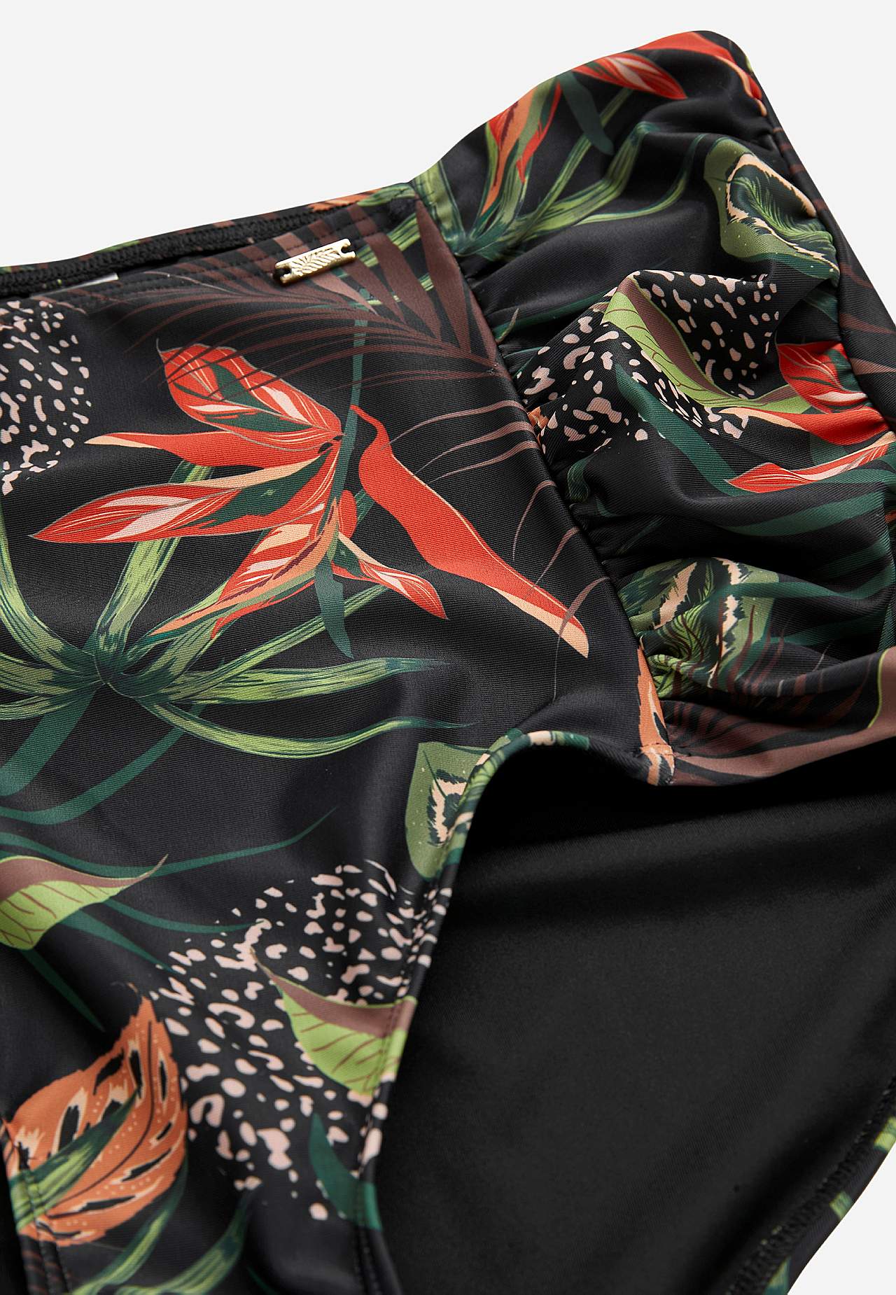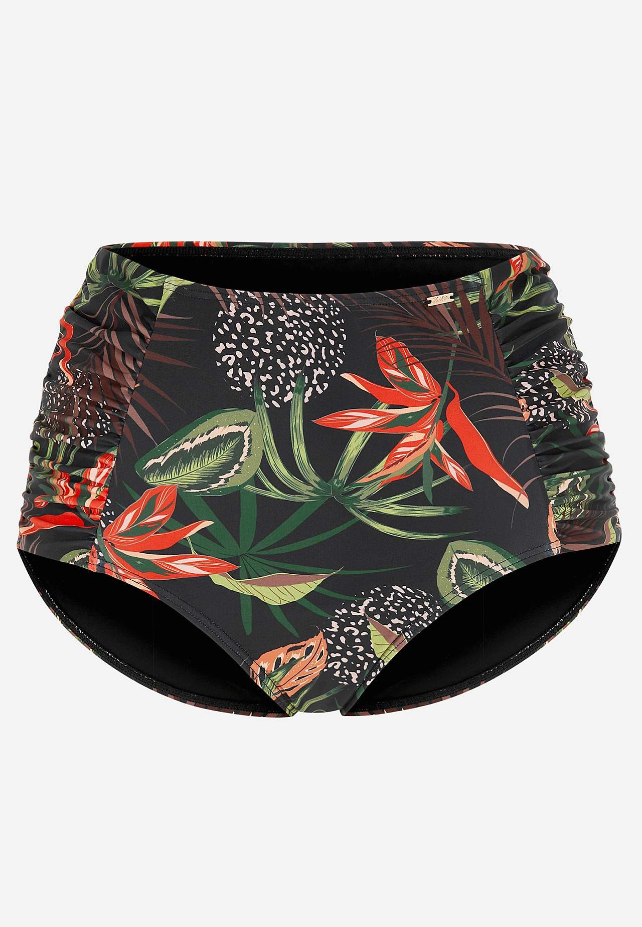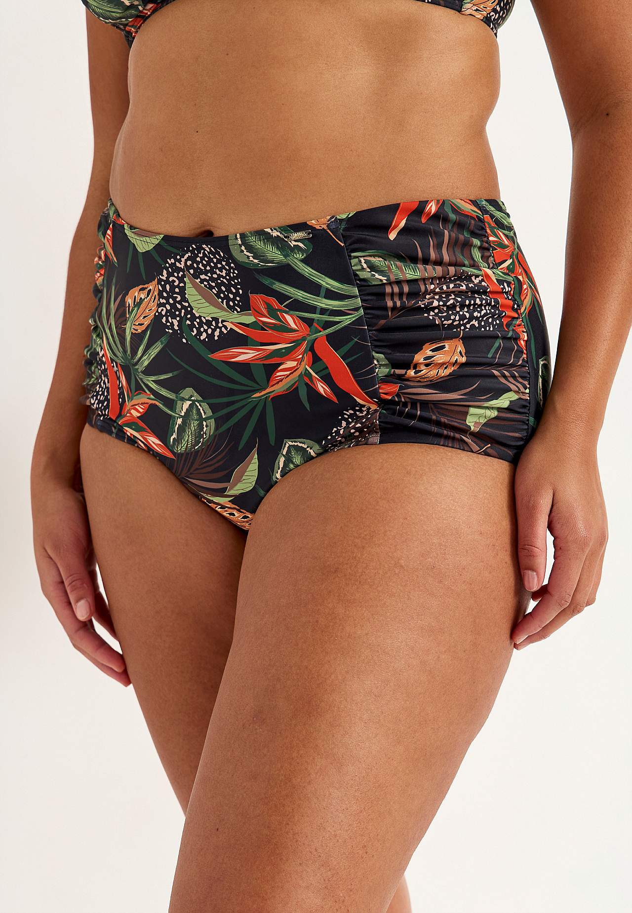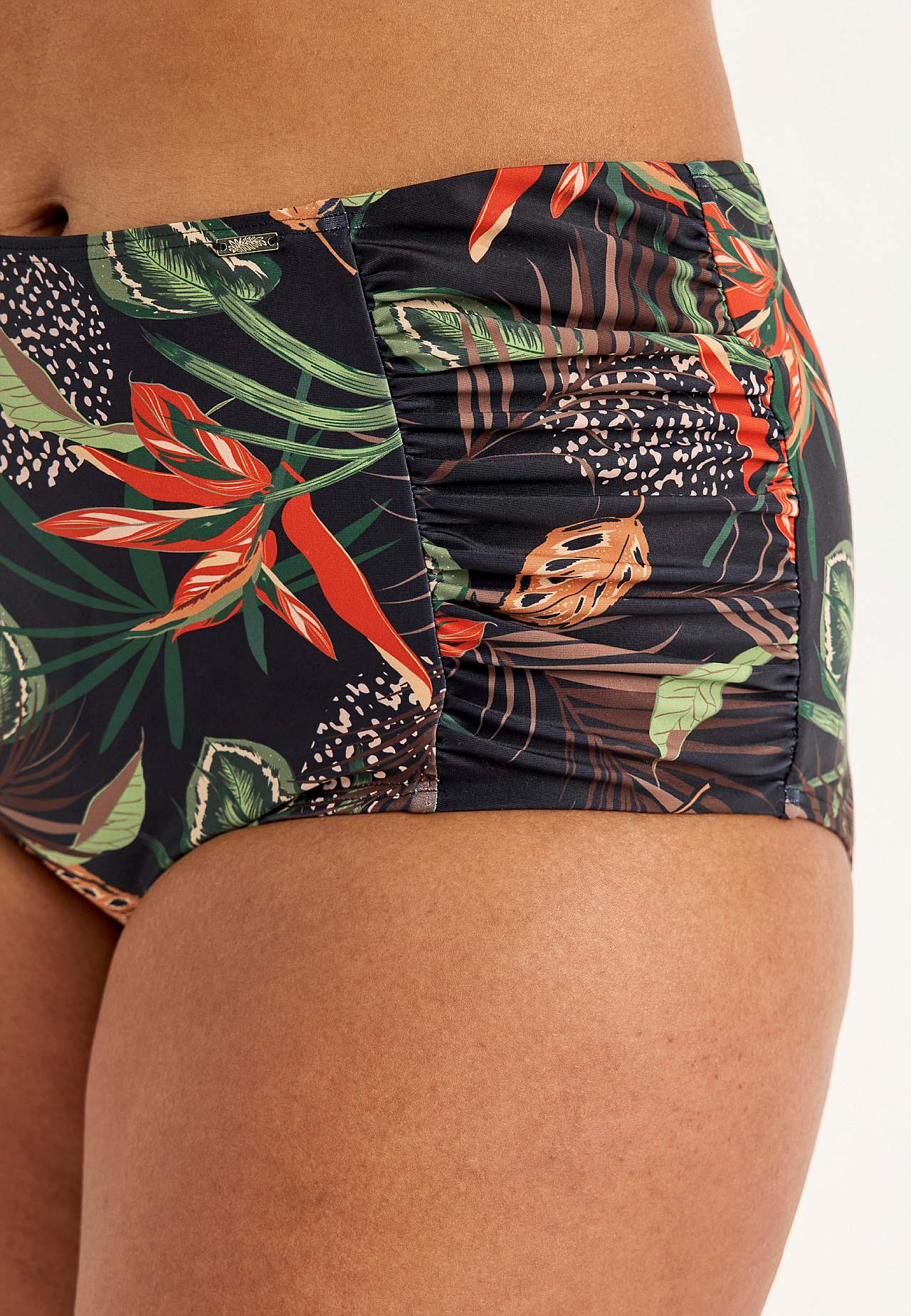 Bikinitrosa i återvunnen polyester. Hög midja. Vackert mönster både fram och bak. Dekorativ drapering i sidorna. Helfodrad insida.