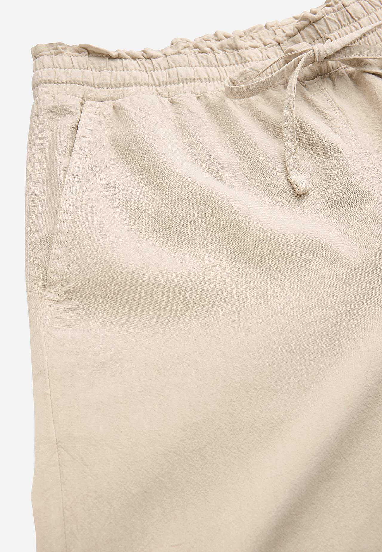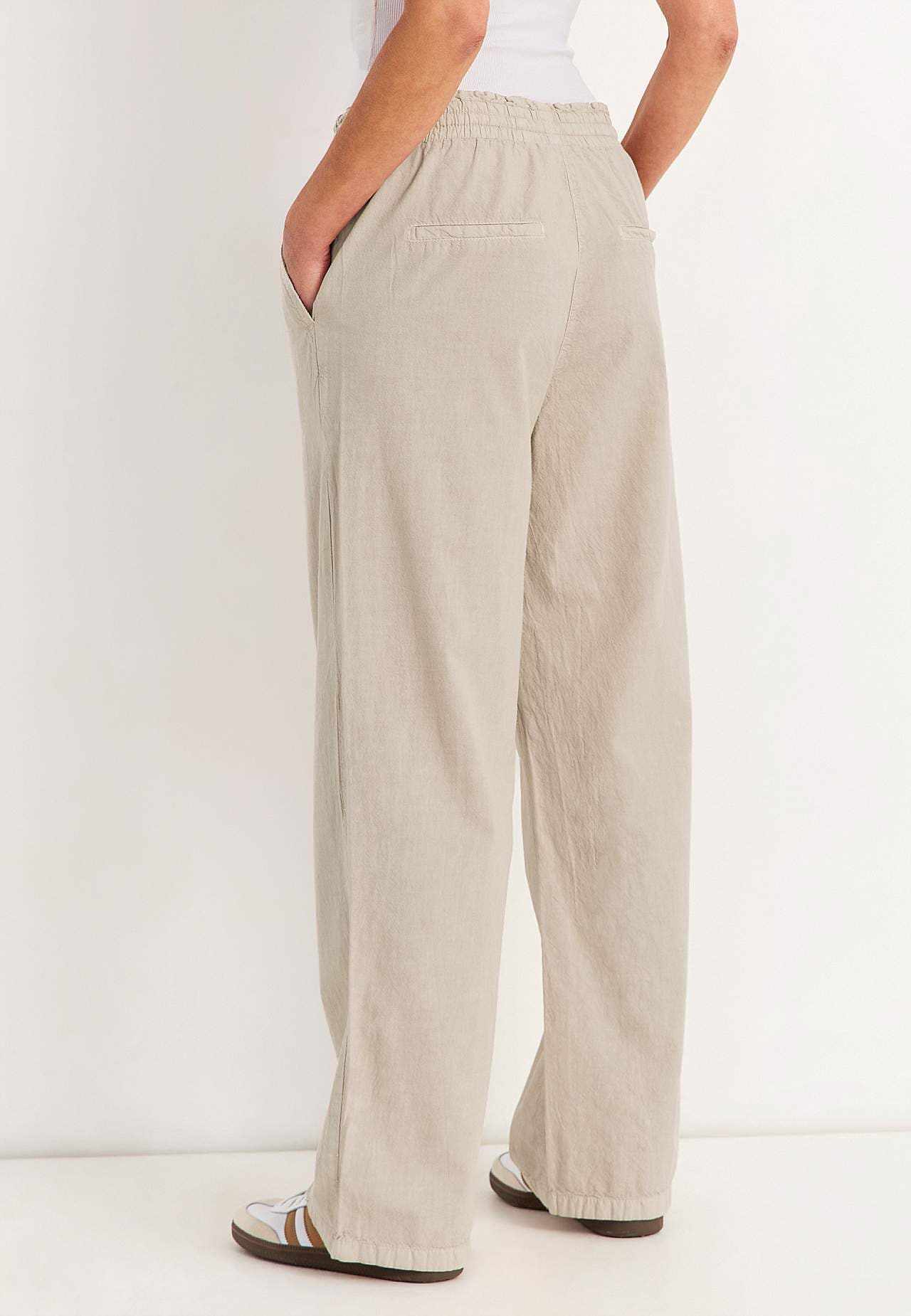 Lång, ledig byxa med avslappnad stil. Vävt material i tvättad, luftig, mjuk bomull med naturlig känsla. Ledig, lös passform. Bekväm, elastisk midja med dragsko. Sneda framfickor. Fuskfickor bak. Vida, raka ben. Innerbenslängd ca 75 cm i alla storlekar. Grenhöjden följer storleken ca 27-37 cm.