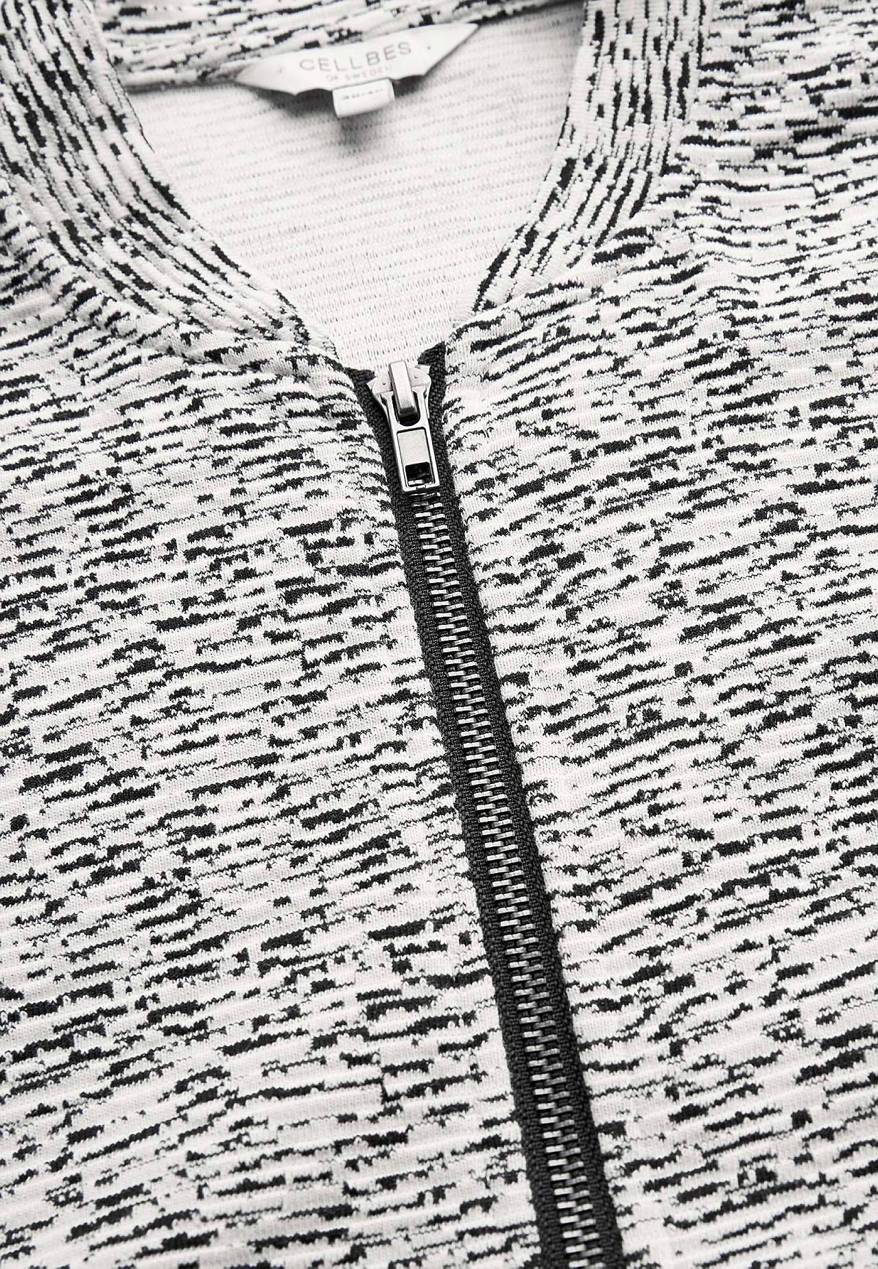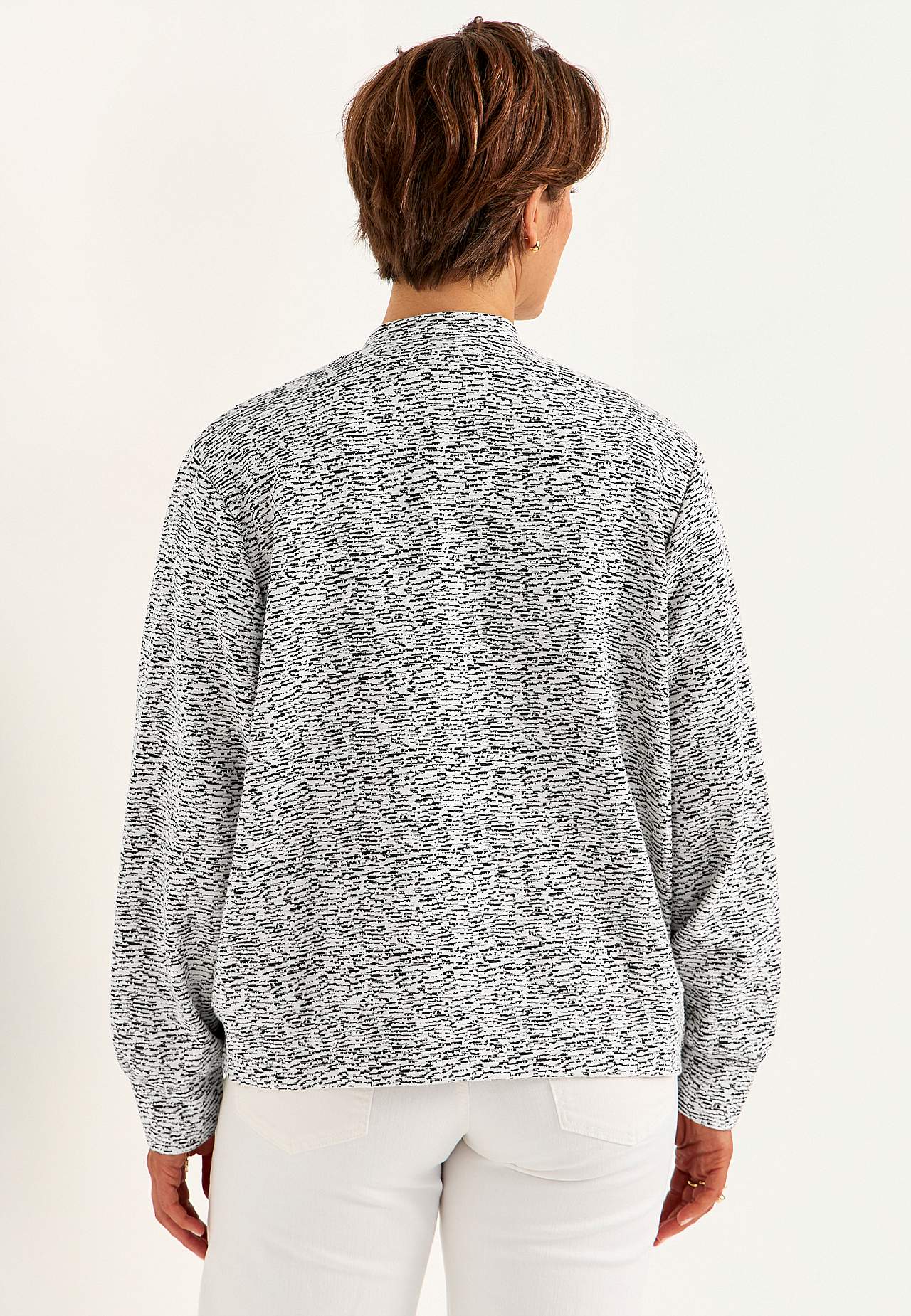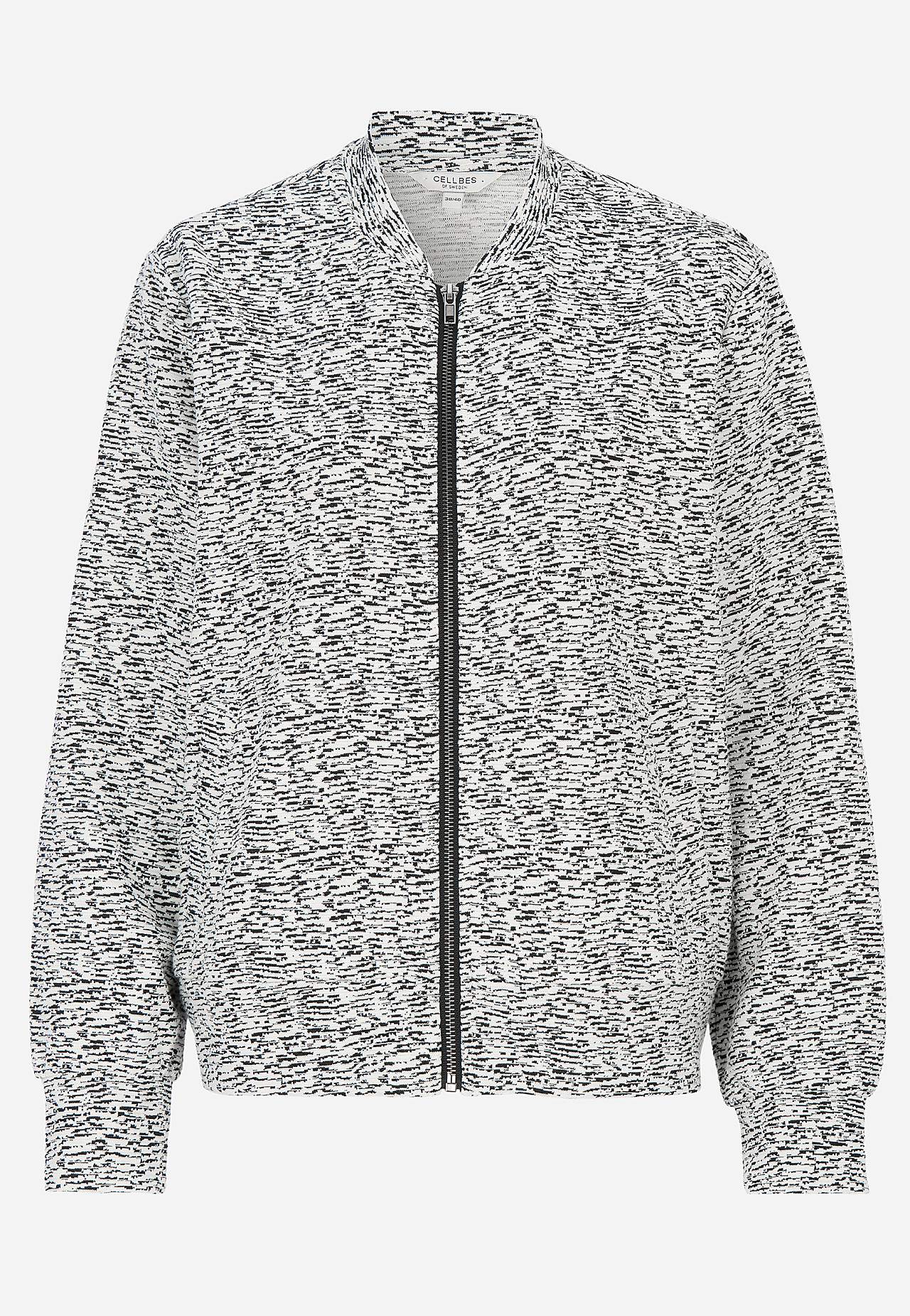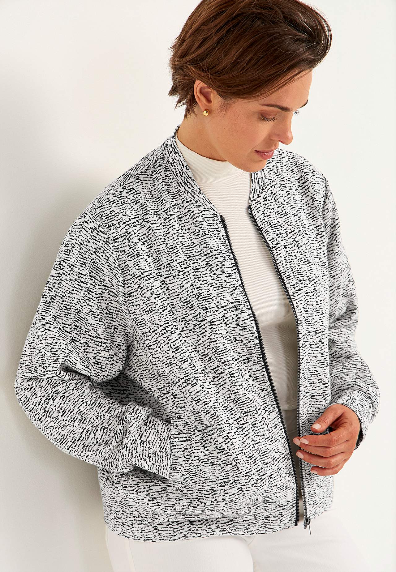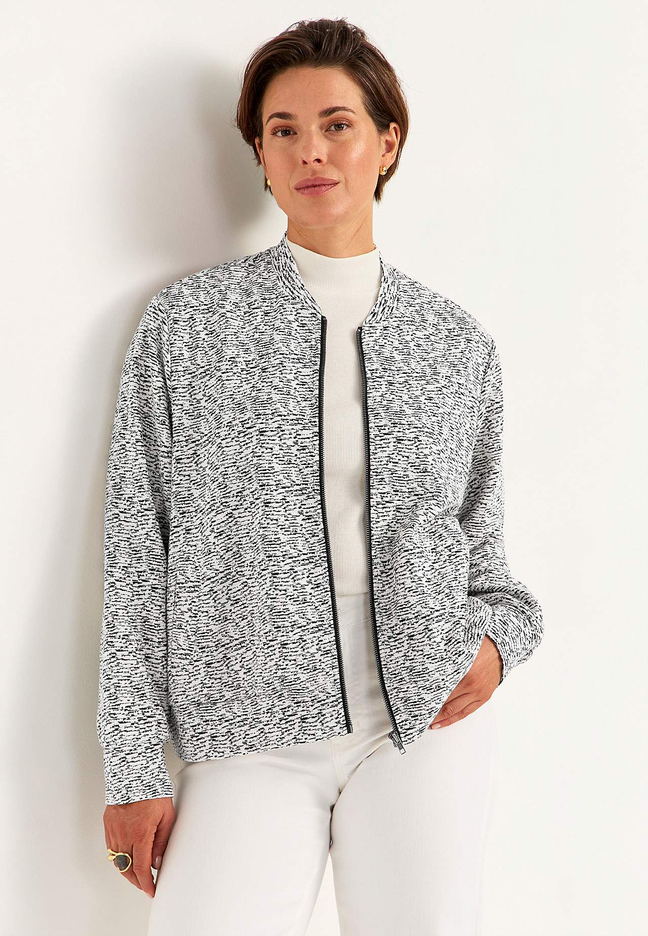 Innejacka i lite kraftigare, mjuk trikå med randig struktur. Lös passform. Låg ståkrage. Dragkedjestängning. Snedställda stolpfickor. Långa ärmar med mudd i ärmsluten. Rakt skuren nederkant med dubbelvikt mudd. Längden följer storleken ca 72-84 cm från axeln.