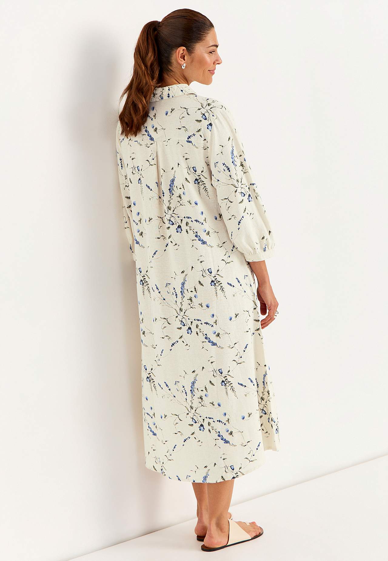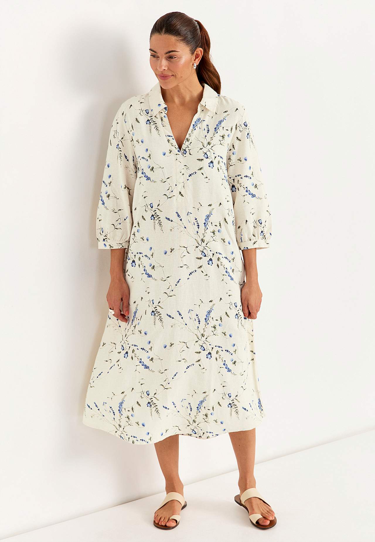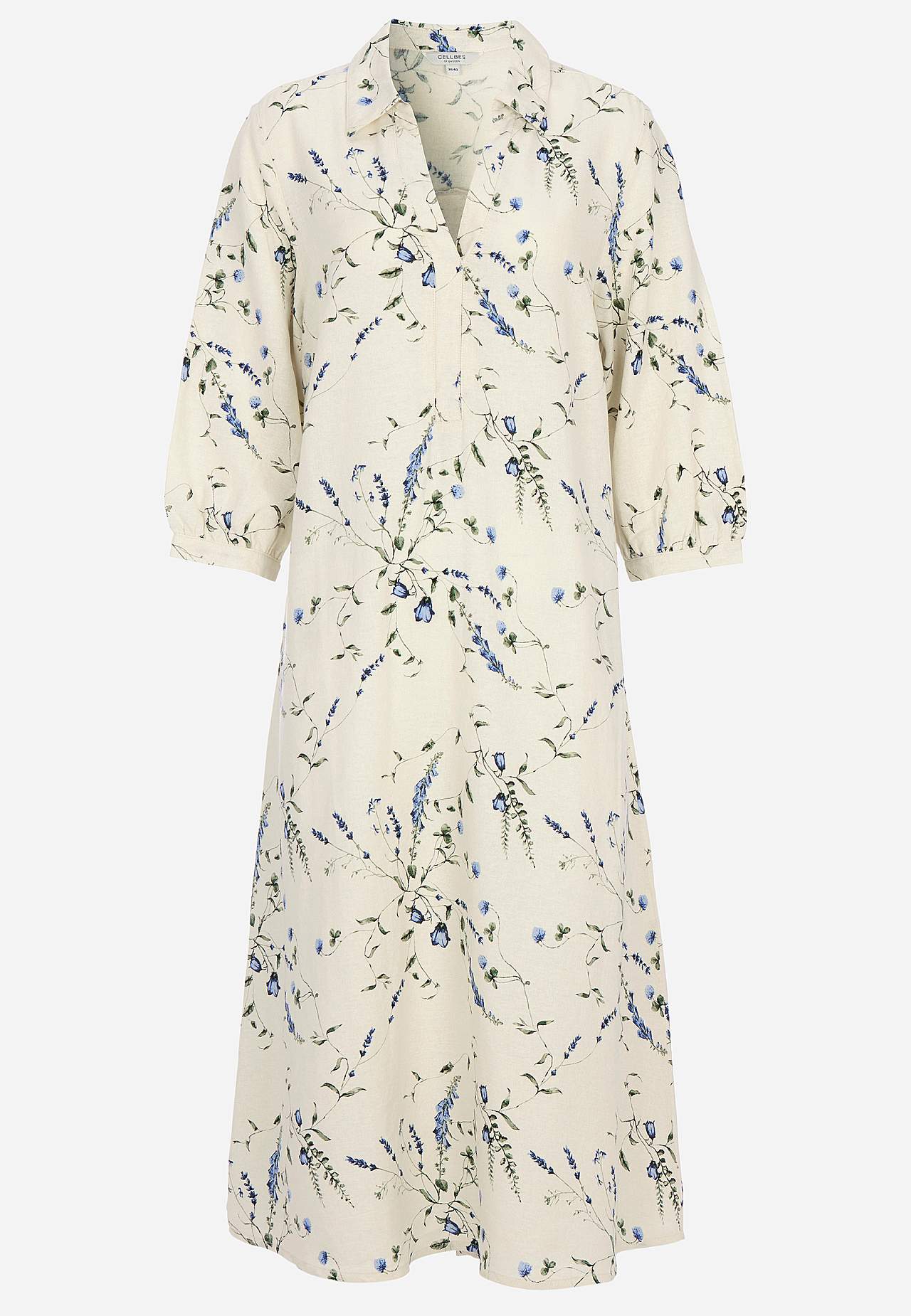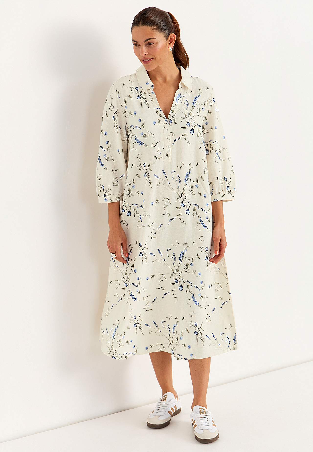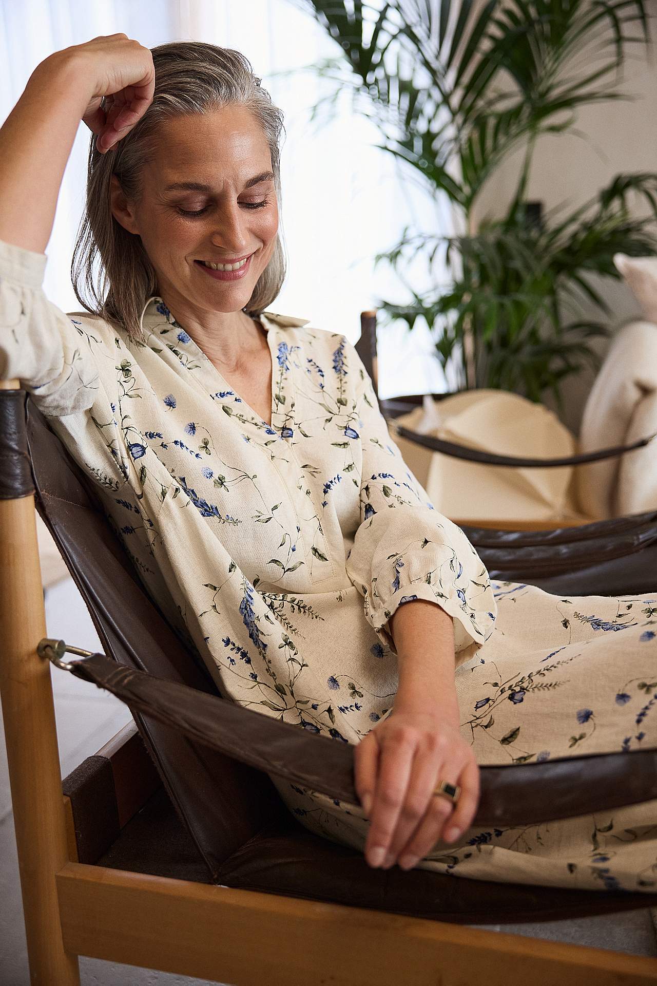 Skön, sval klänning med skirt blommönster. Vävt, luftigt material i mjuk viskos- och linnemix med lätt struktur. Lätt a-linjeformad, ledig passform. Krage och v-ringning. Insnitt vid bysten. Ok baktill med elegant motveck. Ärmar med volym och smal manschett vid ärmsluten. Något rundad nederkant. Rygglängd ca 123 cm i alla ... Läs mer
