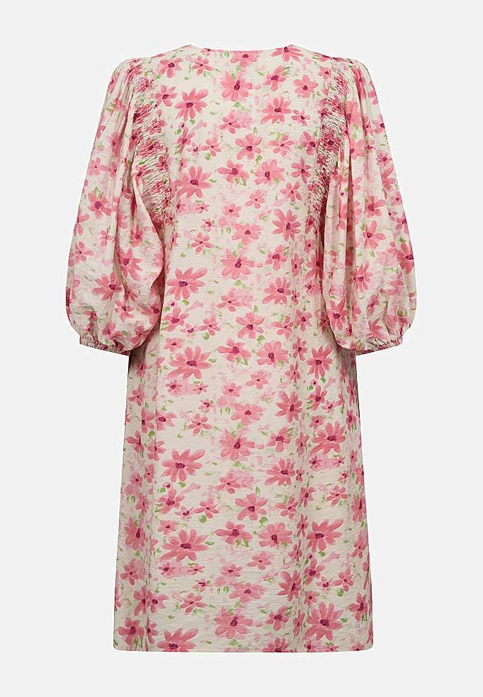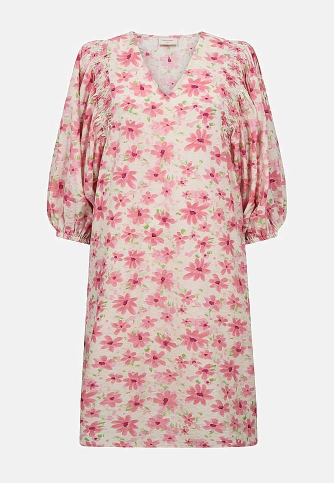 Skön viskosblandning. Ledig passform. 3/4-långa, vida ärmar med resår i ärmsluten. Effektfull smock vid ärmen både fram och bak. Fickor i sidosömmen. Rak nederkant. Längd från axeln ca 100 cm i storlek M (40).