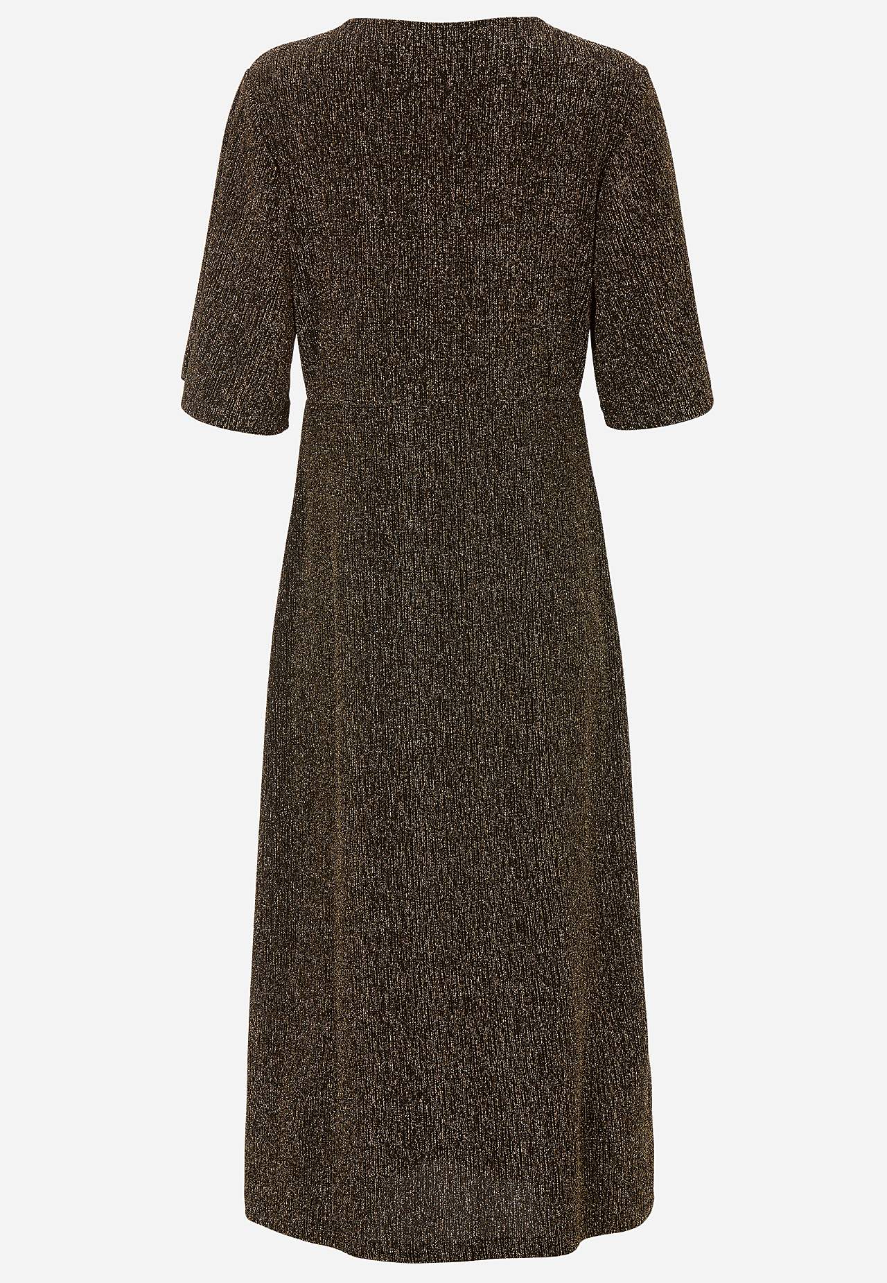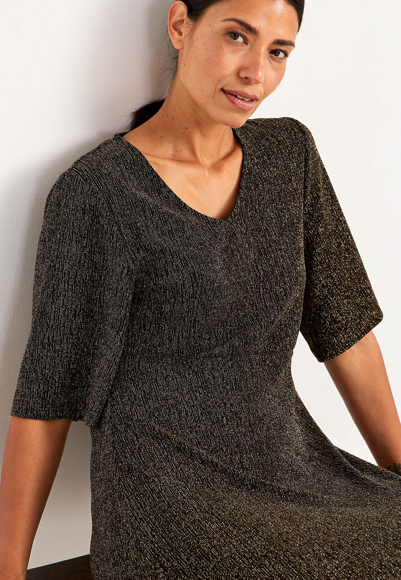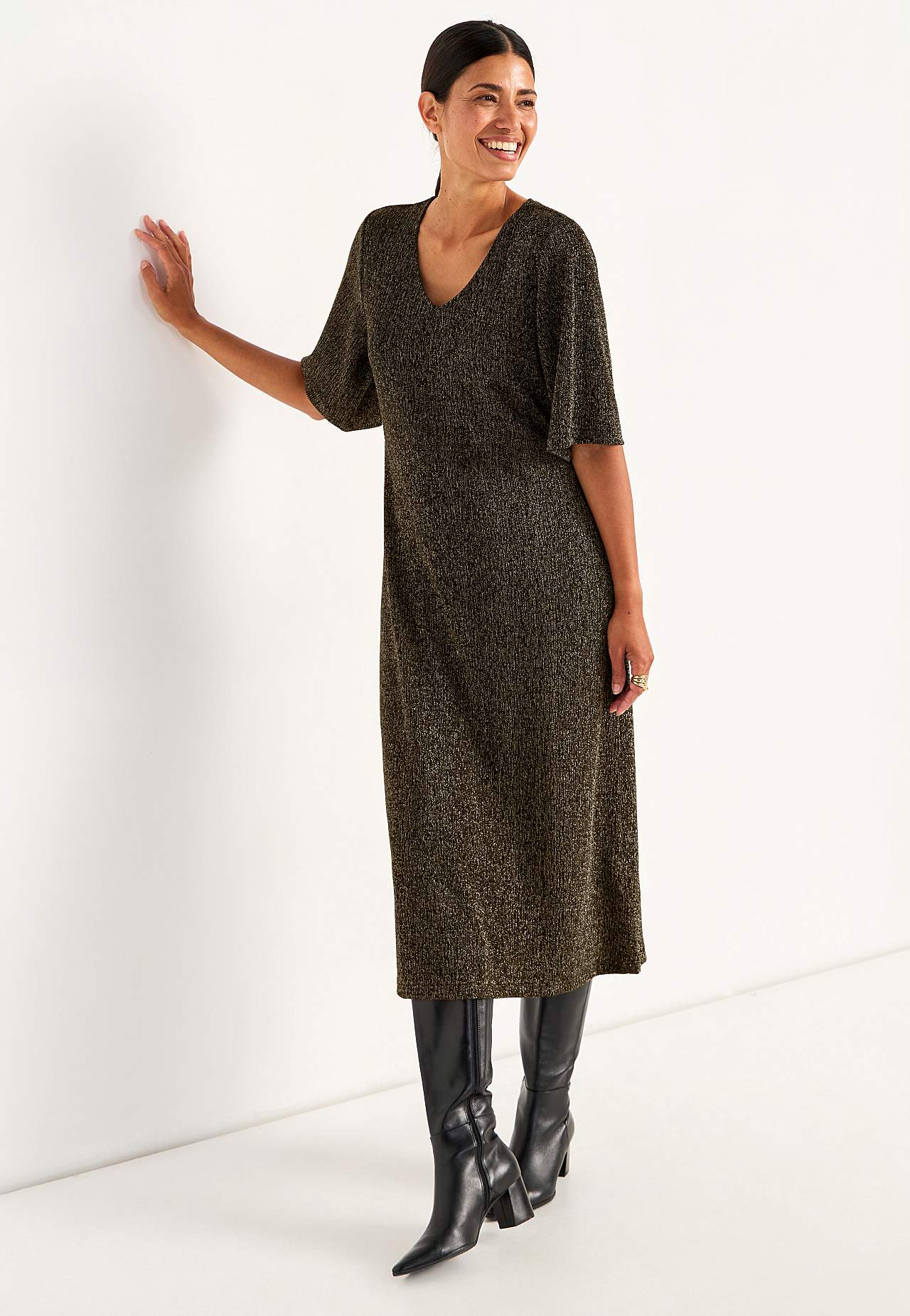 Glittrig trikåklänning perfekt till festligheterna. A-linjeformad passform med avskärning i midjan. Mjukt, stretchigt material med glittertrådar. V-ringad hals. Korta, vida ärmar. Rak nederkant. Längd från axel ca. 121 cm i alla storlekar.