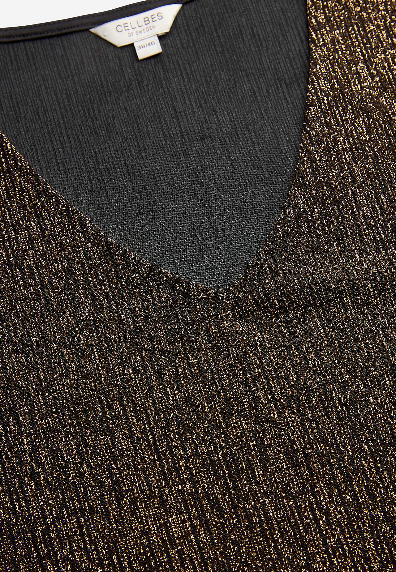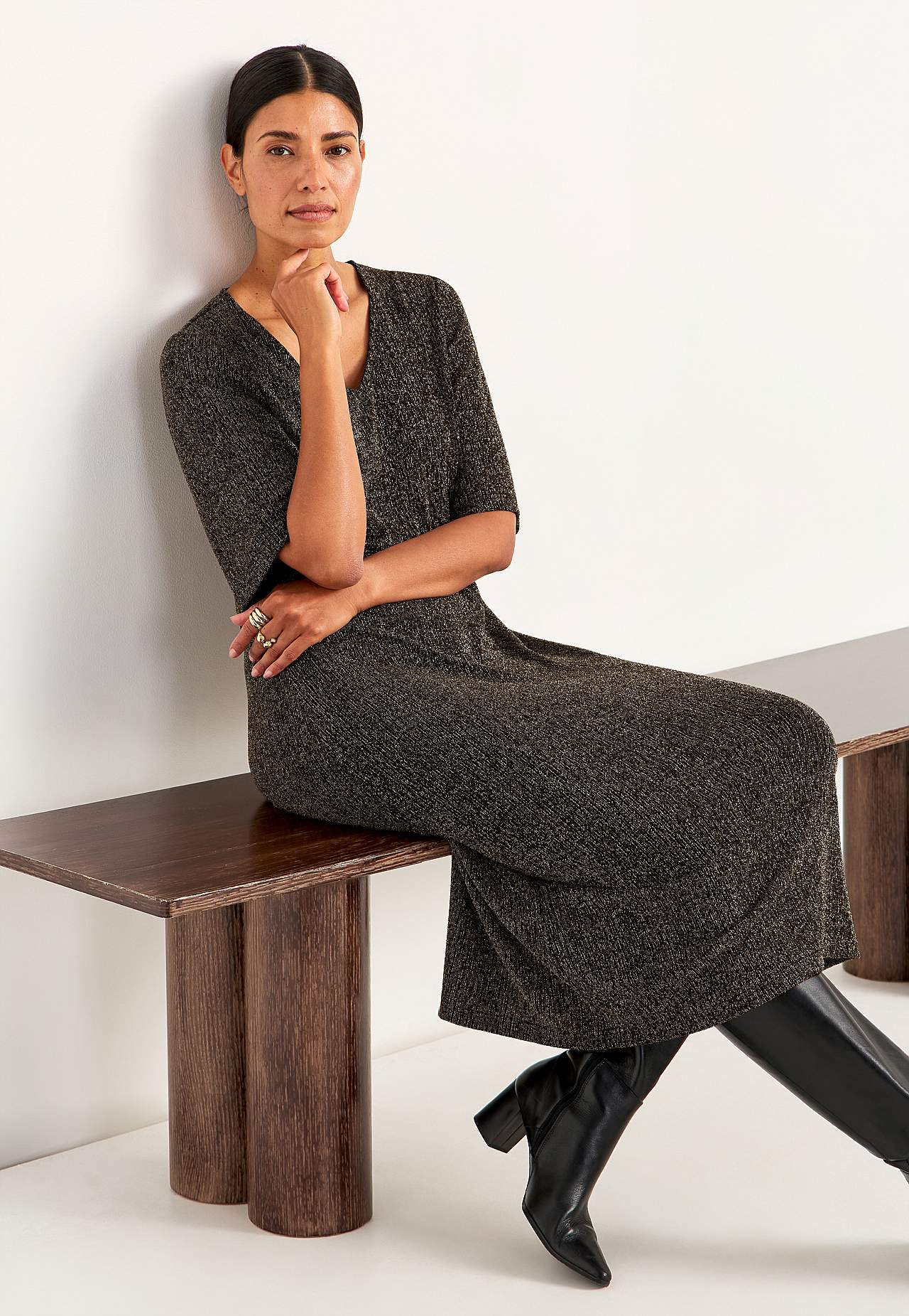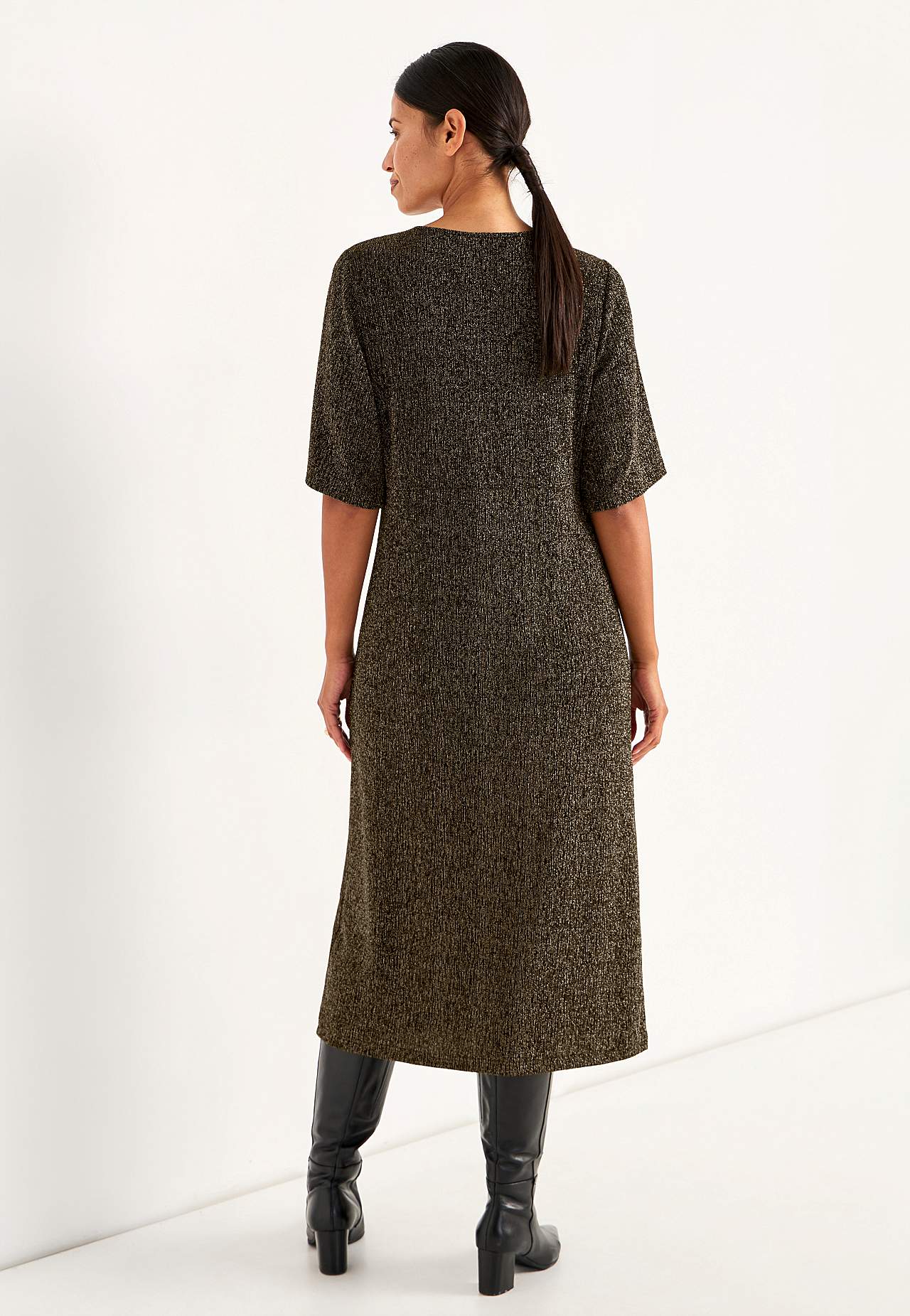 Glittrig trikåklänning perfekt till festligheterna. A-linjeformad passform med avskärning i midjan. Mjukt, stretchigt material med glittertrådar. V-ringad hals. Korta, vida ärmar. Rak nederkant. Längd från axel ca. 121 cm i alla storlekar.
