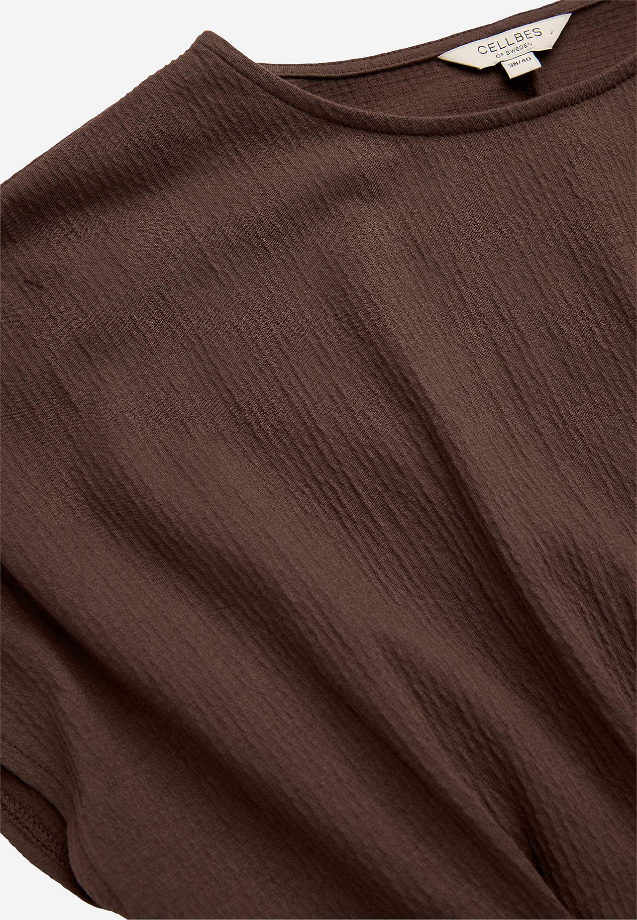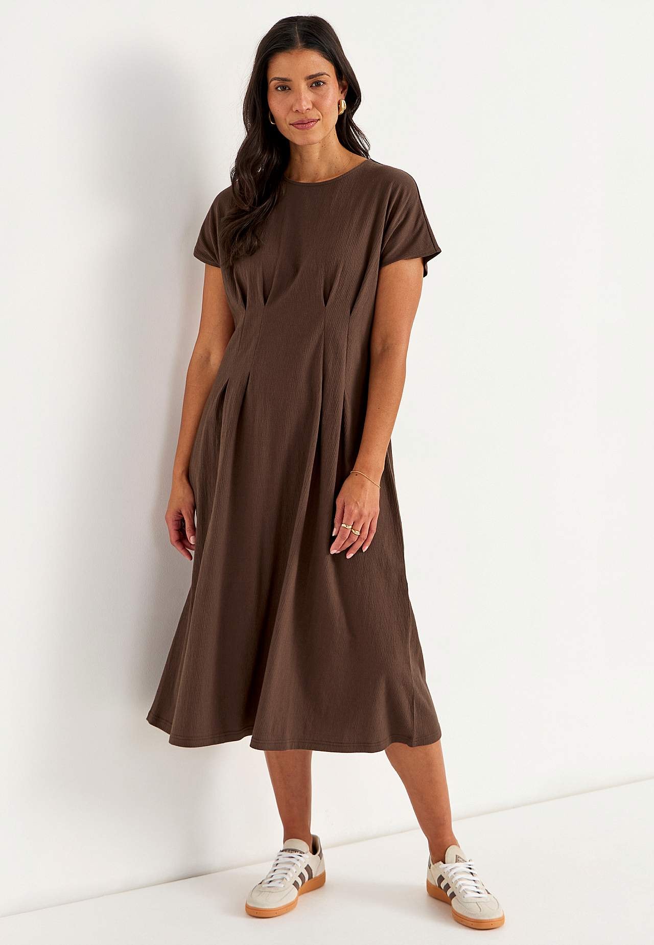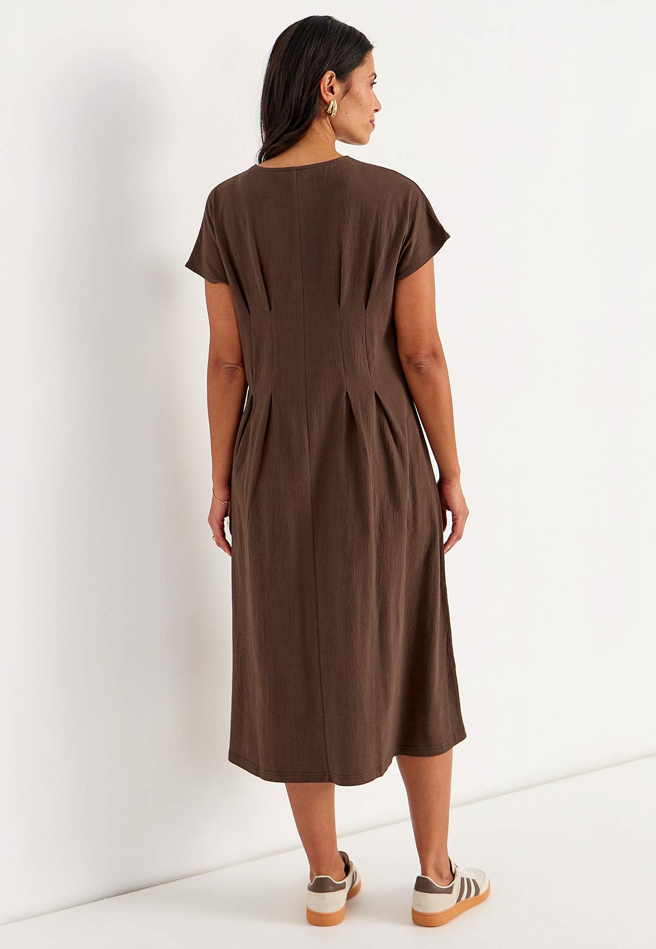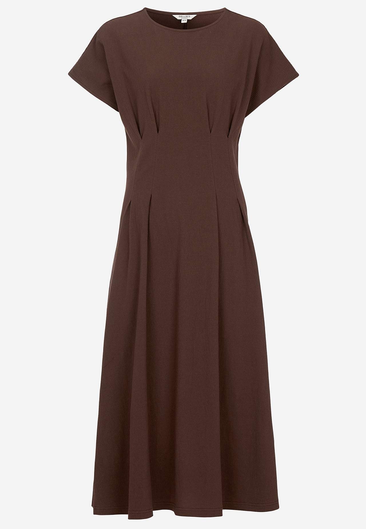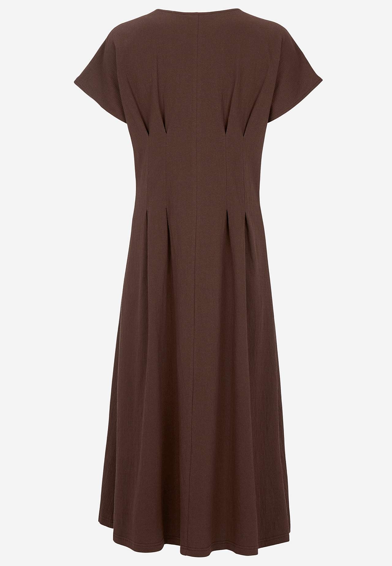 Feminin trikåklänning med vågig struktur. Mjukt, stretchigt material. Normal passform med utsvängd kjoldel. Markerad midja med figursmickrande insnitt både fram och bak. Rundad hals. Korta holkärmar. Lätt rundad nederkant. Rygglängd ca 122 cm i alla storlekar.