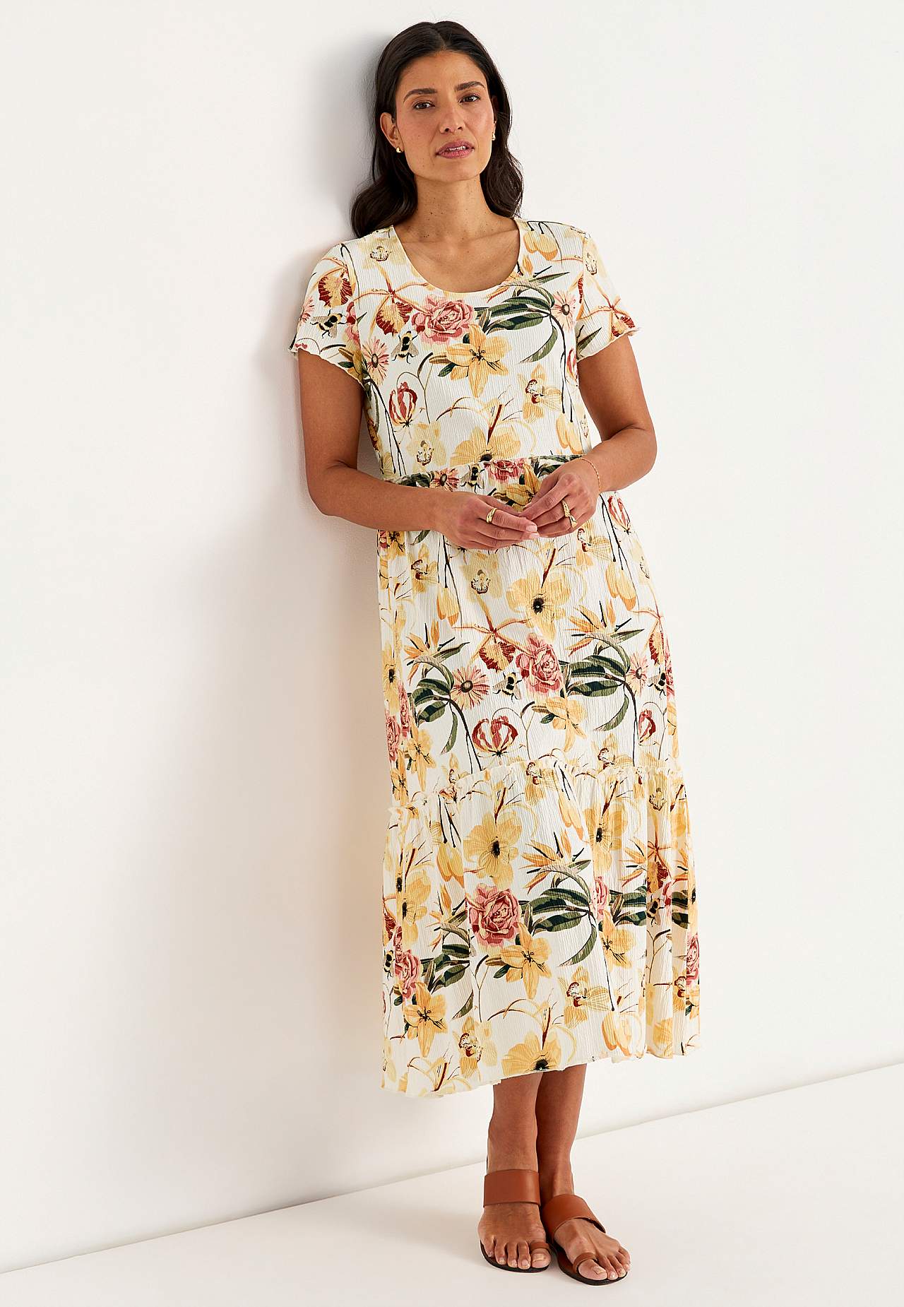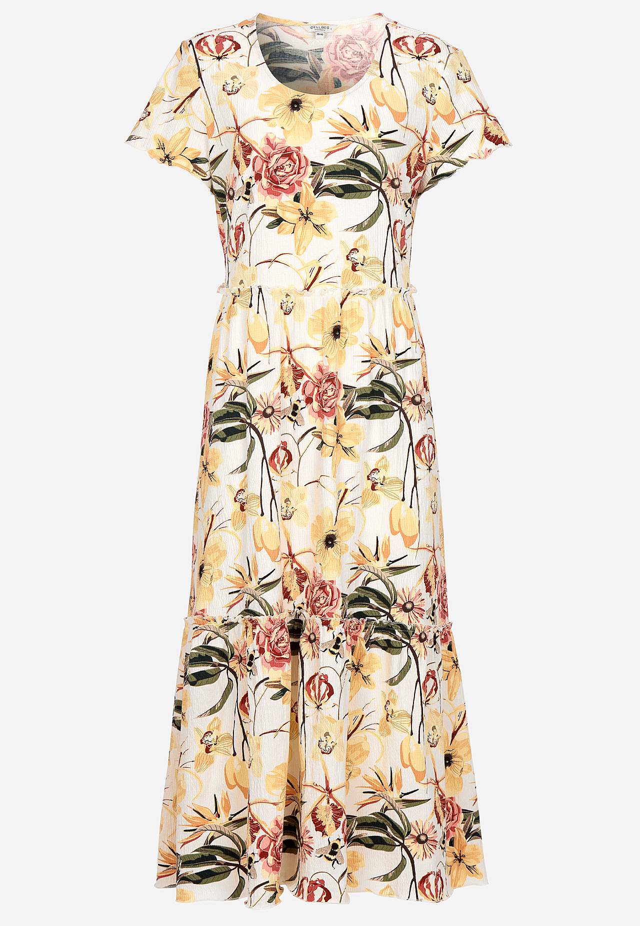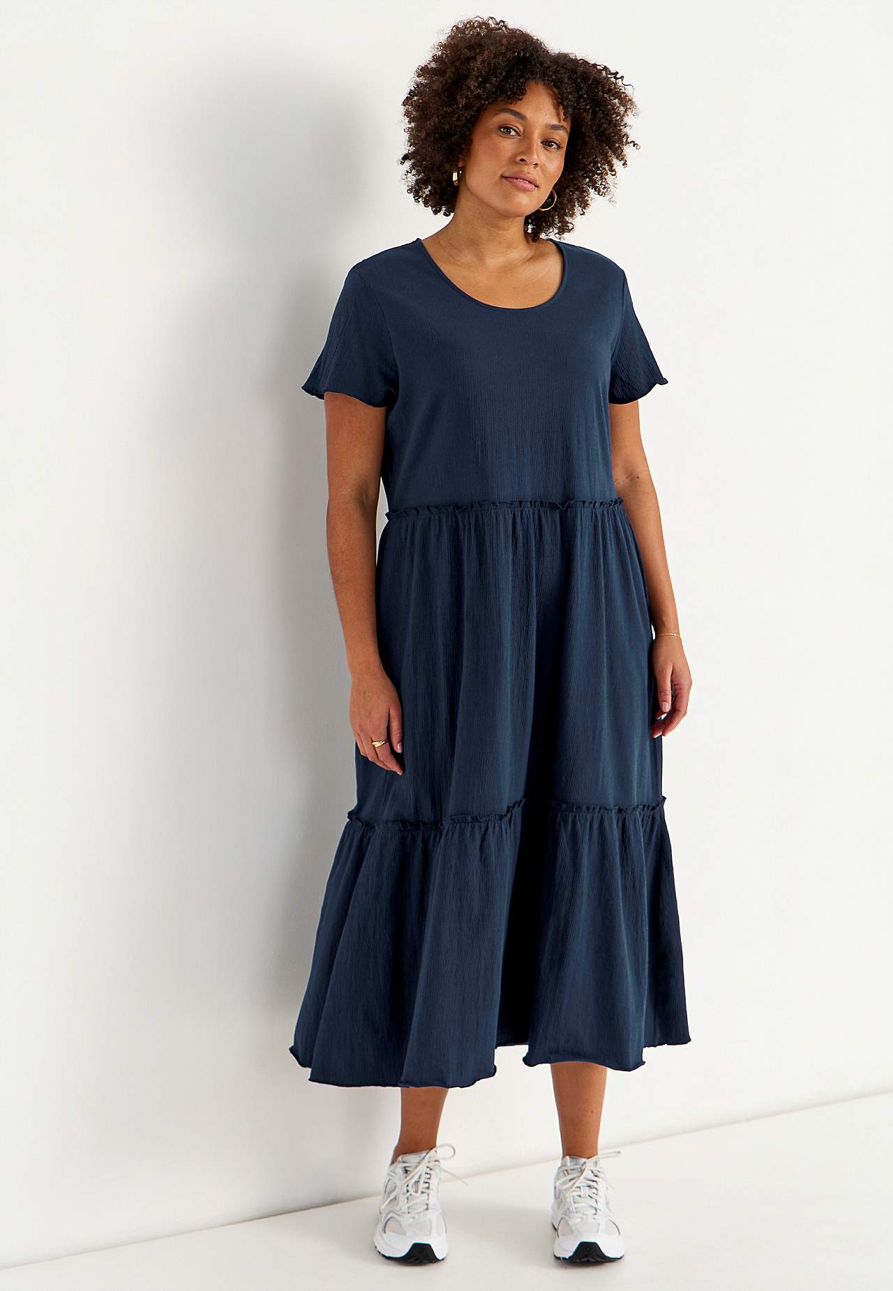 Stretchig, mjuk volangklänning med vågig struktur. Ledig, a-linjeformad passform. Kjoldel med härlig vidd. Overlockad, vågig, smal söm nedtill, på volangkanten och i ärmsluten. Rundad hals. Korta holkärmar. Lätt rundad nederkant. Rygglängd ca 128 cm i alla storlekar.