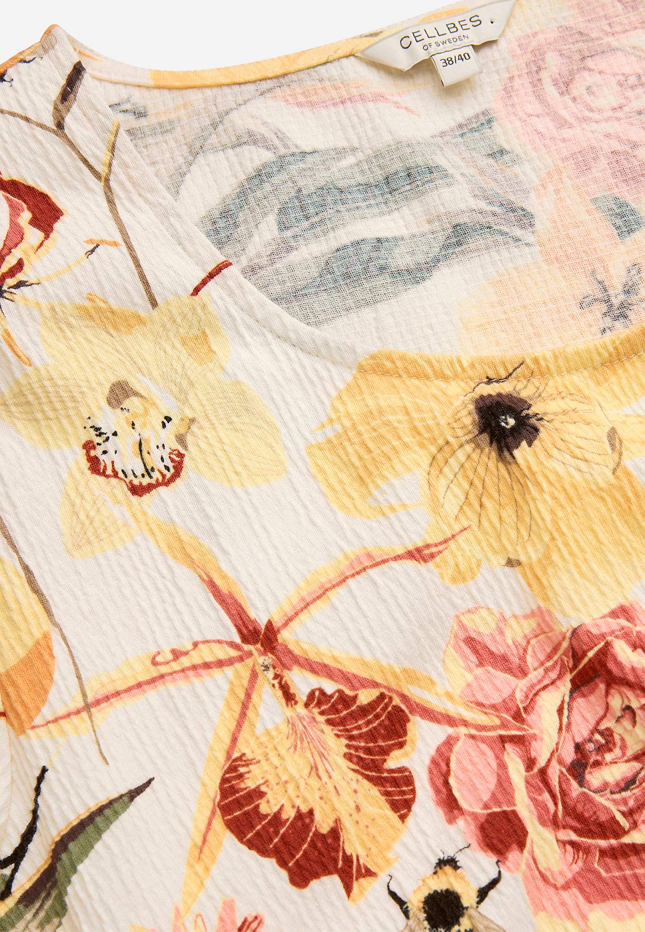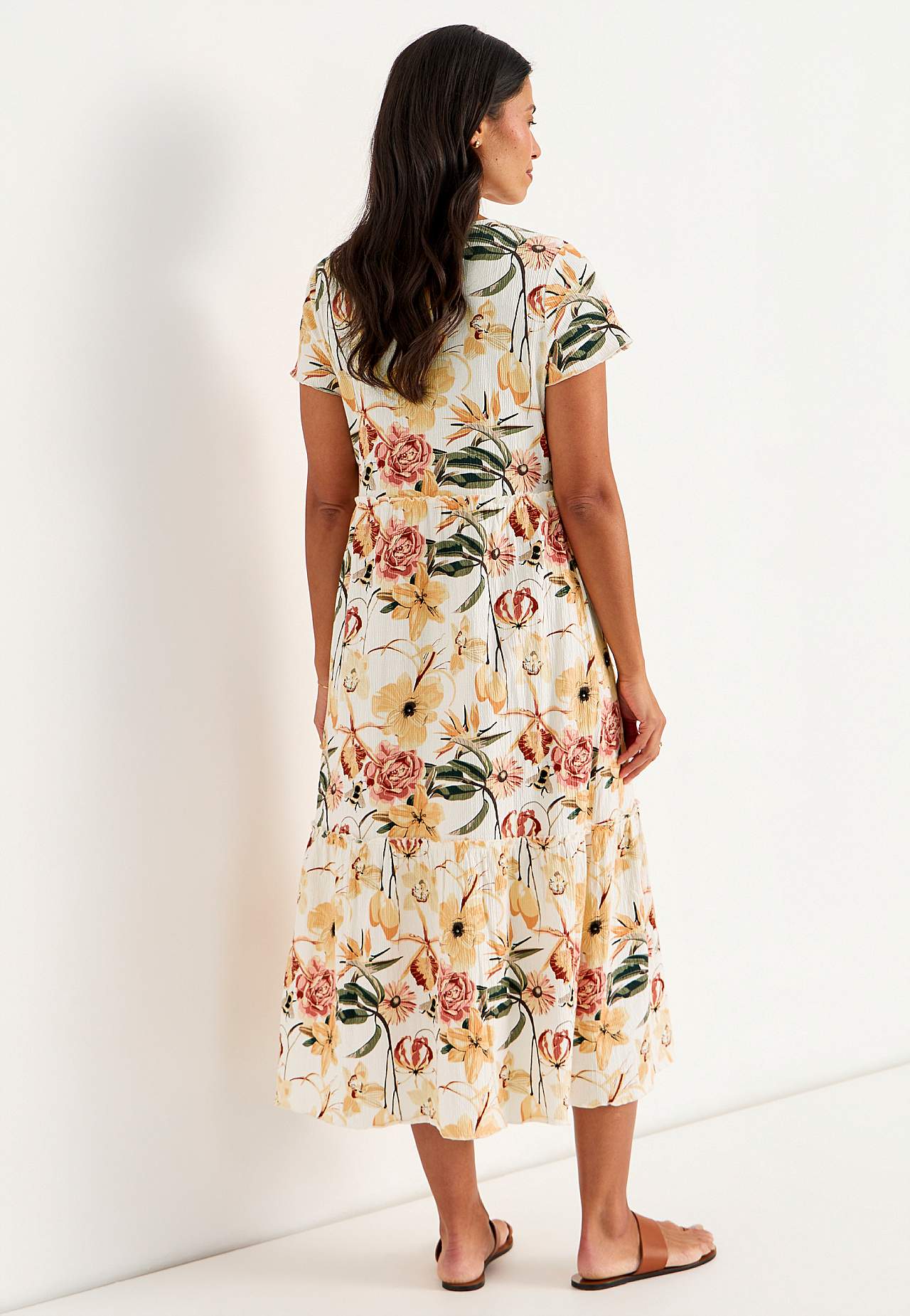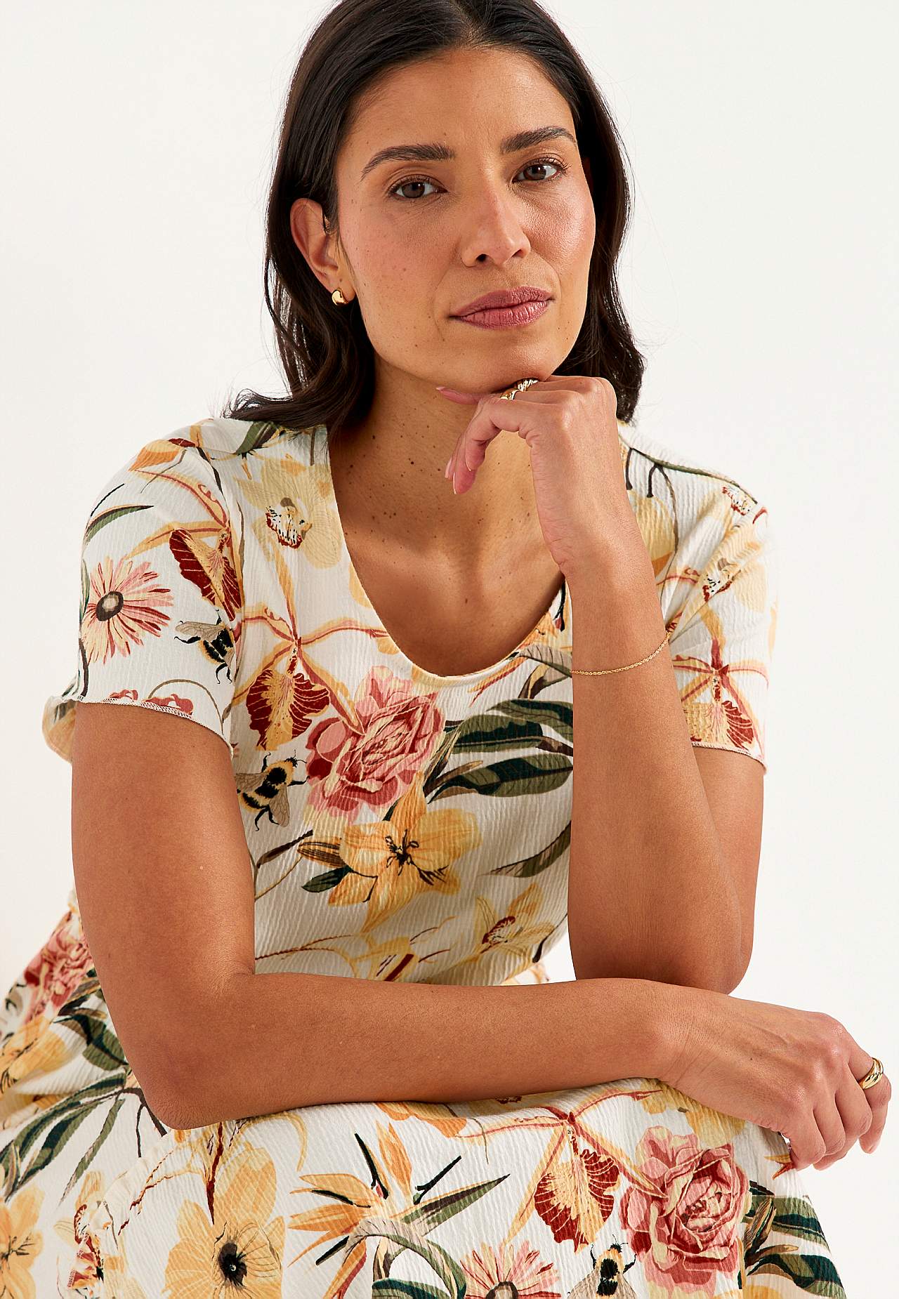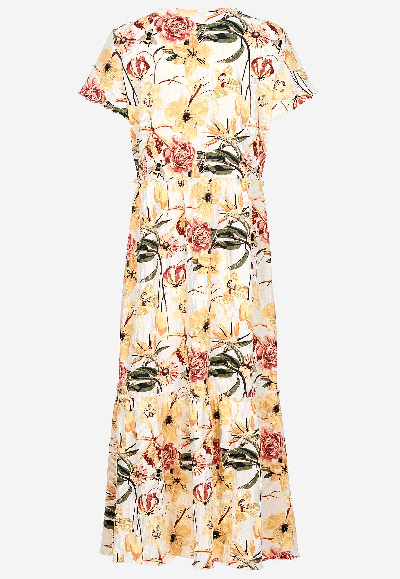Stretchig, mjuk volangklänning med vågig struktur. Ledig, a-linjeformad passform. Kjoldel med härlig vidd. Overlockad, vågig, smal söm nedtill, på volangkanten och i ärmsluten. Rundad hals. Korta holkärmar. Lätt rundad nederkant. Rygglängd ca 128 cm i alla storlekar.