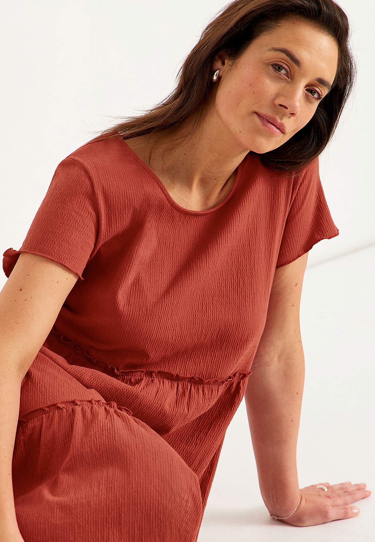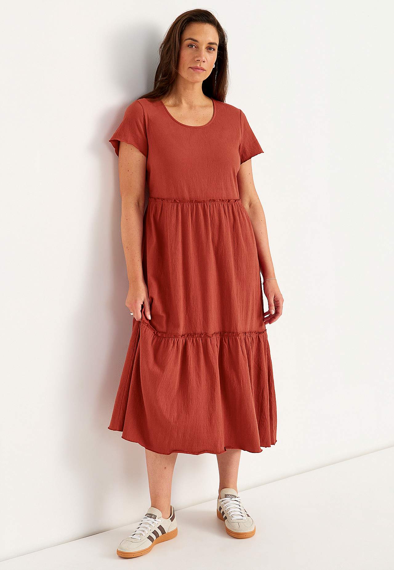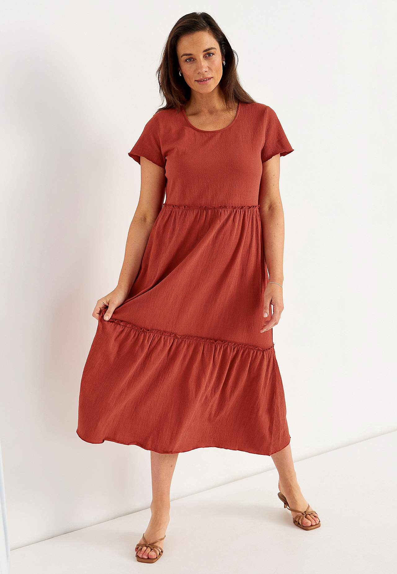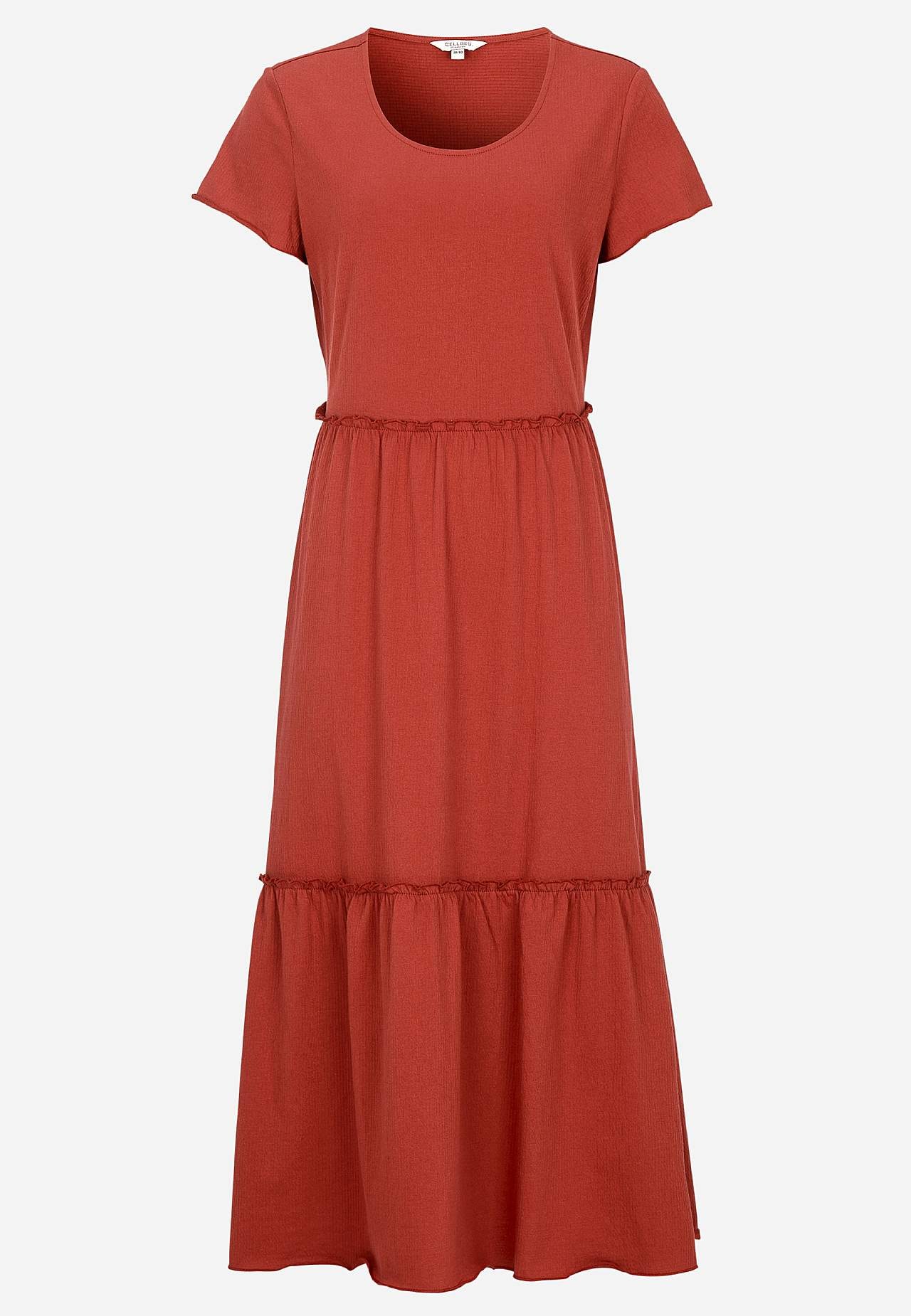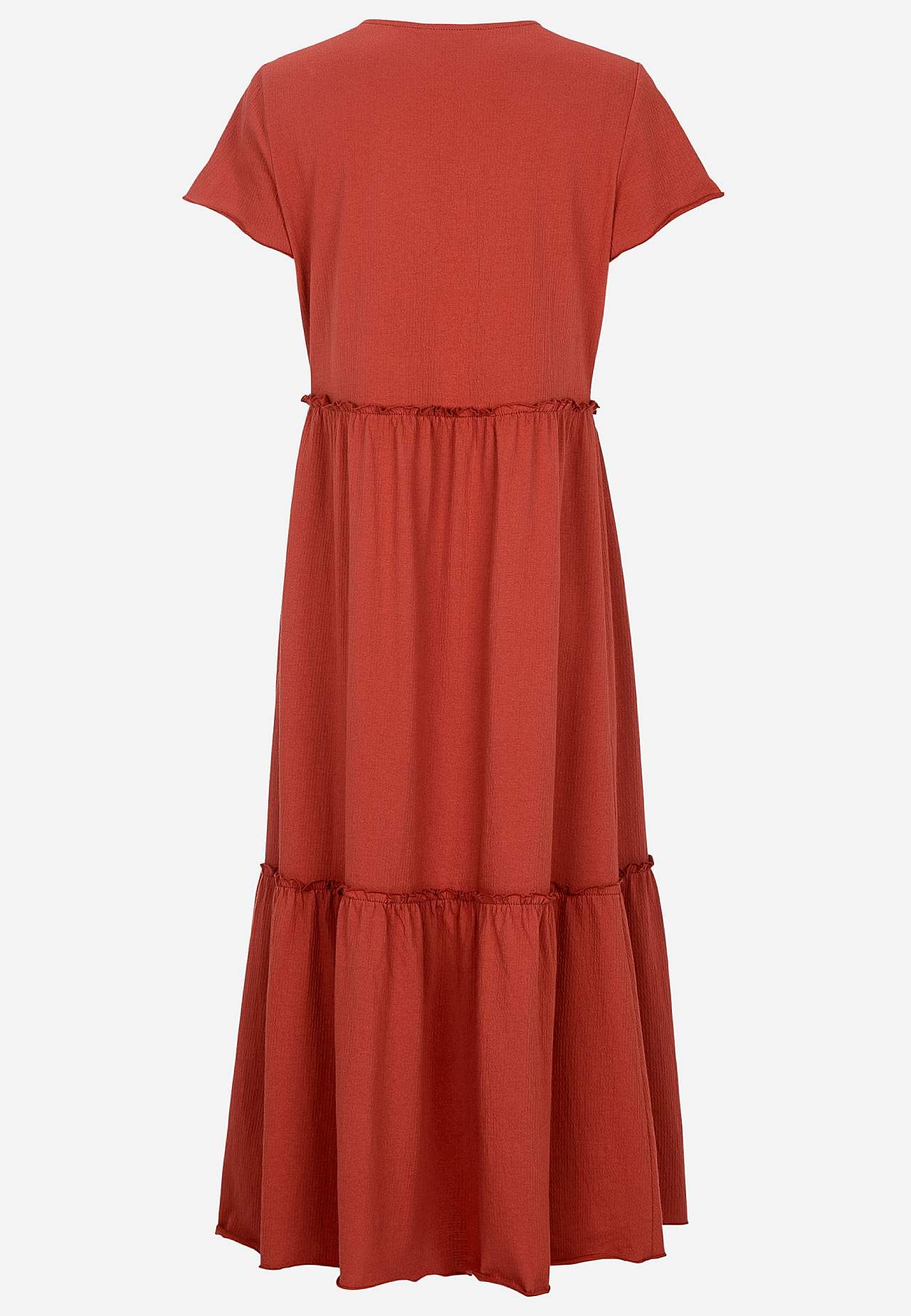 Stretchig, mjuk volangklänning med vågig struktur. Ledig, a-linjeformad passform. Kjoldel med härlig vidd. Overlockad, vågig, smal söm nedtill, på volangkanten och i ärmsluten. Rundad hals. Korta holkärmar. Lätt rundad nederkant. Rygglängd ca 128 cm i alla storlekar.