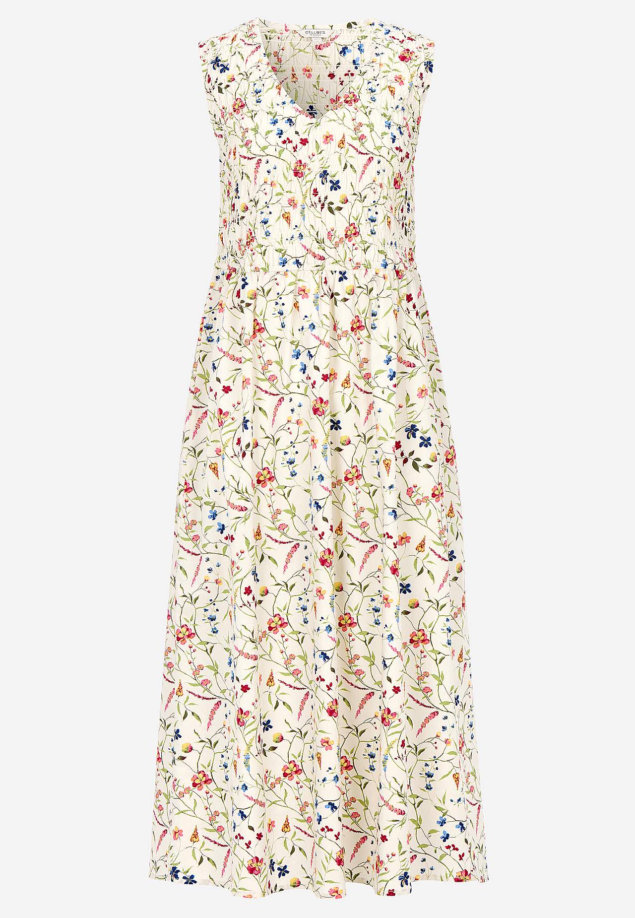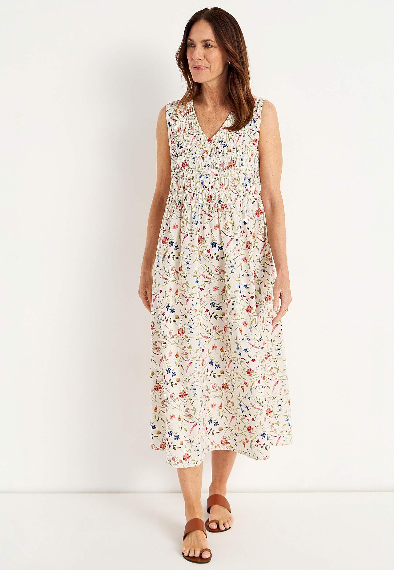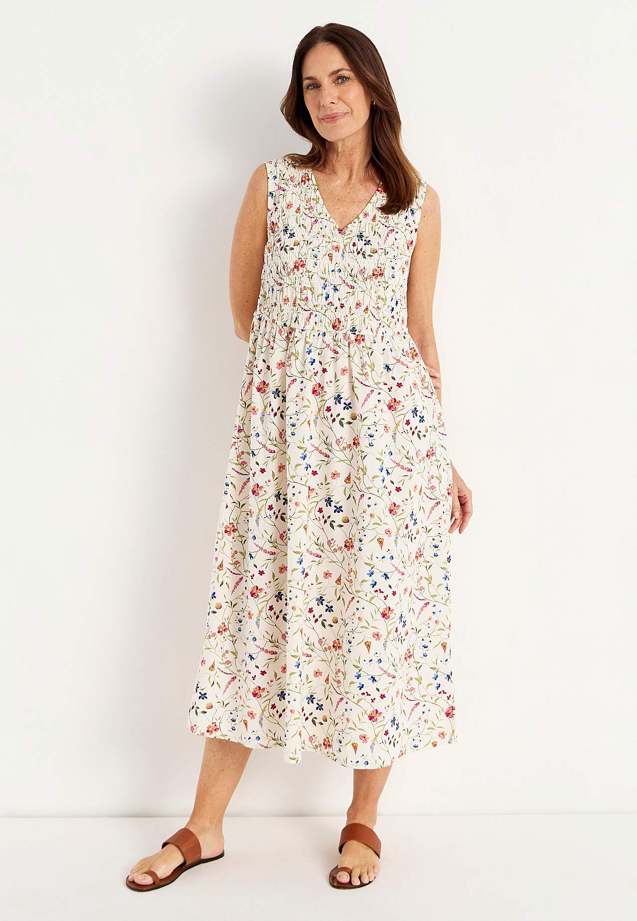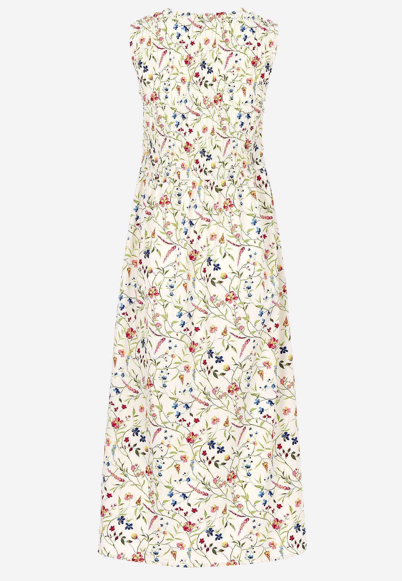 Smockklänning för sommarens fester. Härlig, ärmlös klänning med smock upptill. Mjukt, svalt poplin-tyg med slät yta och lätt, stabil känsla. Smockad överdel med flexibel, smickrande passform och ledig vidd nedtill. V-ringad hals. Rynk i midjan. Lätt rundad nederkant. Rygglängd ca 128 cm i alla storlekar.