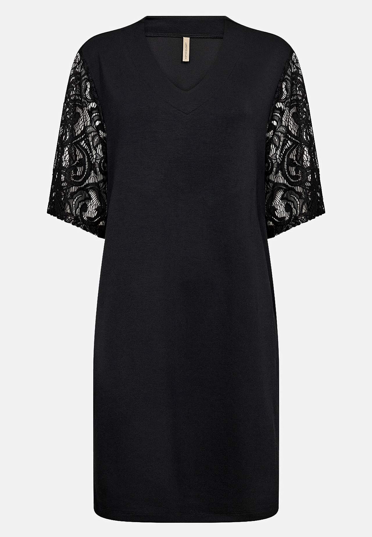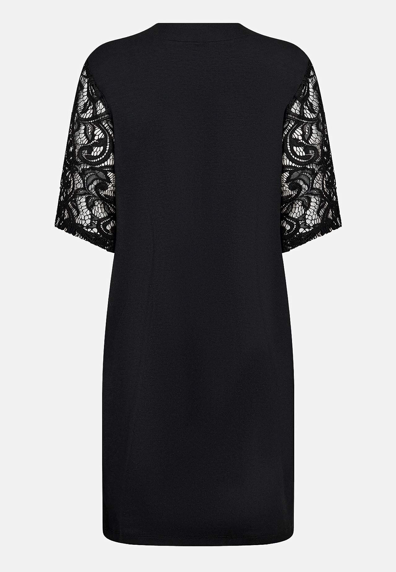 Klänning i härligt mjuk modalmix och något kraftigare trikå. Rak passform. Kort modell. V-ringning. Sidfickor. Eleganta spetsärmar. Trekvartslånga ärmar. Rak nederkant. Längd från axeln ca 98 cm i storlek S (38).