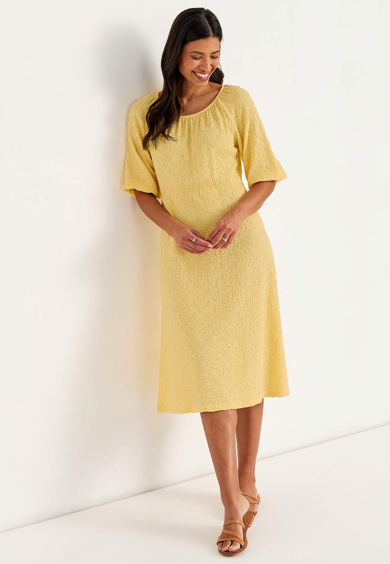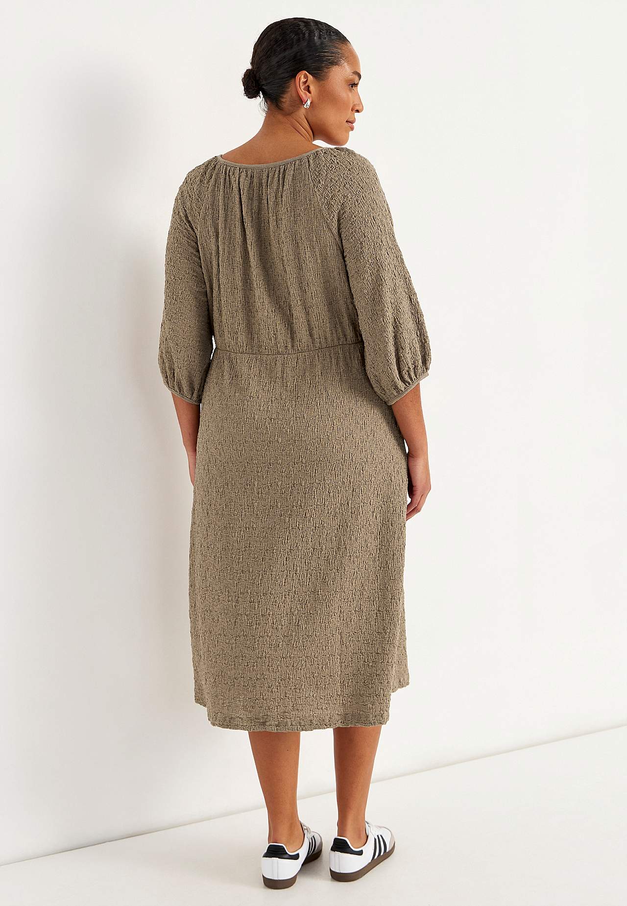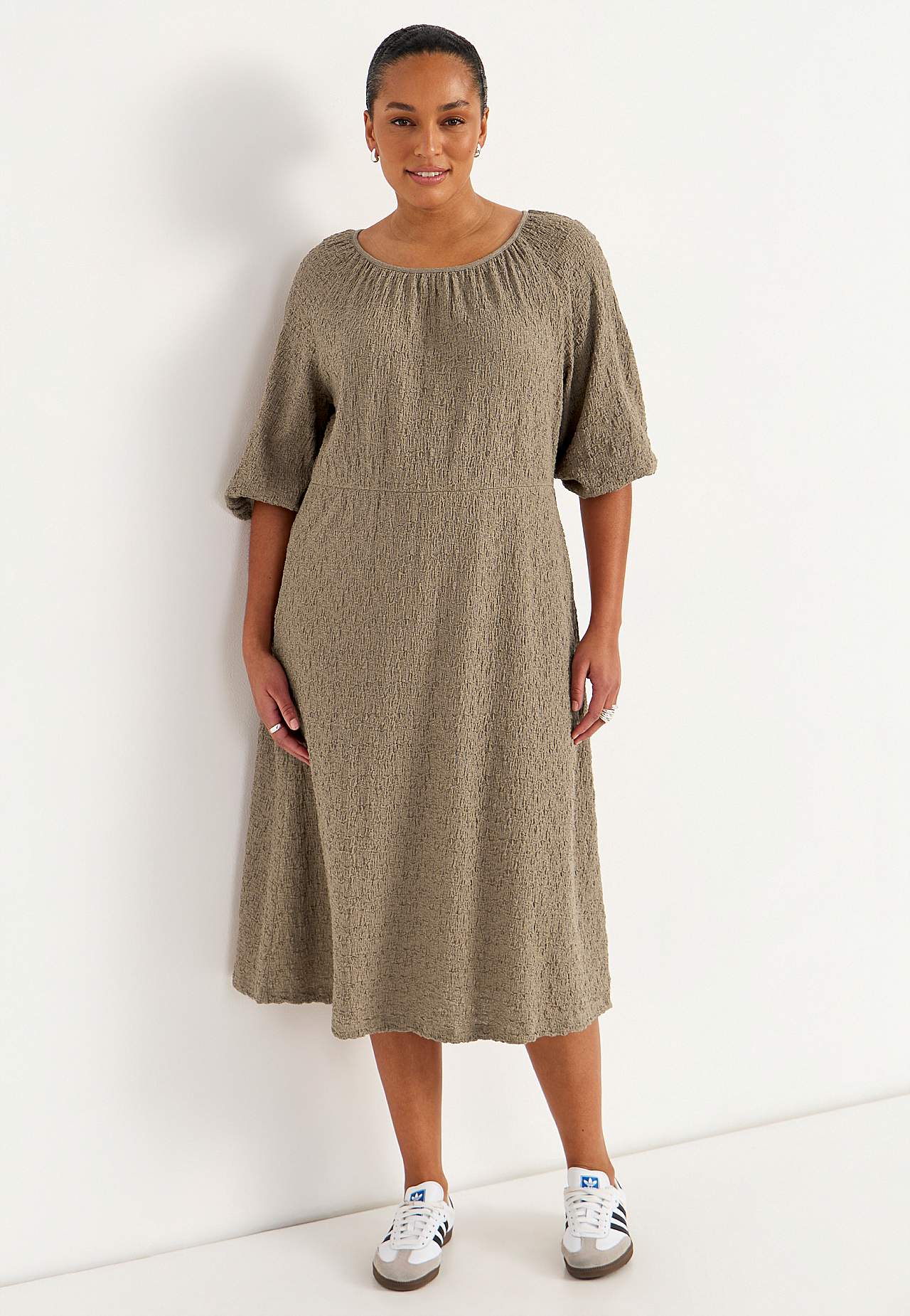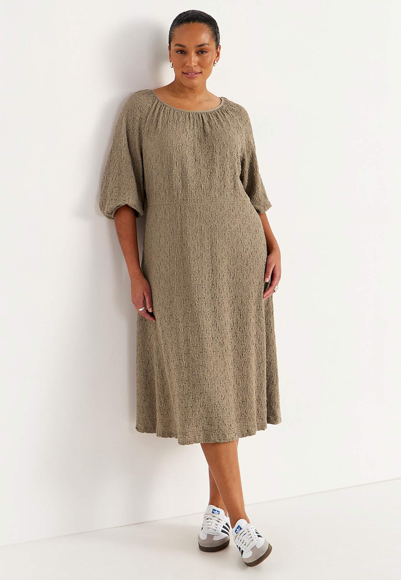 Klänning i skön, stretchig bomullsmix med struktur. Normal passform. Något snävare upptill med en mer utsvängd kjoldel. Rund, vid halsringning med rynk runt om. 3/4-långa, vida raglanärmar med rynk och smalt kantband vid ärmsluten. Avskärning i midjan med dold resårsöm och rynk bak. Rak nederkant. Rygglängd ca 117 cm i alla... Läs mer