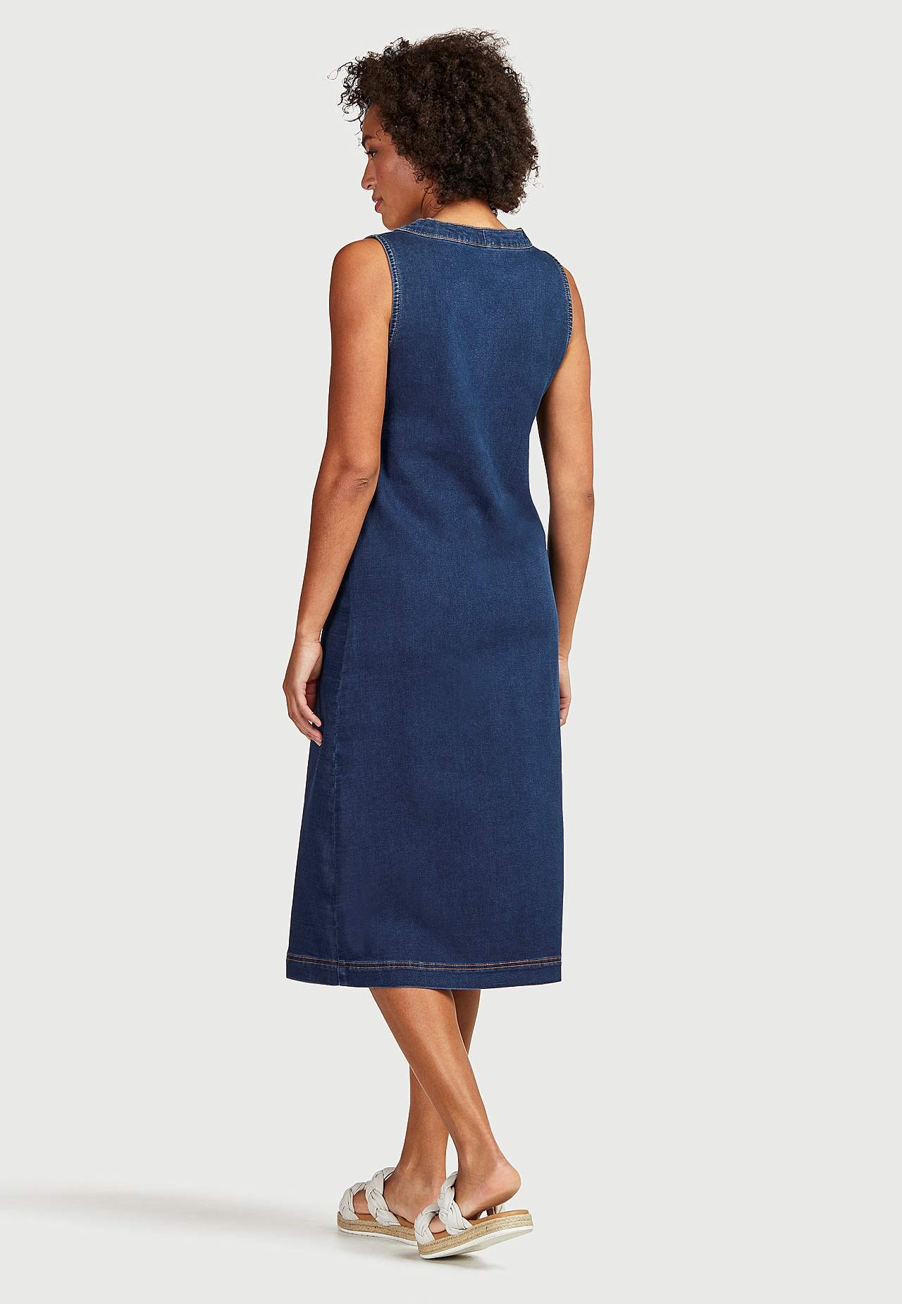 Stretchig, ärmlös jeansklänning med v-ringning, knappar framtill och insnitt vid bysten. Mjuk denim i följsam trikå. Längden följer storleken ca 119-130 cm från axeln bak.