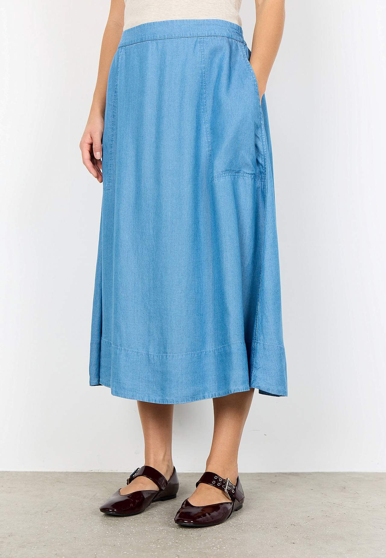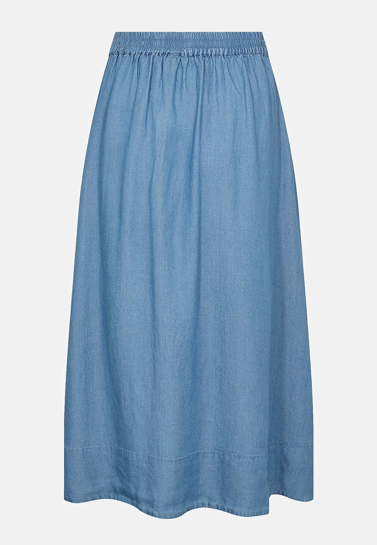 Vävd kjol i denim. Fantastiskt mjukt och luftigt lyocell-material. A-linjeformad passform med härlig vidd nedtill. Midja med resår bak. Stora fickor framtill. Lätt rundad nederkant med fin detaljsöm. Matcha gärna med 703470. Längd: 79 cm.