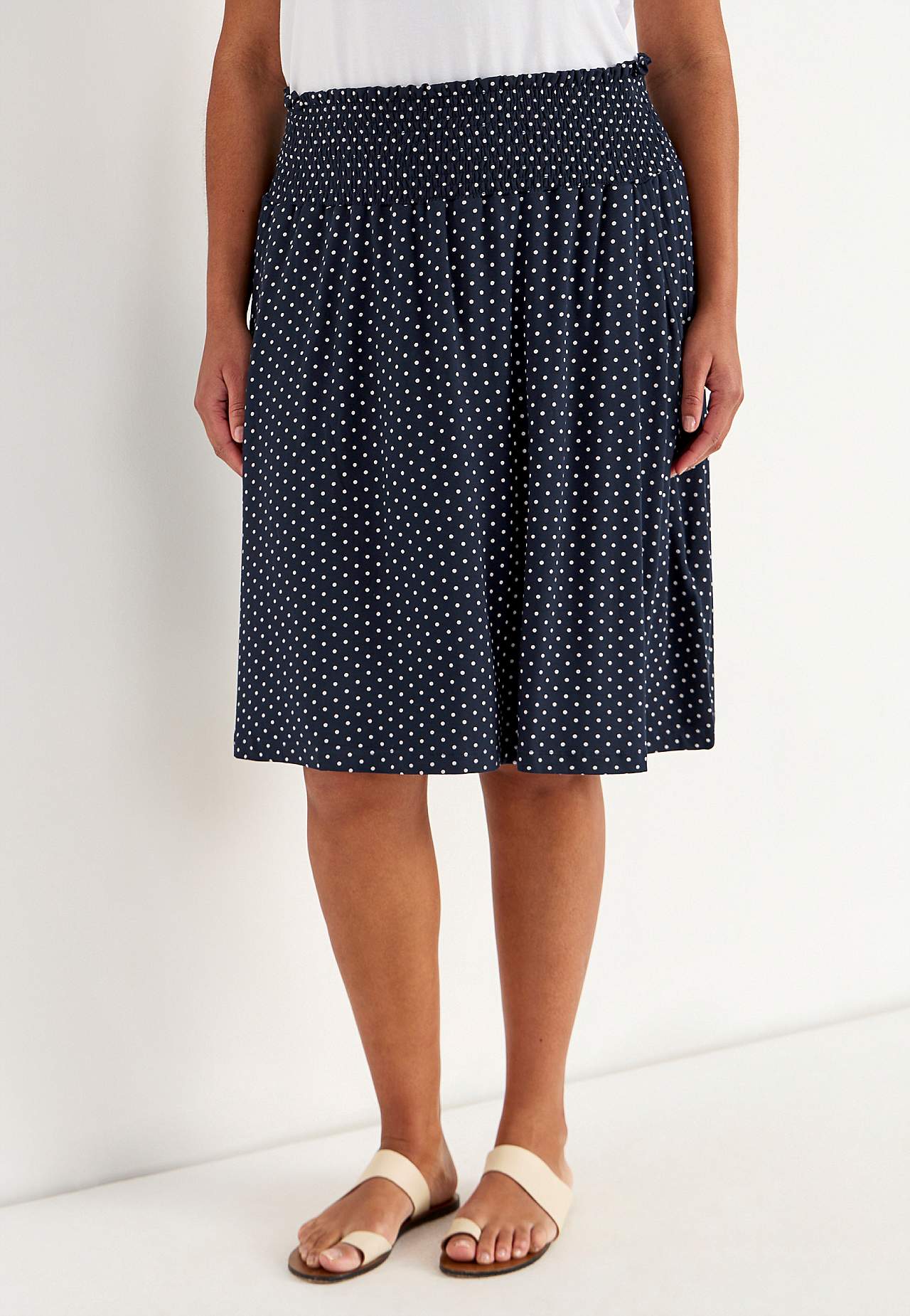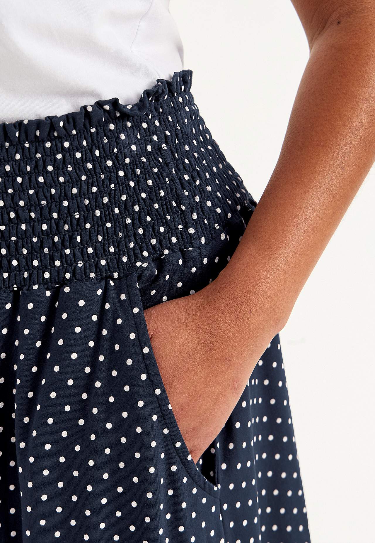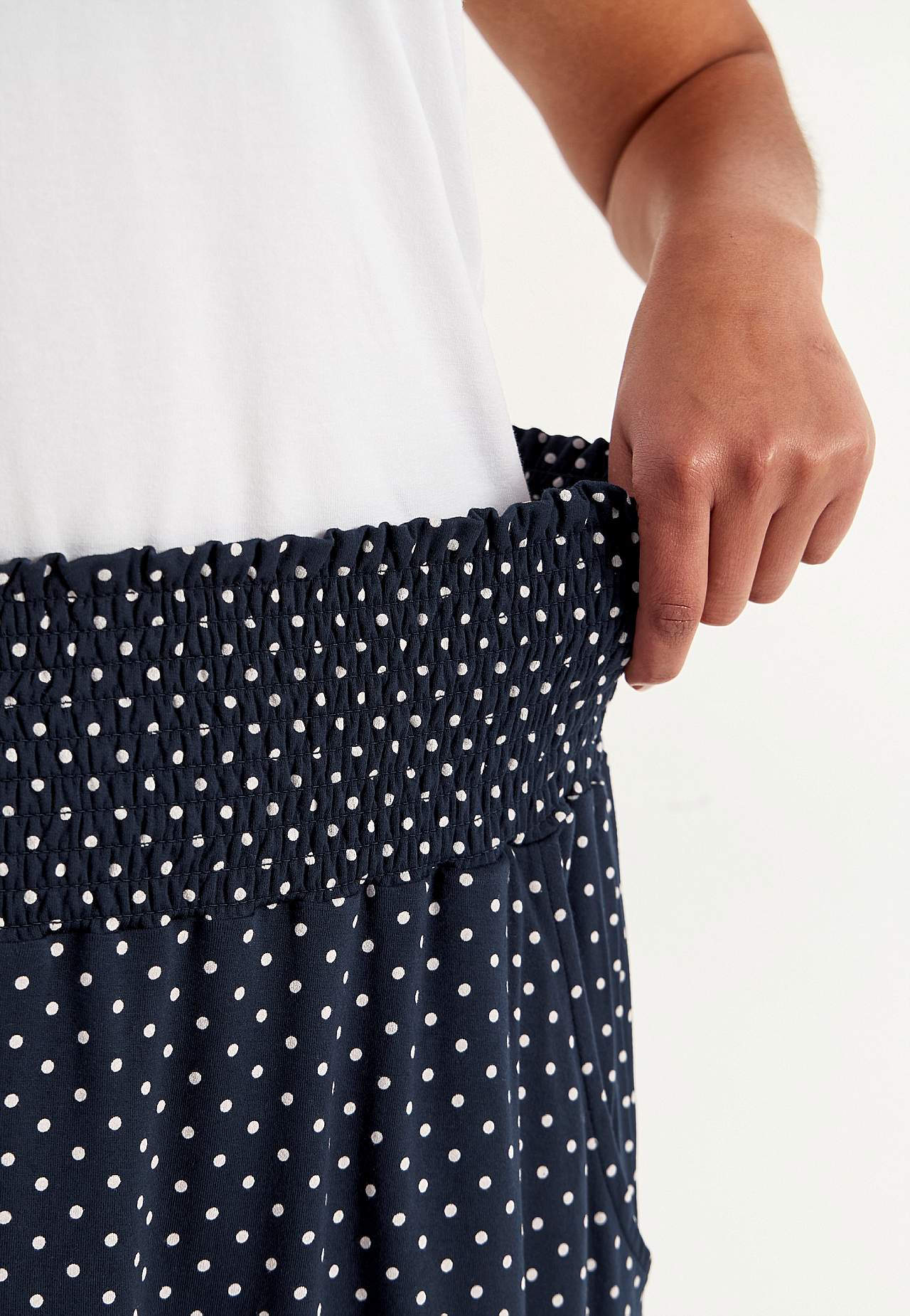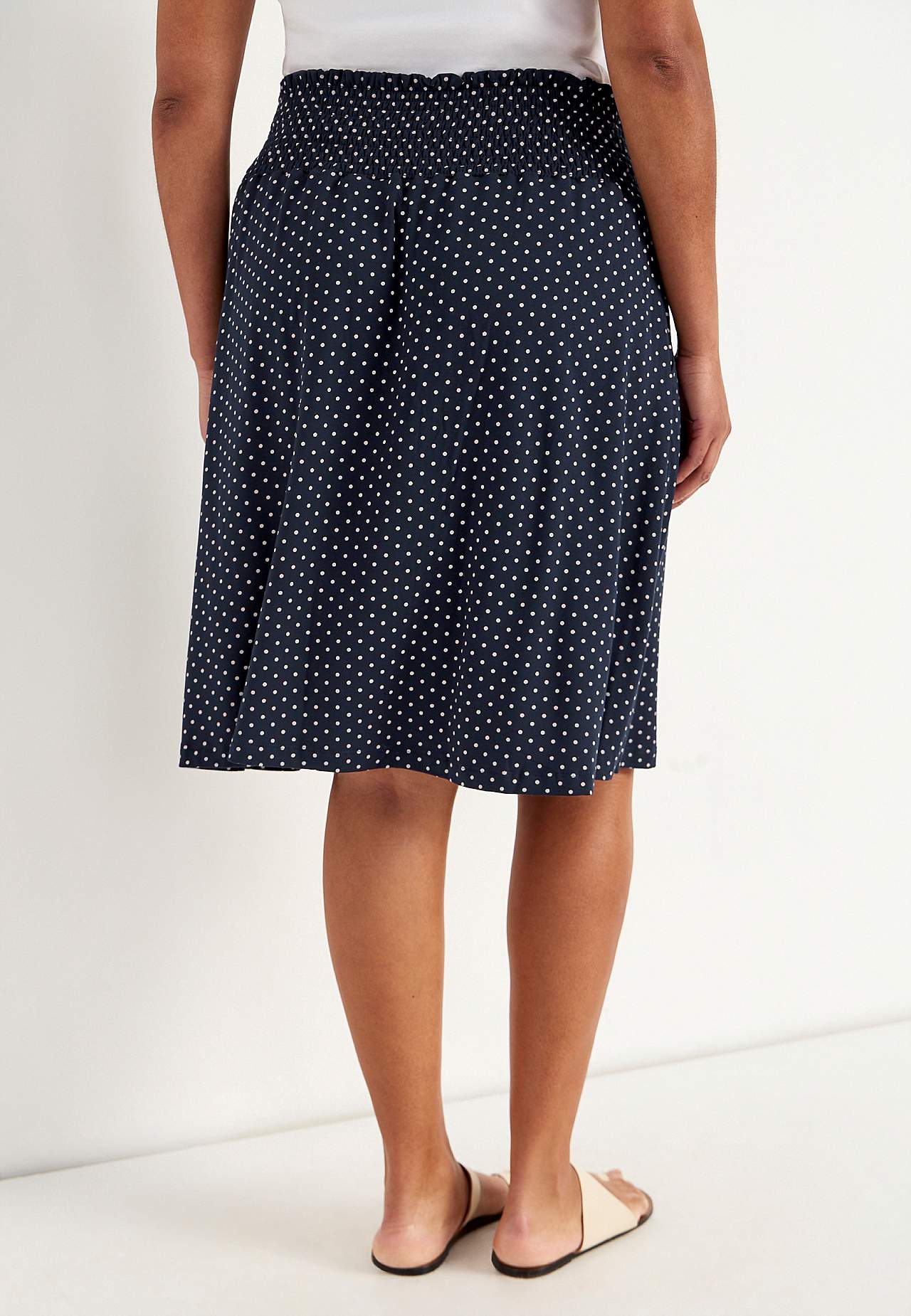 Utsvängd kjol i mjuk, följsam trikå. Vid passform. Bred, bekväm smock i midjan. Fickor i sidorna. Rak nederkant. Längden följer storleken ca 60-62 cm.