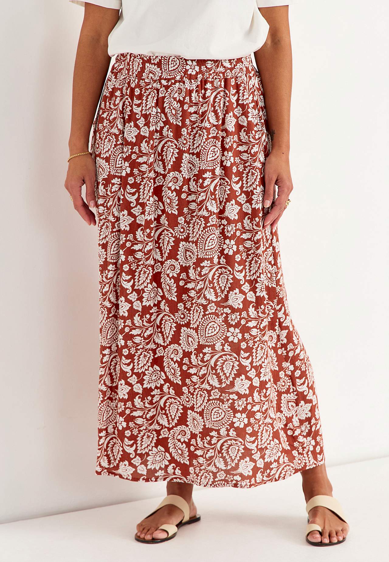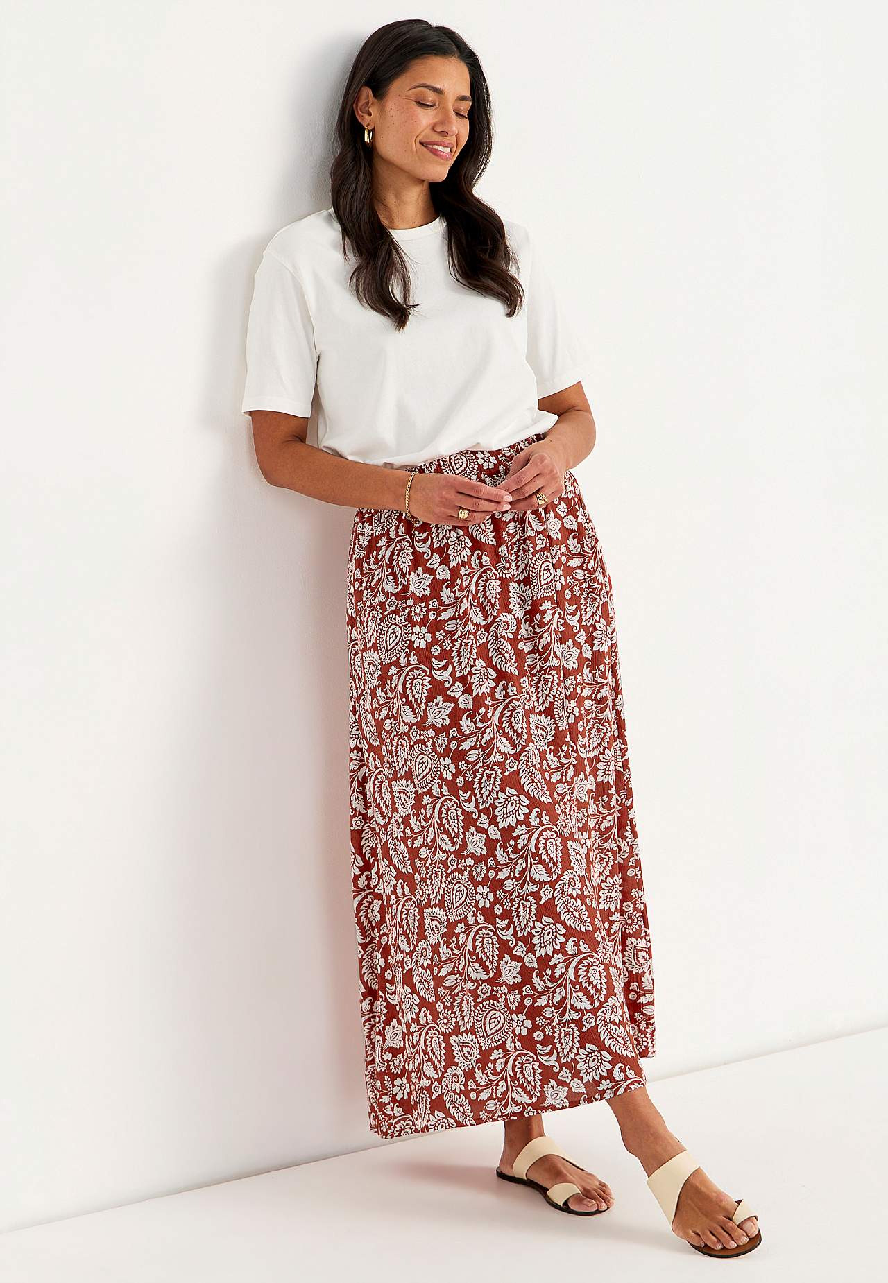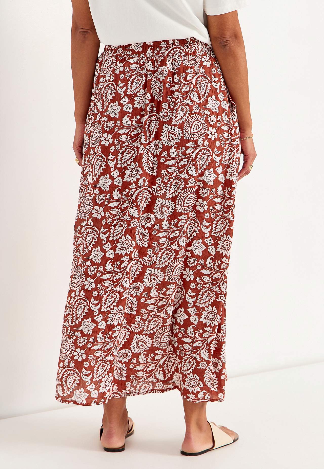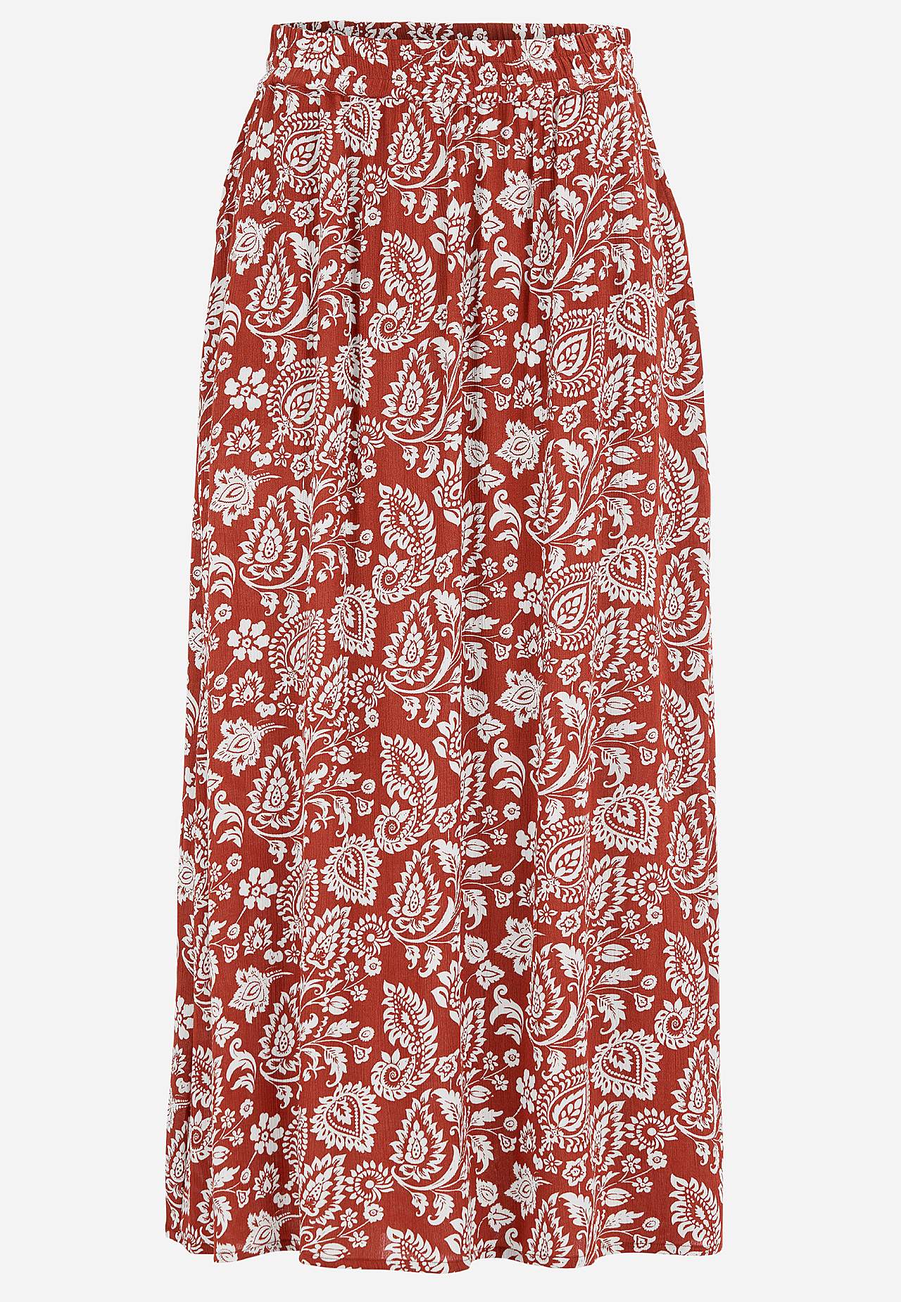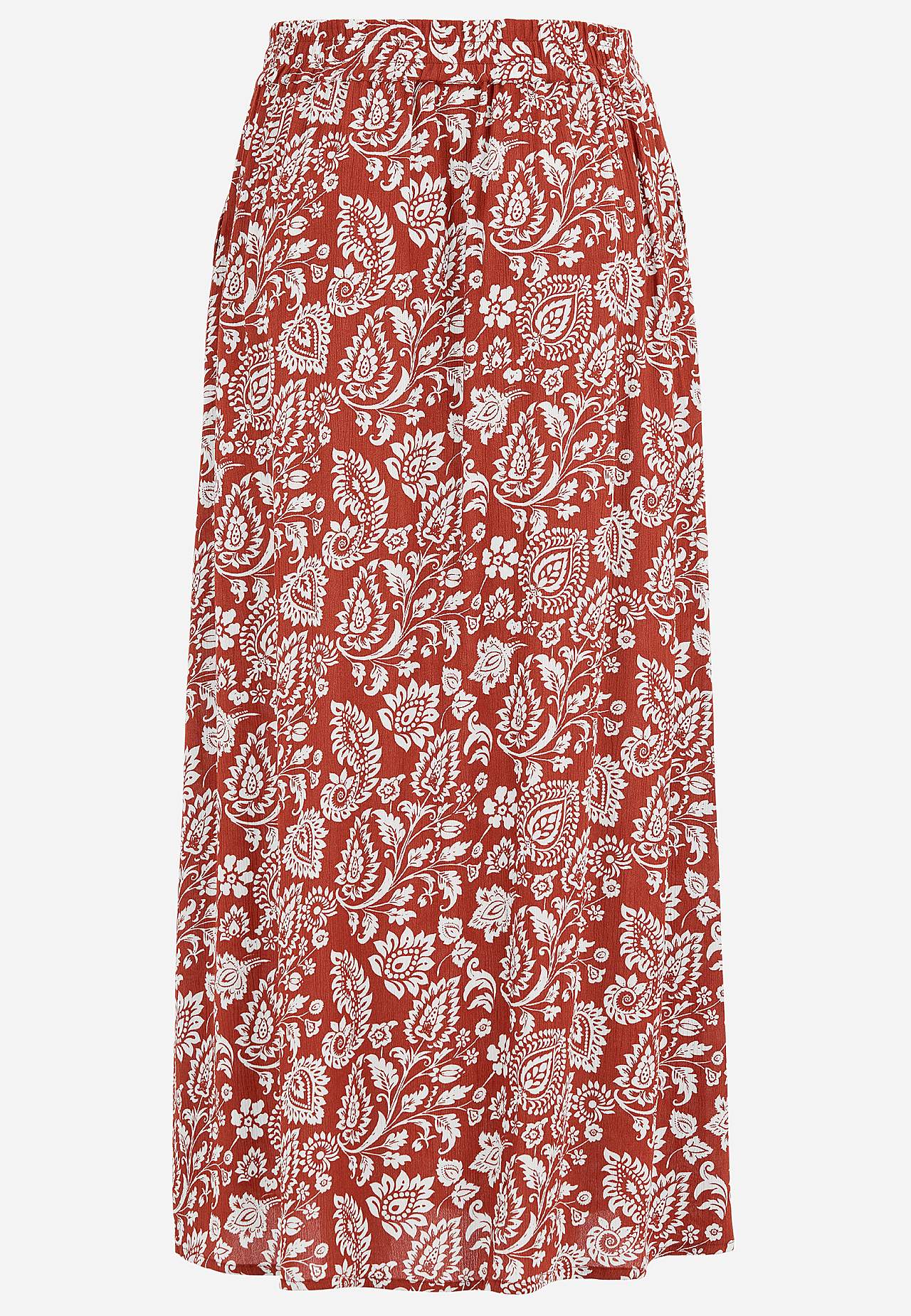 Lång, vävd viskoskjol med fickor. Material i crepe med matt yta och fin struktur. Mjukt och draperande med en sval känsla. Bred, mjuk resårlinning. Snedställda fickor framtill. Rak nederkant. Matcha gärna med 702443. Längd: 95 cm.