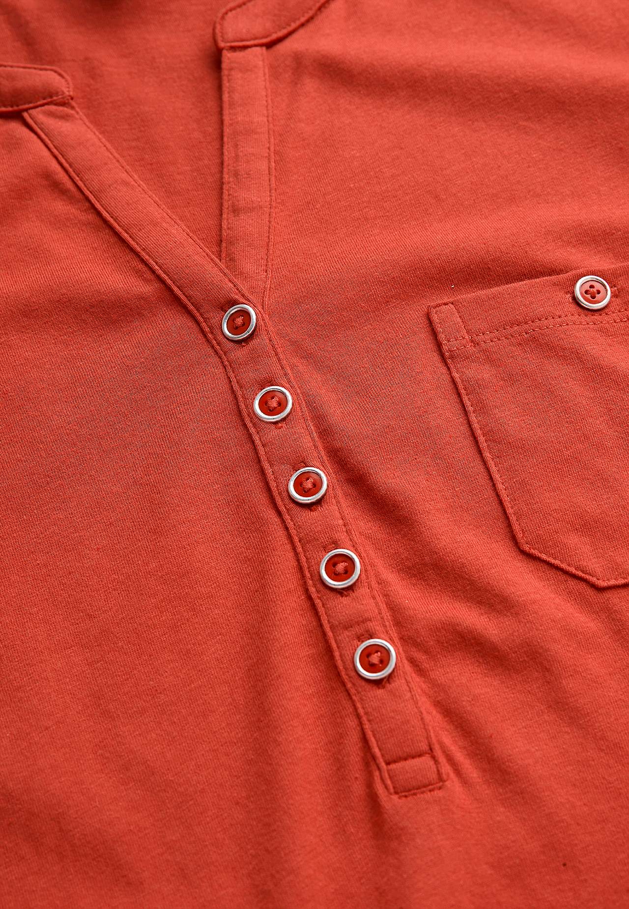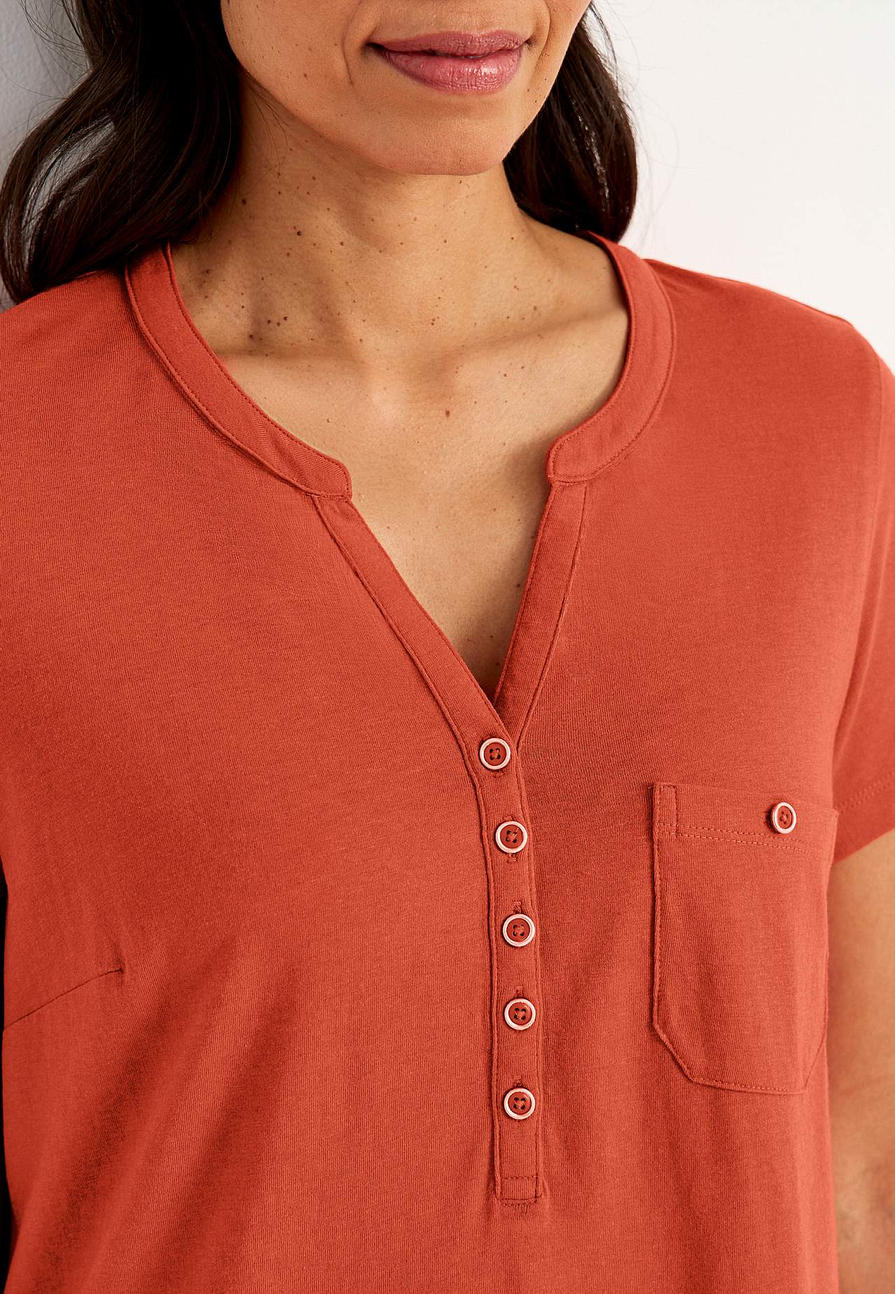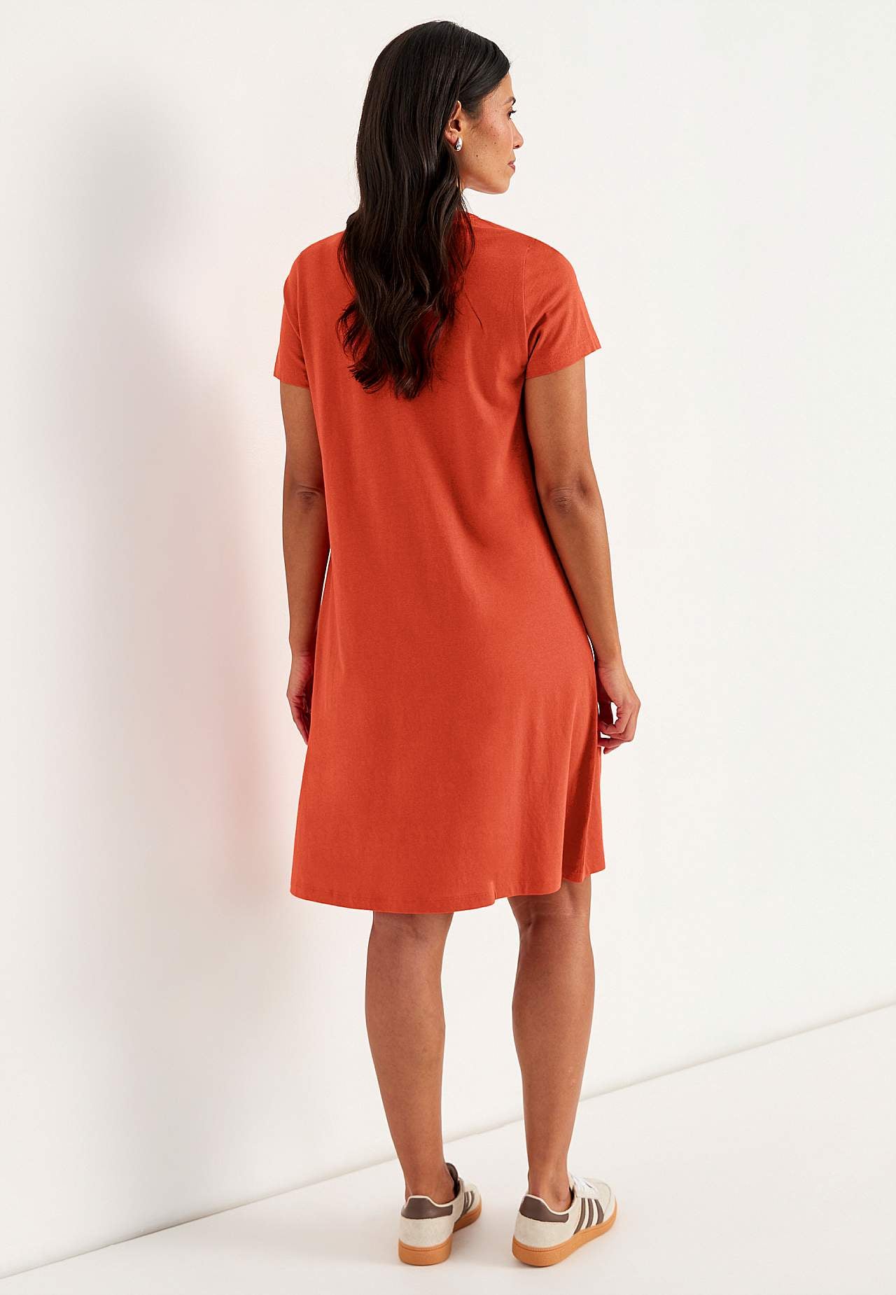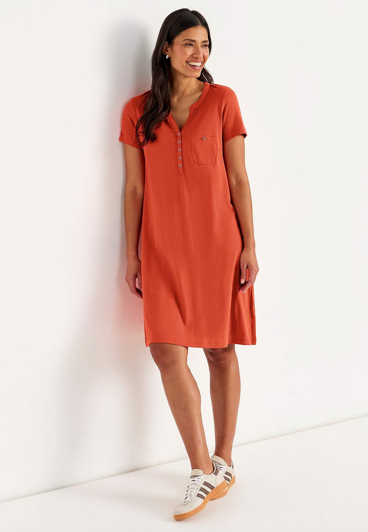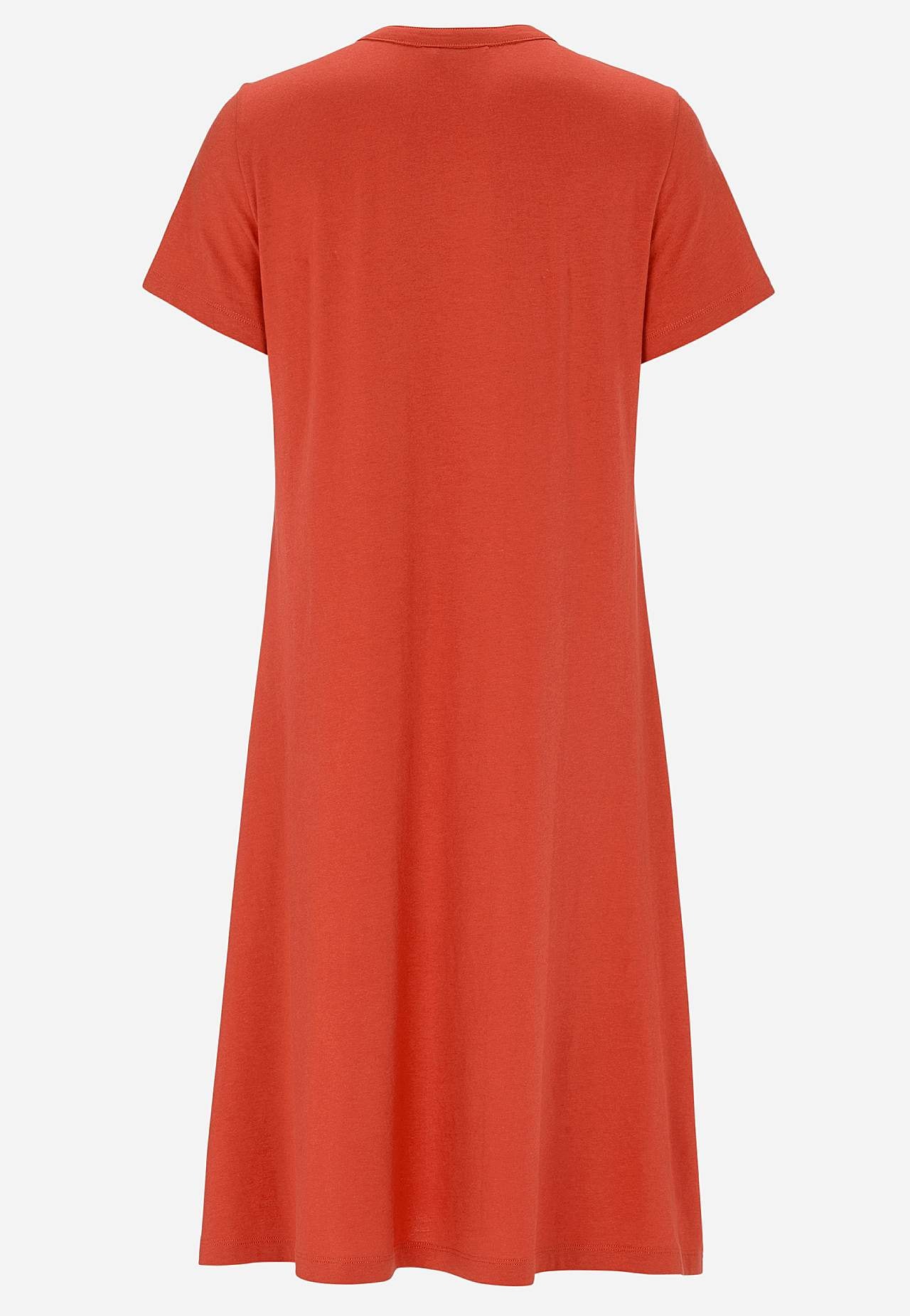 A-linjeformad klänning med korta ärmar. Trikå i härligt mjuk ekologisk bomull och modal. Rund hals med v-skärning och knappslå. Liten bröstficka med knapp. Insnitt vid bysten. Lätt rundad nederkant. Längden följer storleken ca 97-114 cm från axeln.