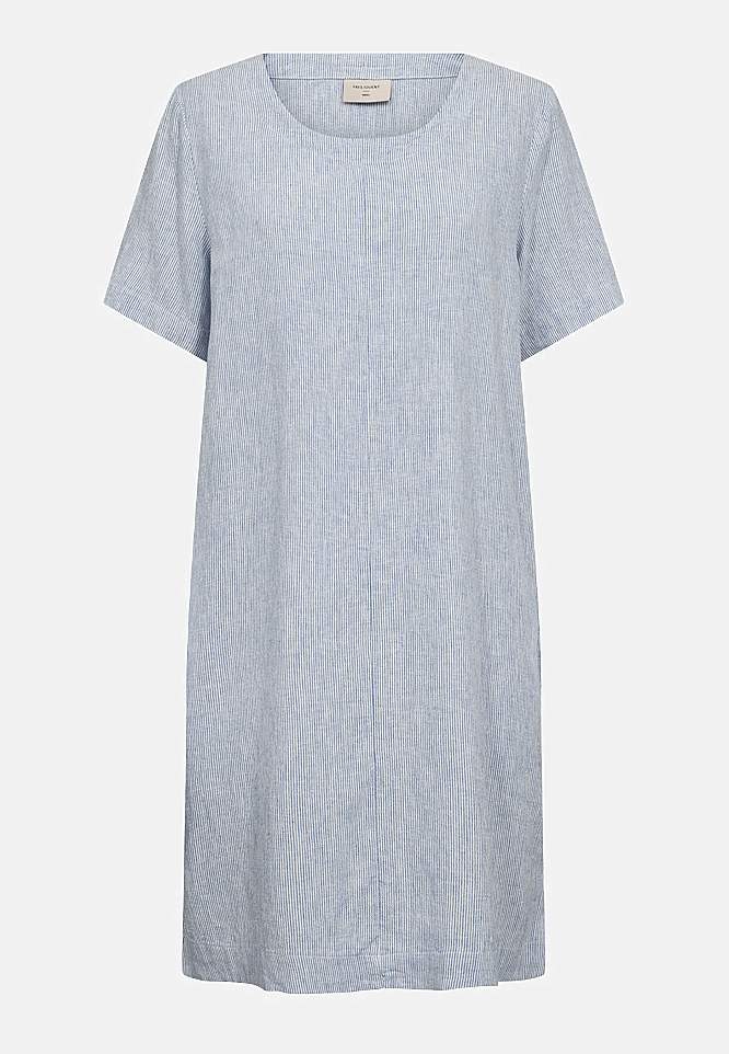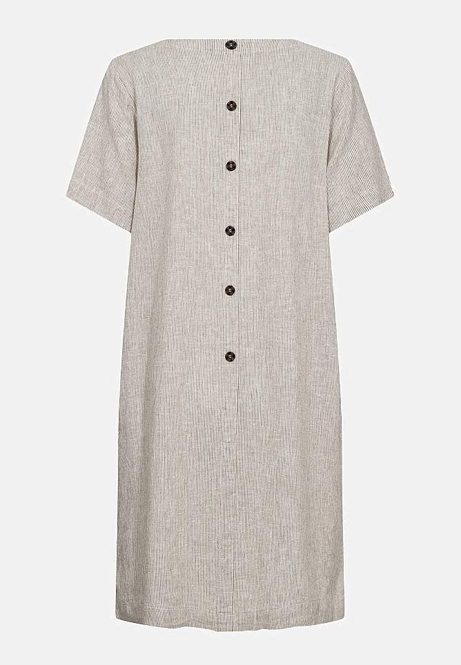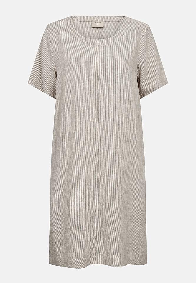 Vävd, garnfärgad klänning i linne- och viskosmix. Fantastiskt mjukt, luftigt material. Rymlig passform. Rundad hals. Bystinsnitt. Korta ärmar. Fickor i sidorna. Fast knäppning i ryggen. Rak nederkant. Längd från axeln ca 95 cm i storlek S (38).