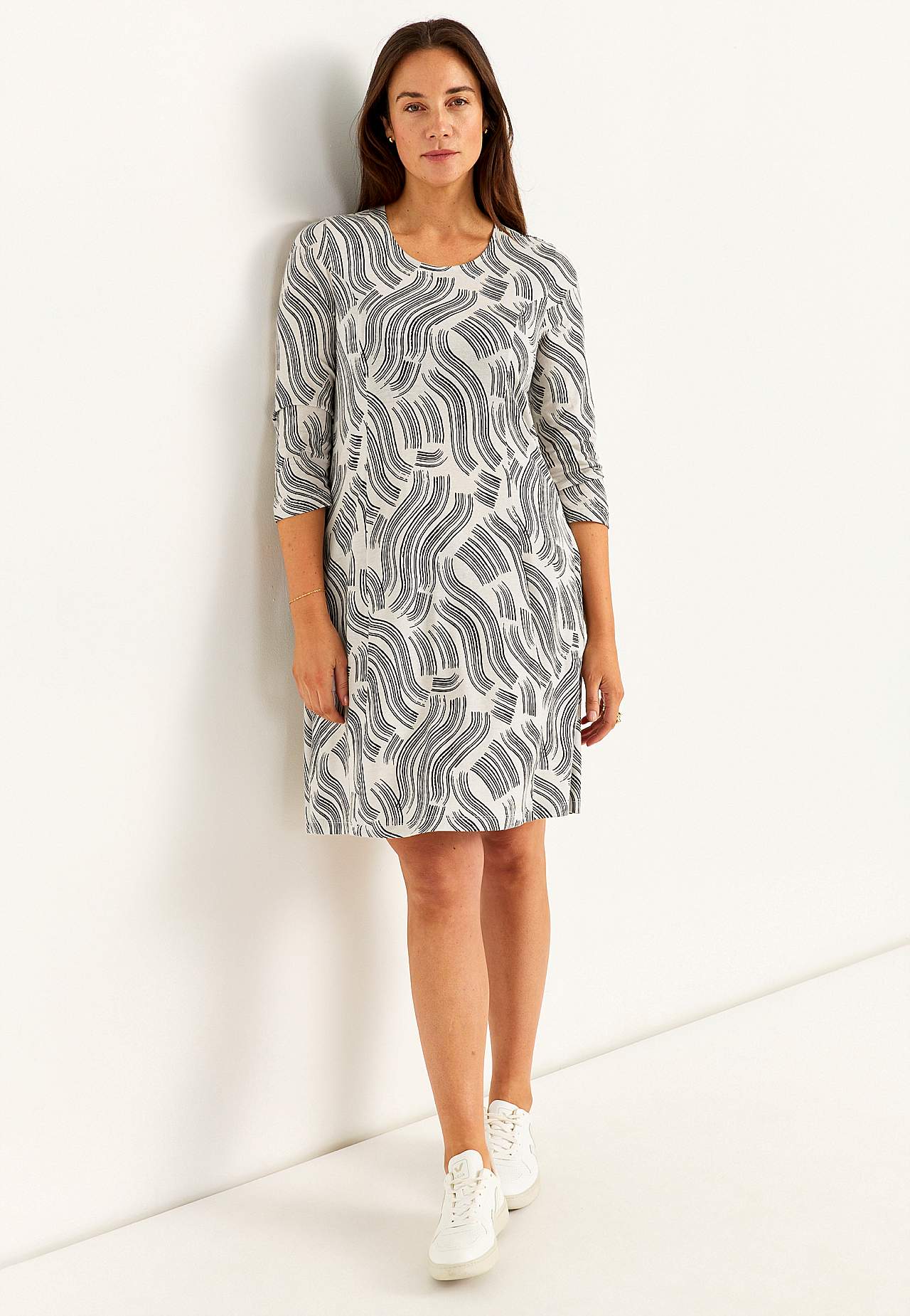 Mjuk, skön klänning i bomull- och viskosblandning. Tight passform över bysten. Utsvängd modell med panelsömmar både fram och bak. Rundad halsringning. Bekväma sidofickor. 3/4-långa, raka ärmar. Längden följer storleken ca 96-108 cm från axeln.