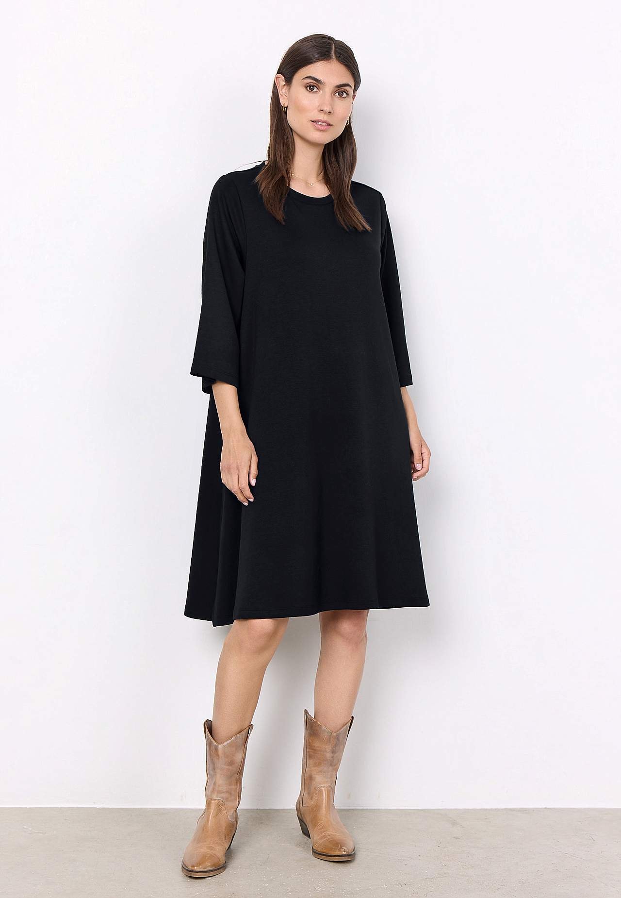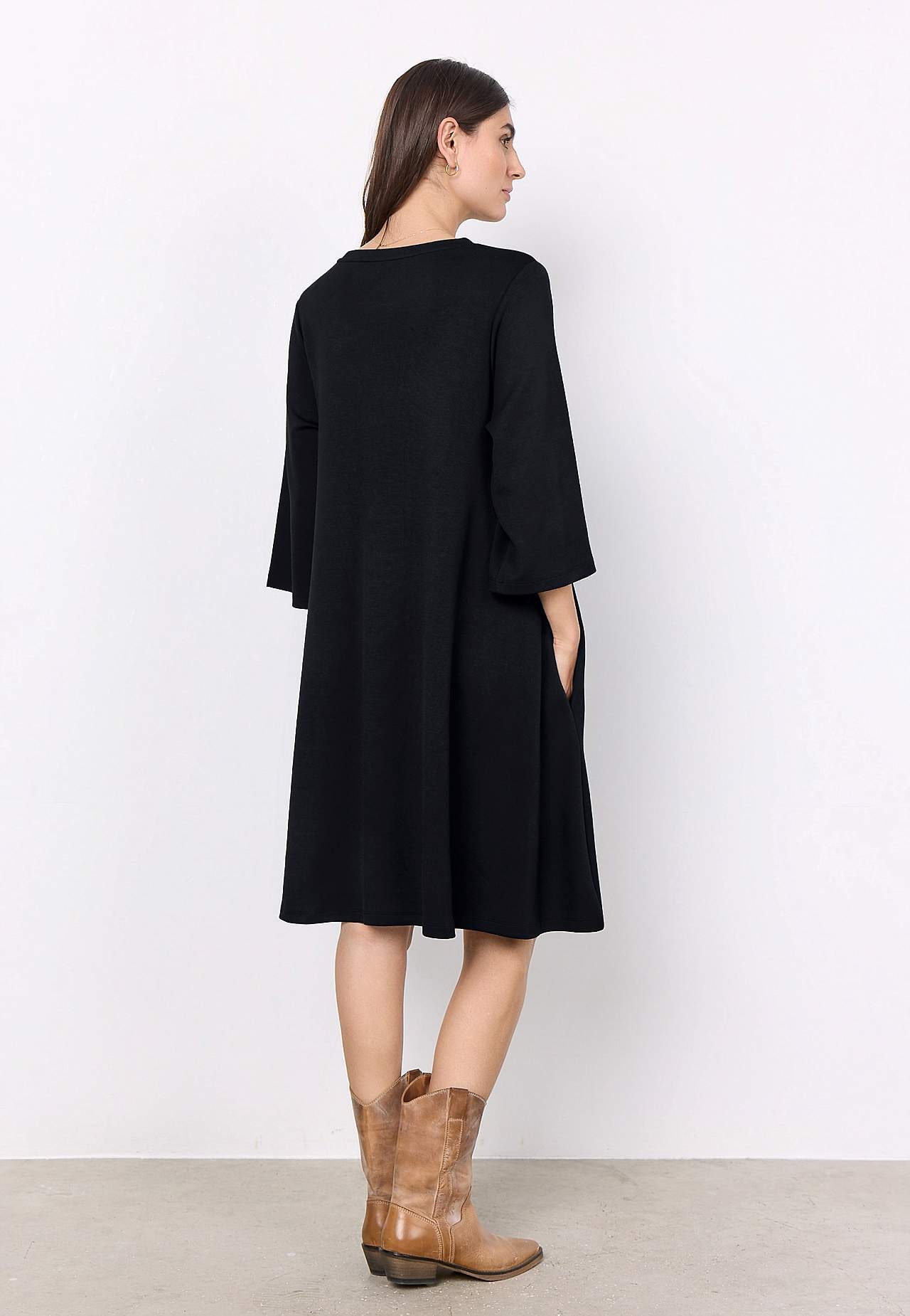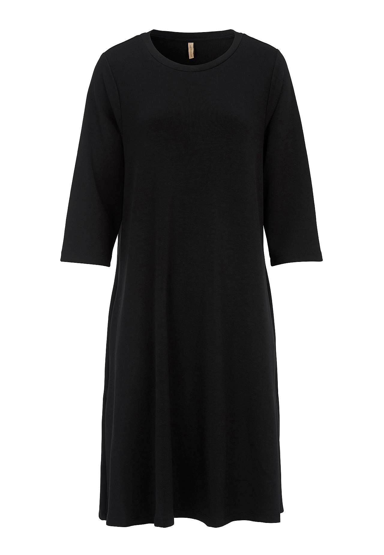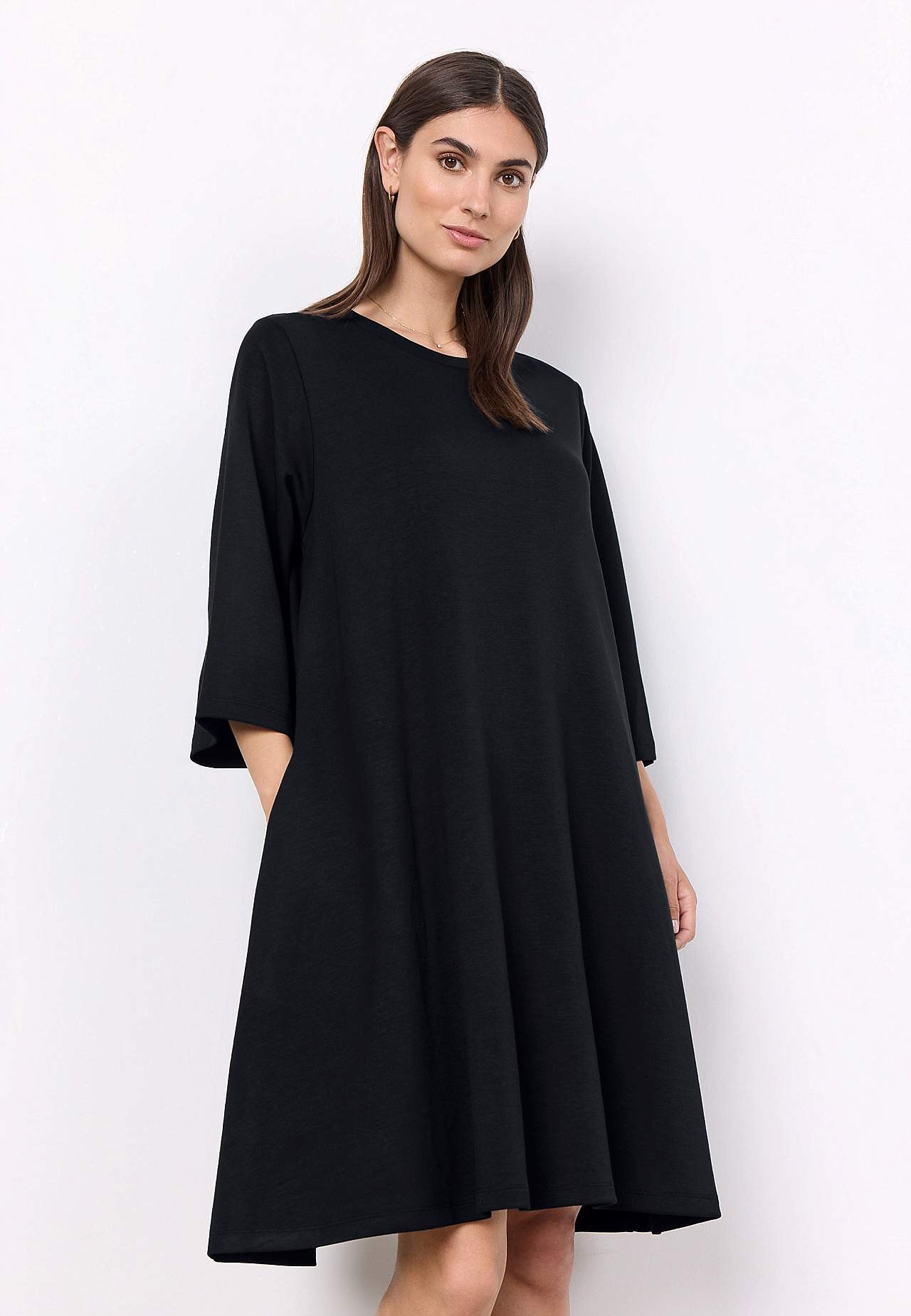 Klänning i mjuk, härlig modalmix med något kraftigare trikå. Vid, a-linjeformad passform. Rundad halsringning. 3/4-långa, vida ärmar. Bekväma sidofickor. Rak nederkant. Längd från axeln ca 98 cm i storlek S (38).