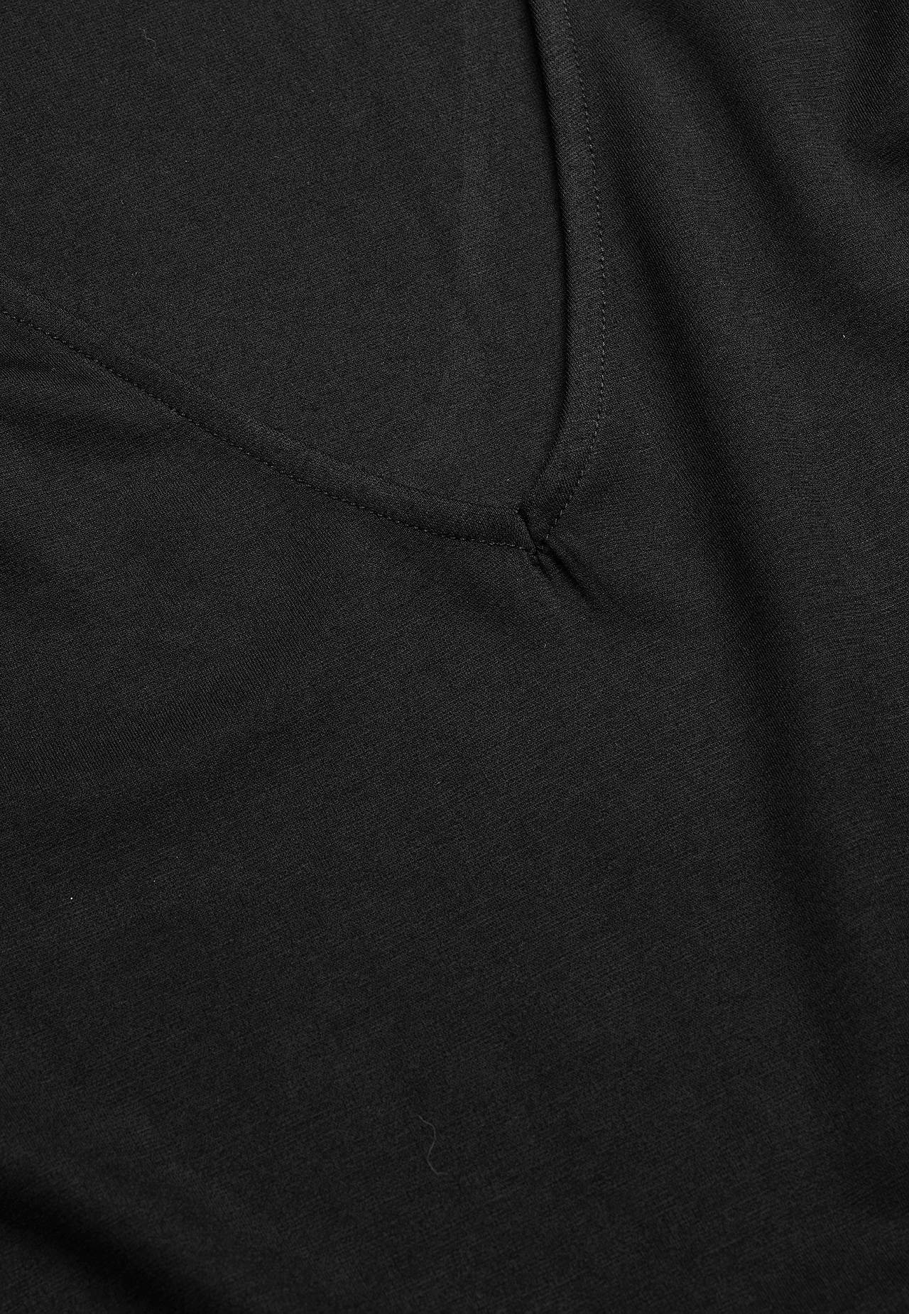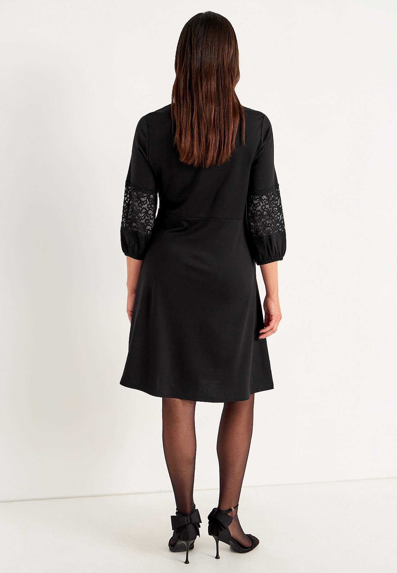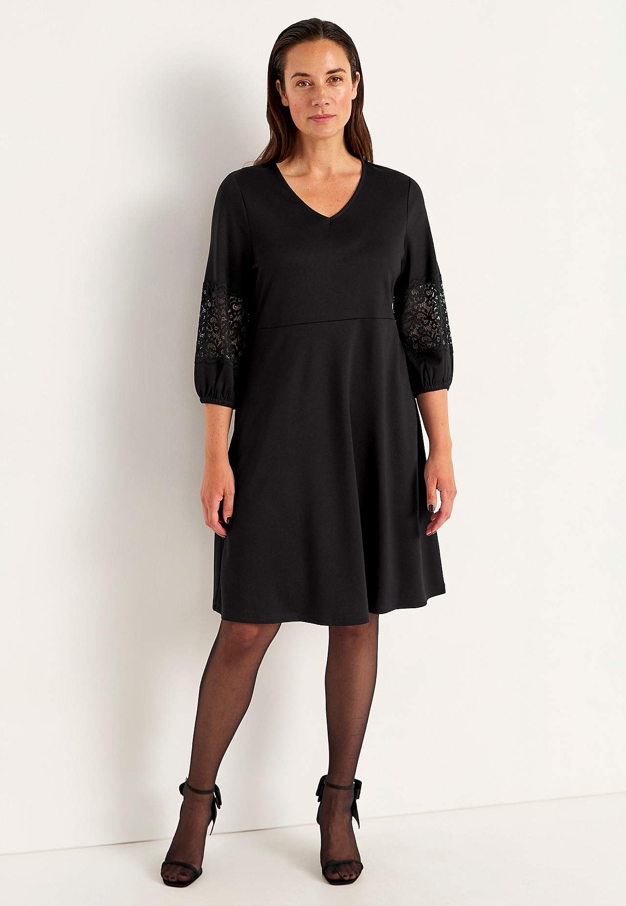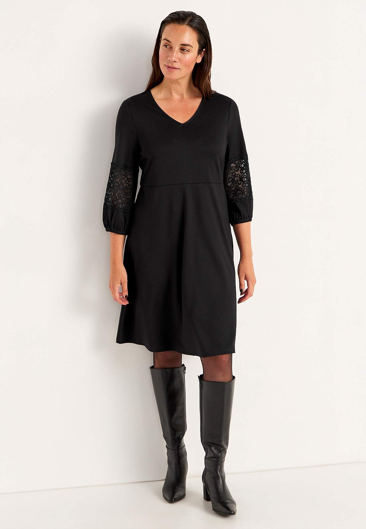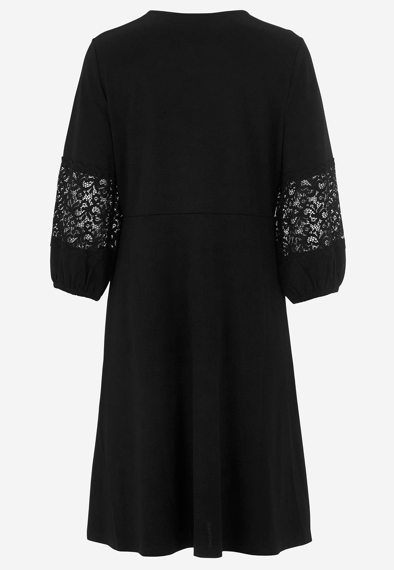 Klänning i mjuk, följsam viskostrikå. Lös passform med vidd nertill. Avskärning i midjan. V-formad halsringning. Trekvartsärmar med spetsdetaljer och resår i ärmsluten. Något rundad nederkant. Rygglängd ca 98 cm i alla storlekar.