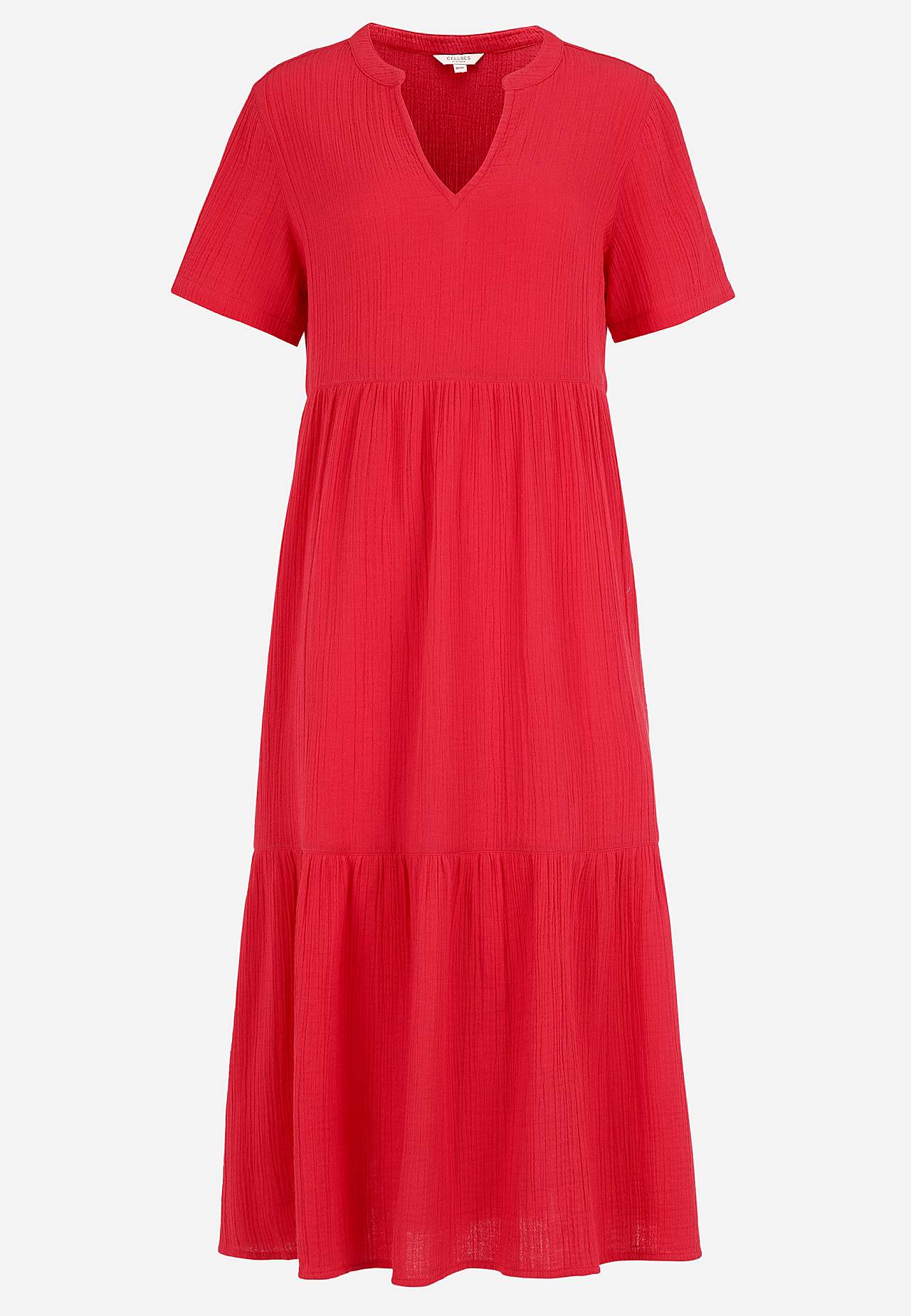 Volangklänning i härlig bomullsmuslin med naturlig struktur. Vävt, mjukt material med luftig, sval känsla. Rymlig passform med vidd nedtill. Rund hals med liten v-ringning. Korta ärmar. Avskärning i midjan. Volang nedtill. Rak nederkant. Rygglängd ca 125 cm i alla storlekar.