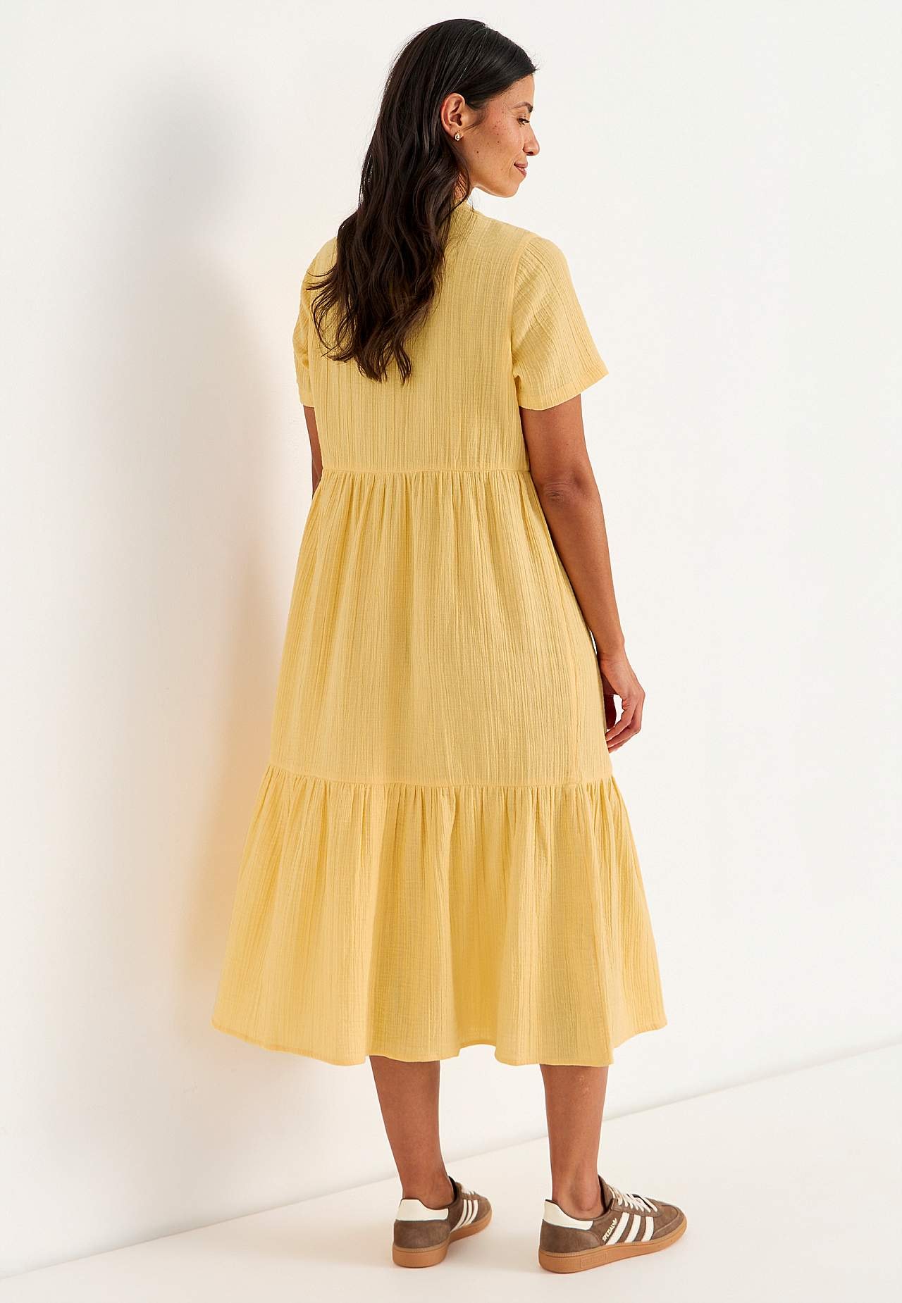Volangklänning i härlig bomullsmuslin med naturlig struktur. Vävt, mjukt material med luftig, sval känsla. Rymlig passform med vidd nedtill. Rund hals med liten v-ringning. Korta ärmar. Avskärning i midjan. Volang nedtill. Rak nederkant. Rygglängd ca 125 cm i alla storlekar.
