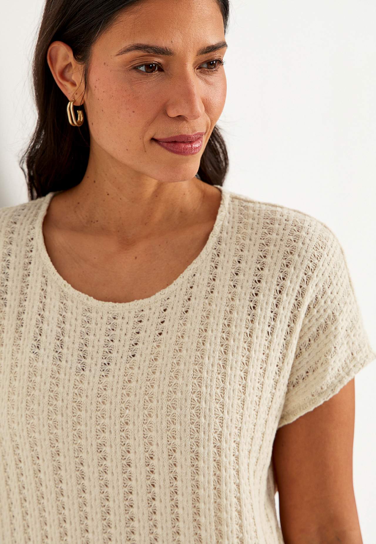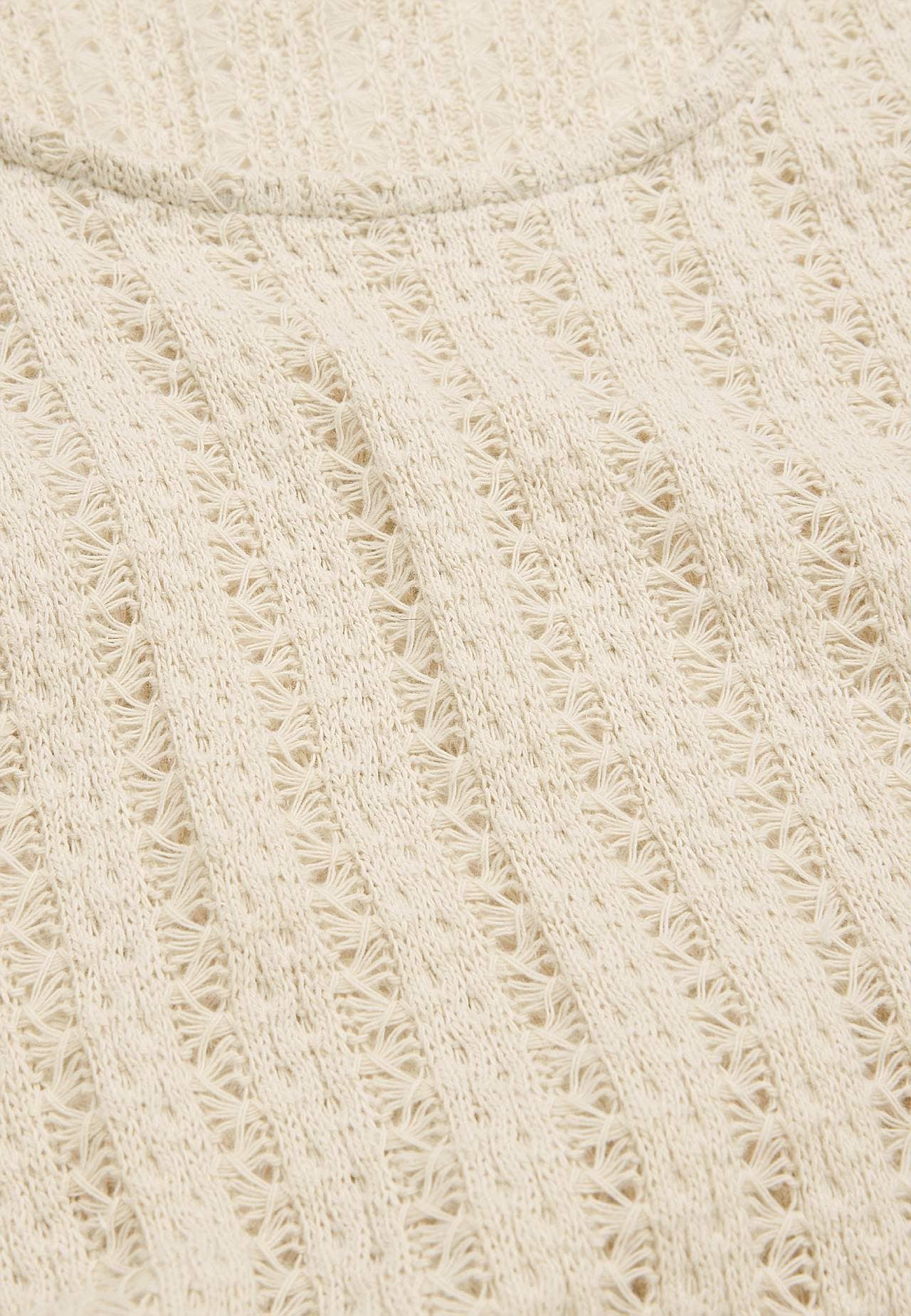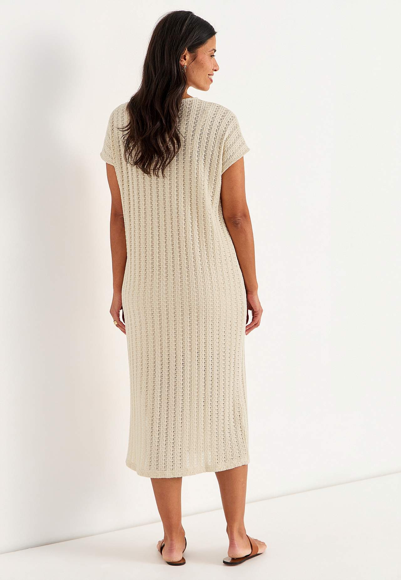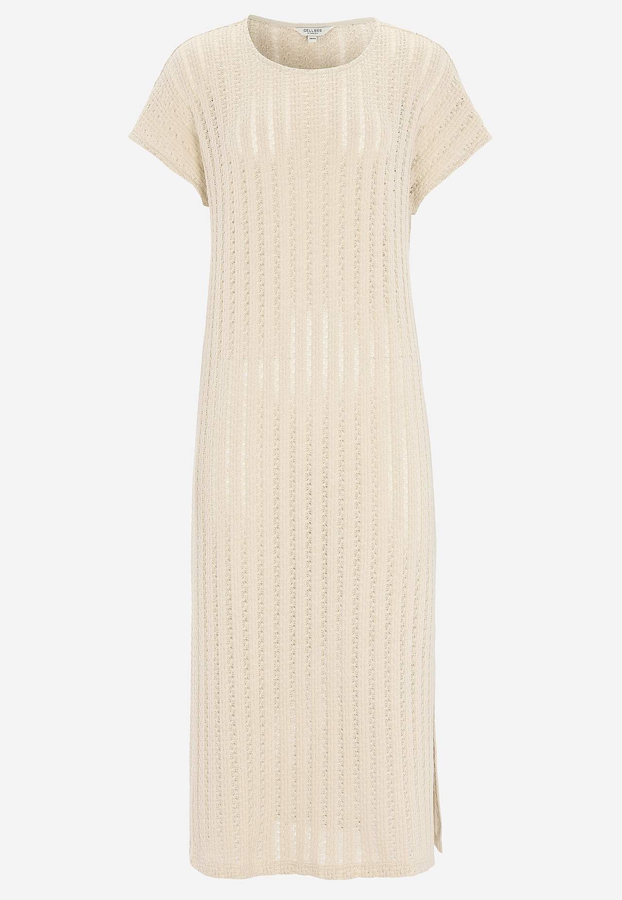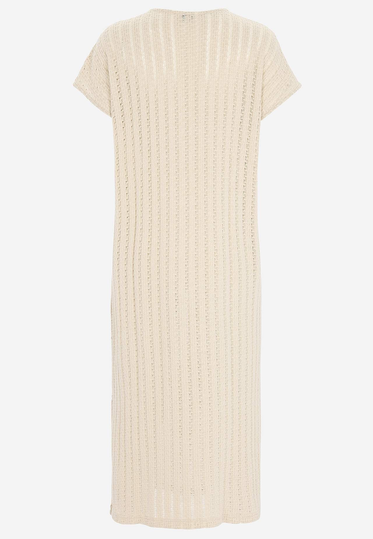 Stickad, luftig trikåklänning med effektfullt hålmönster. Mjuk, stadig bomullsblandning. Ofodrad, lång kaftanmodell. Fin att bära över ett linne och ett par vita jeans. Ledig passform. Rundad halsringning. Korta holkärmar. Lätt rundad nederkant med slits i sidan. Rygglängd ca 124 cm i alla storlekar.