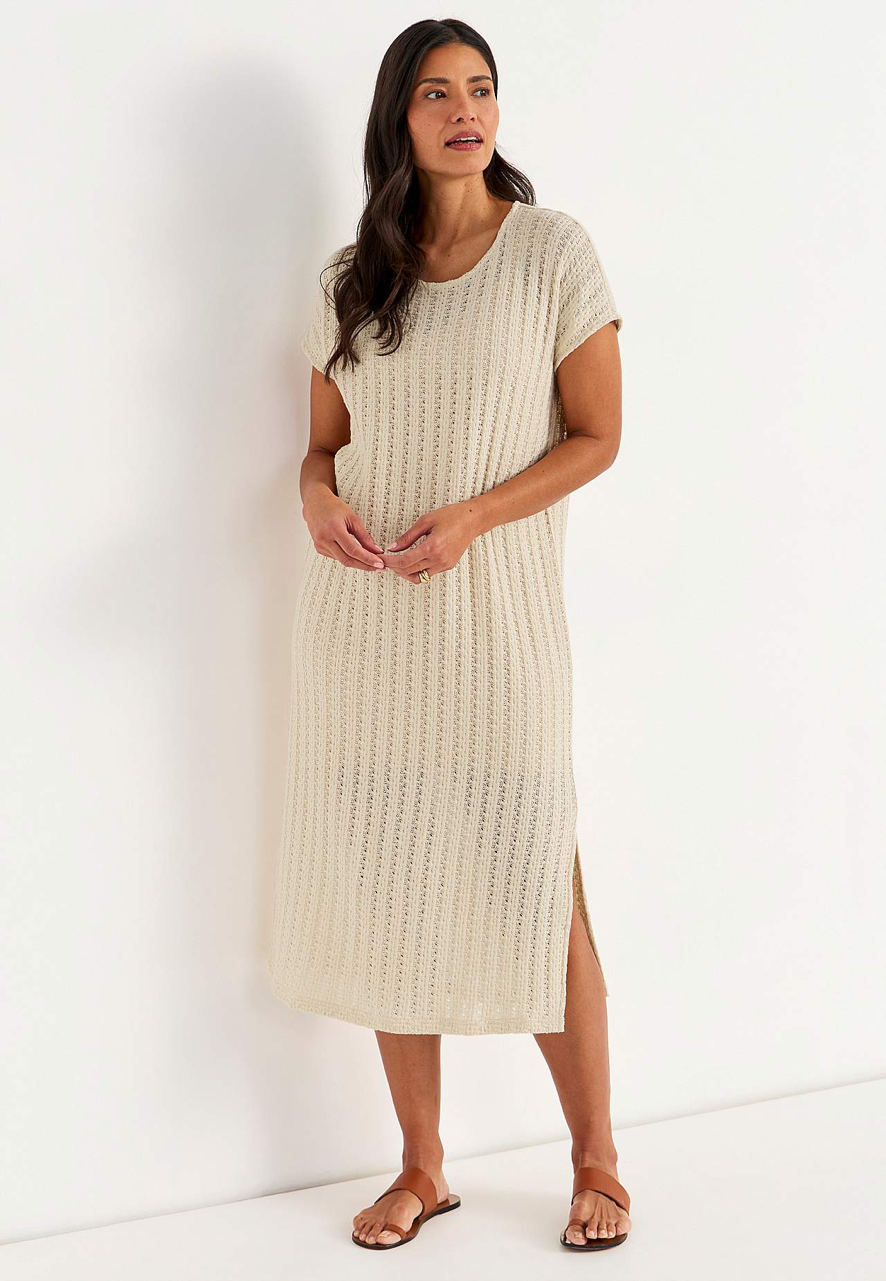 Stickad, luftig trikåklänning med effektfullt hålmönster. Mjuk, stadig bomullsblandning. Ofodrad, lång kaftanmodell. Fin att bära över ett linne och ett par vita jeans. Ledig passform. Rundad halsringning. Korta holkärmar. Lätt rundad nederkant med slits i sidan. Rygglängd ca 124 cm i alla storlekar.