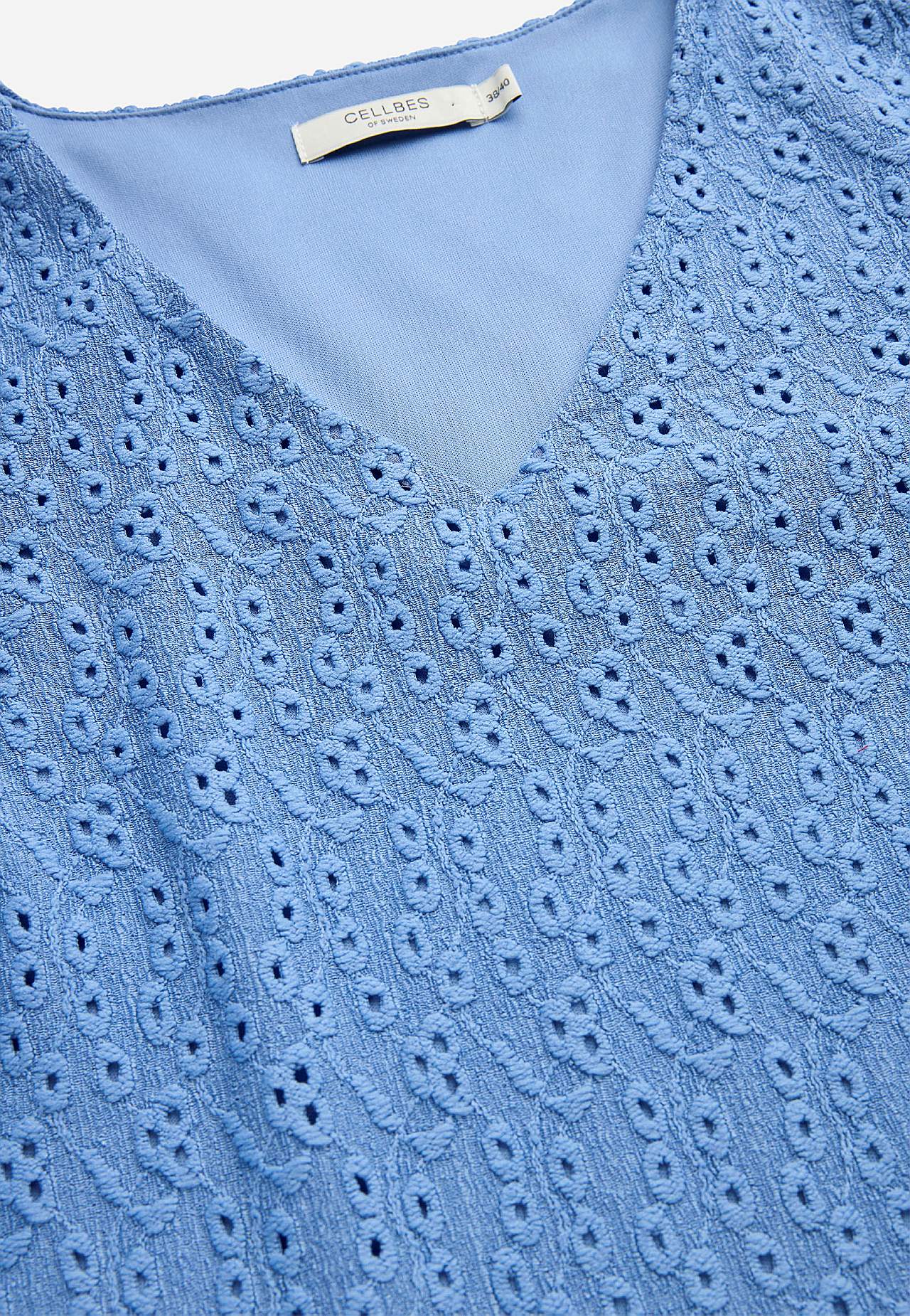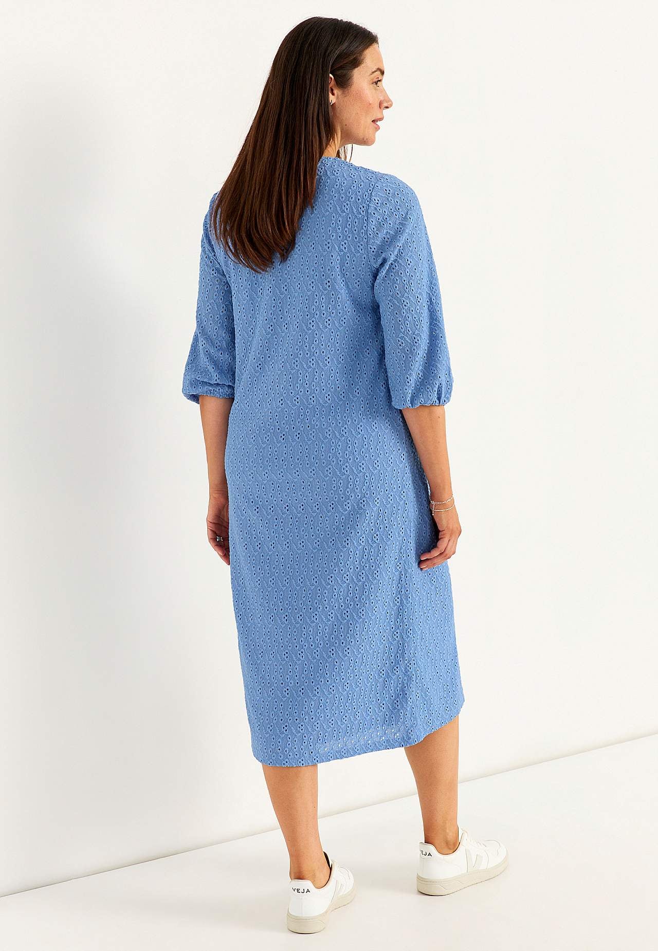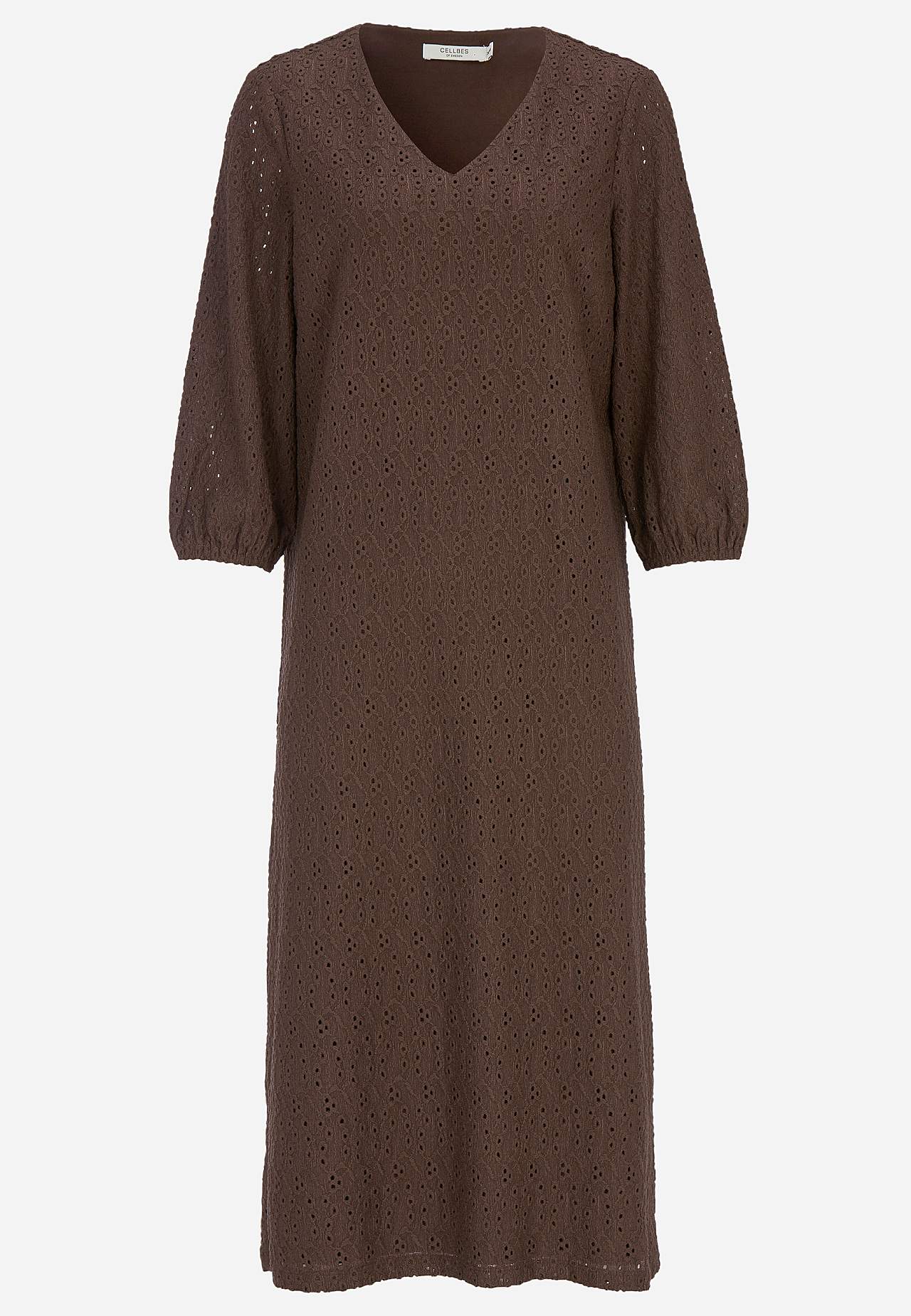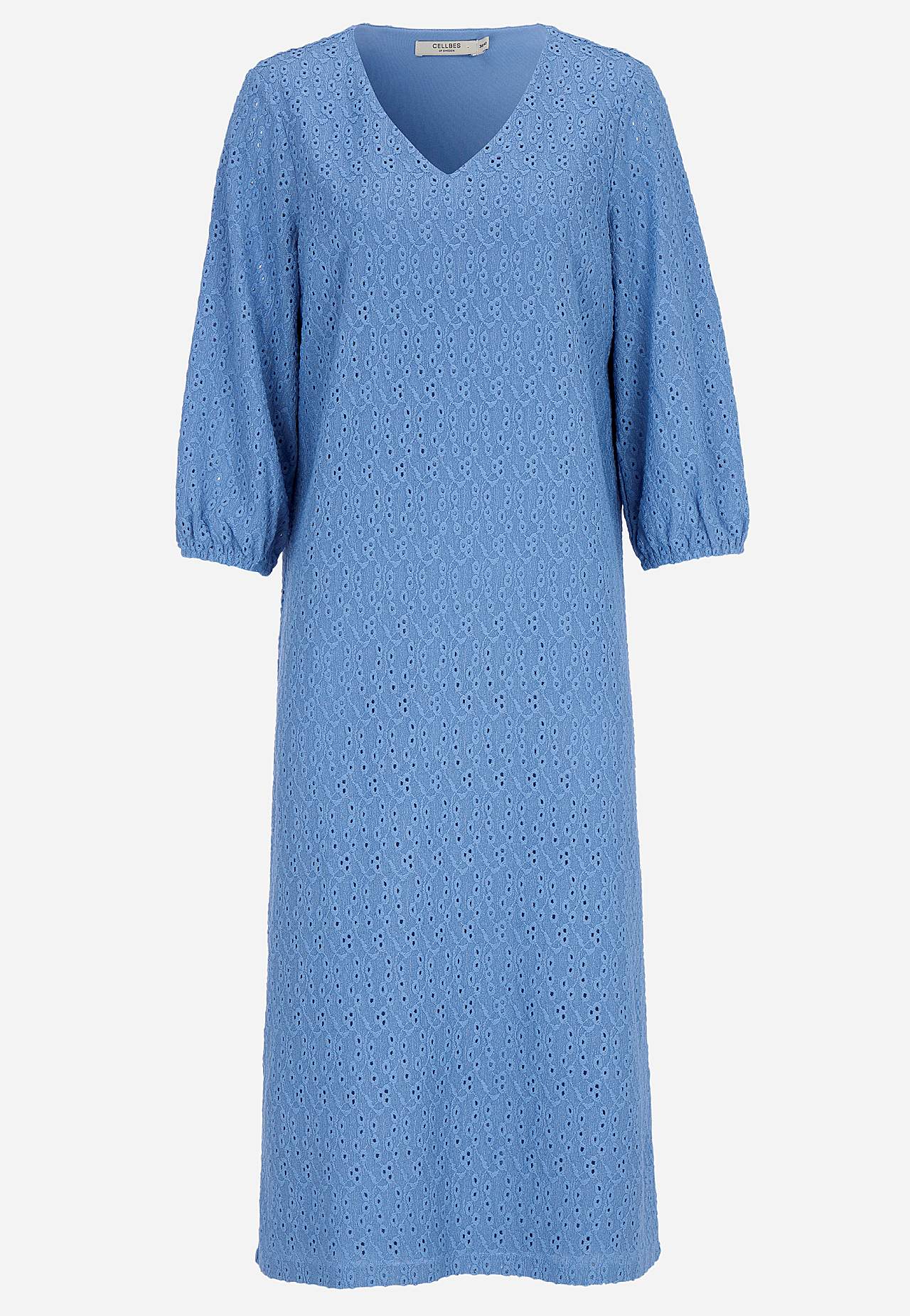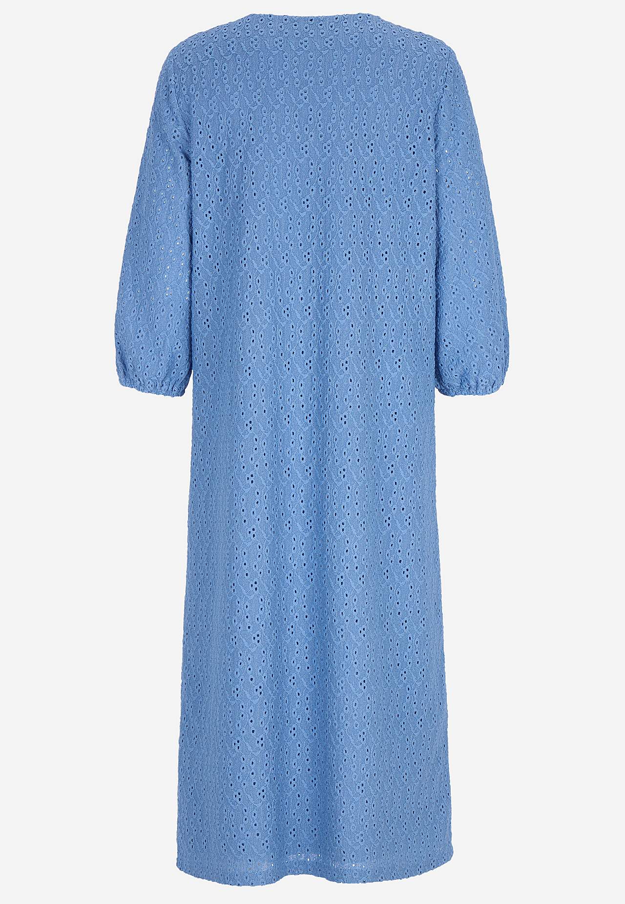 Strukturmönstrad, fodrad klänning i broderie anglaise. Bekvämt, stretchigt material. Något a-linjeformad passform. V-ringad hals. Bystinsnitt. Trekvartslånga, ofodrade ärmar med resår i ärmsluten. Rak nederkant. Rygglängd ca 120 cm i alla storlekar.