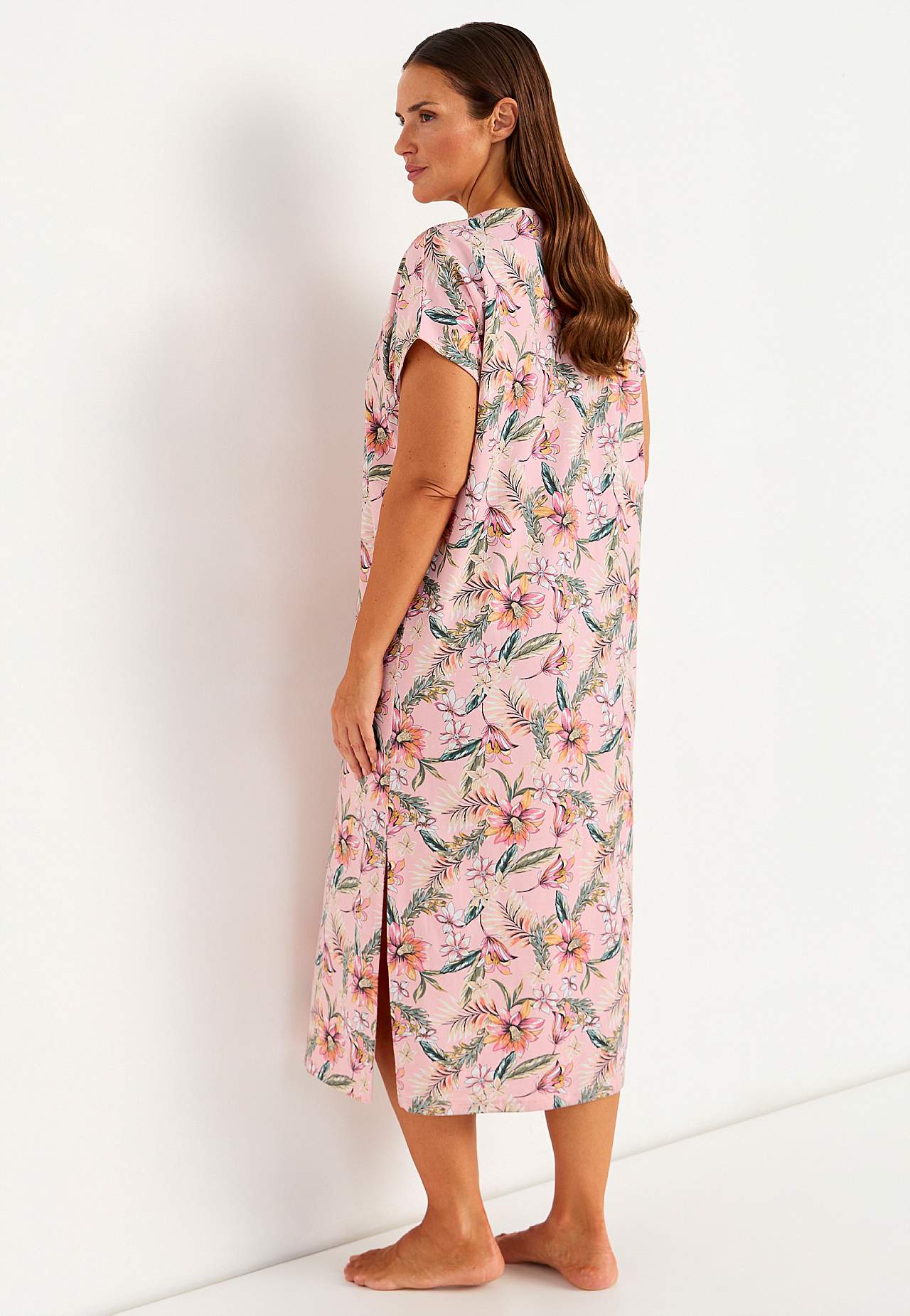 Mjuk, stretchig strandklänning i ekologisk bomull. Klassisk kaftanmodell. Lös passform. Rak nederkant med hög slits i sidorna. Rygglängd ca 128 cm i alla storlekar.