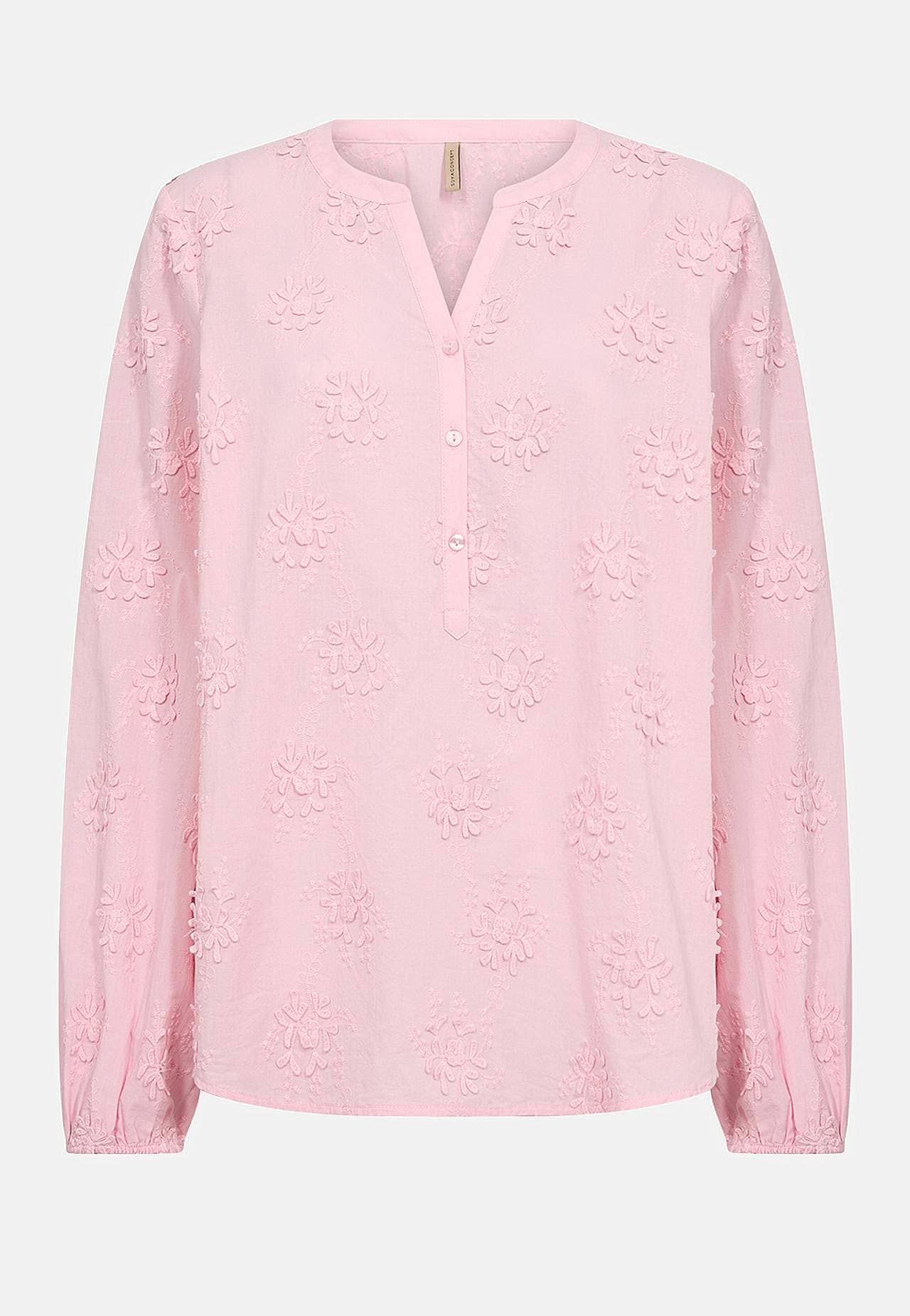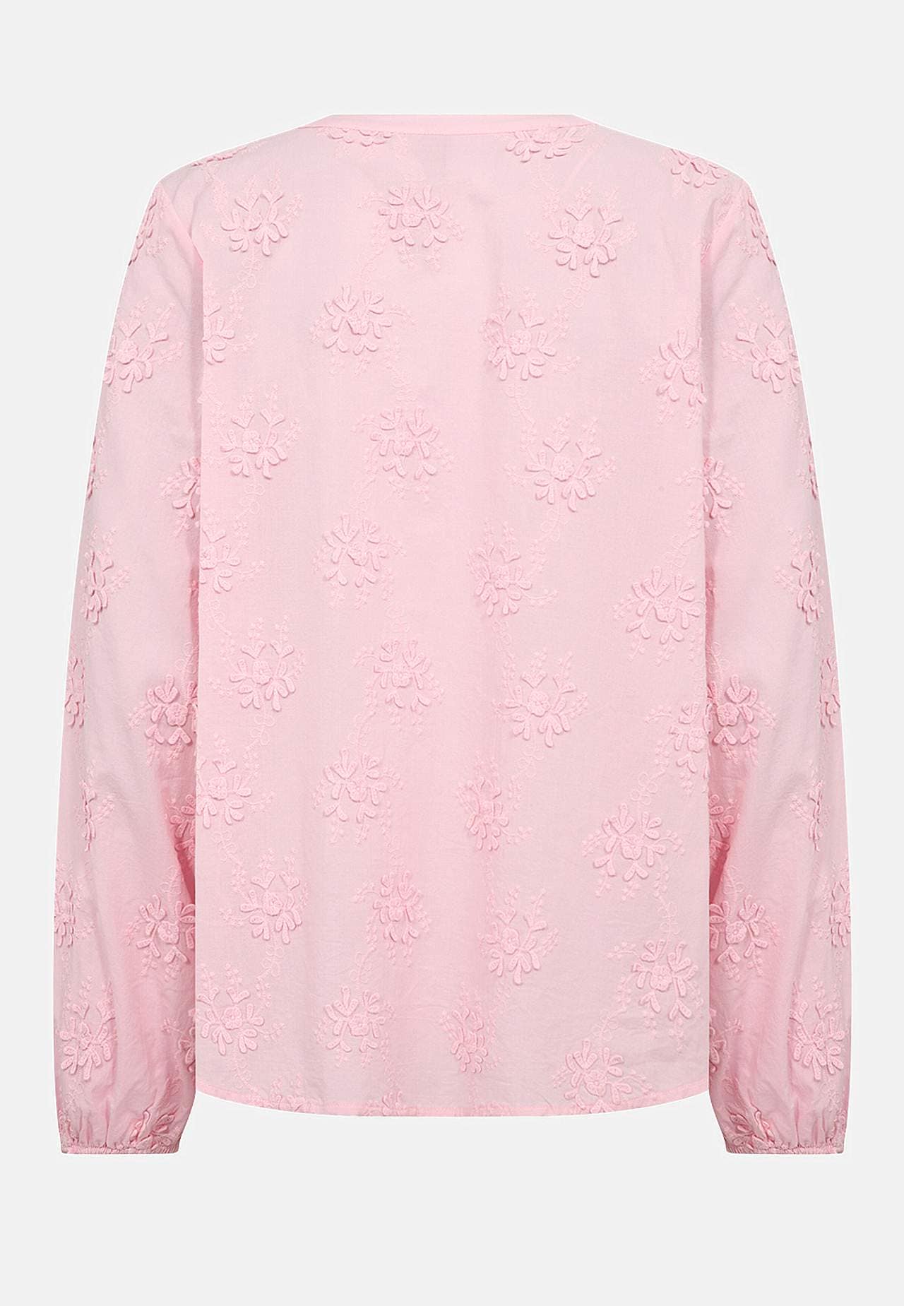 Vävd blus i ekologisk, luftig bomull. Effektfulla, broderade, fastsydda blommor och brodyr både fram och bak. Normal passform. V-ringning med knappslå med tre knappar. Bystinsnitt. Långa ärmar med resår i ärmsluten. Rundad nederkant. Längd från axeln ca 64 cm i storlek M (40).