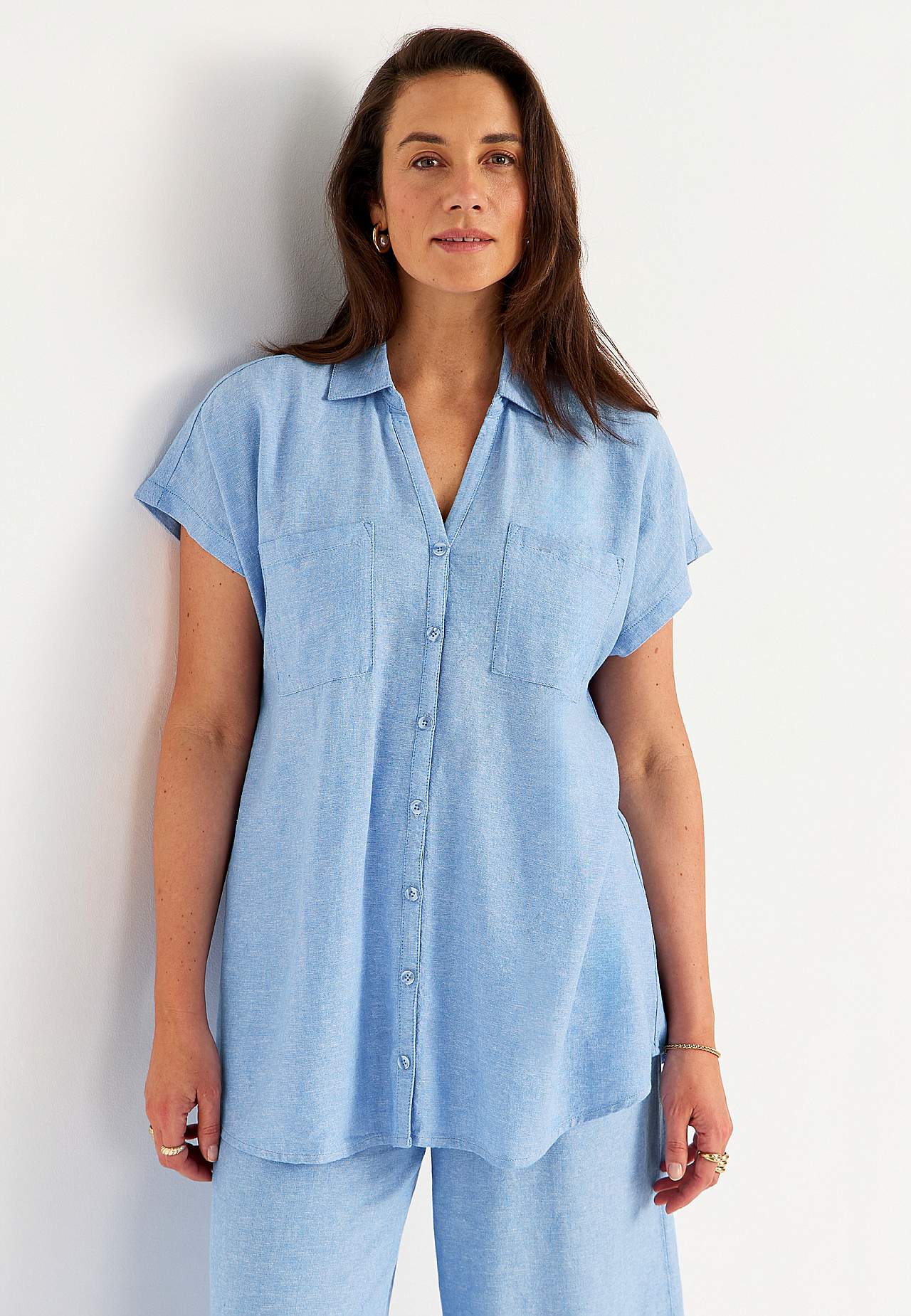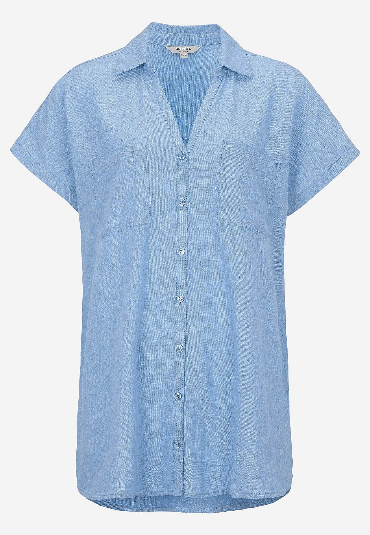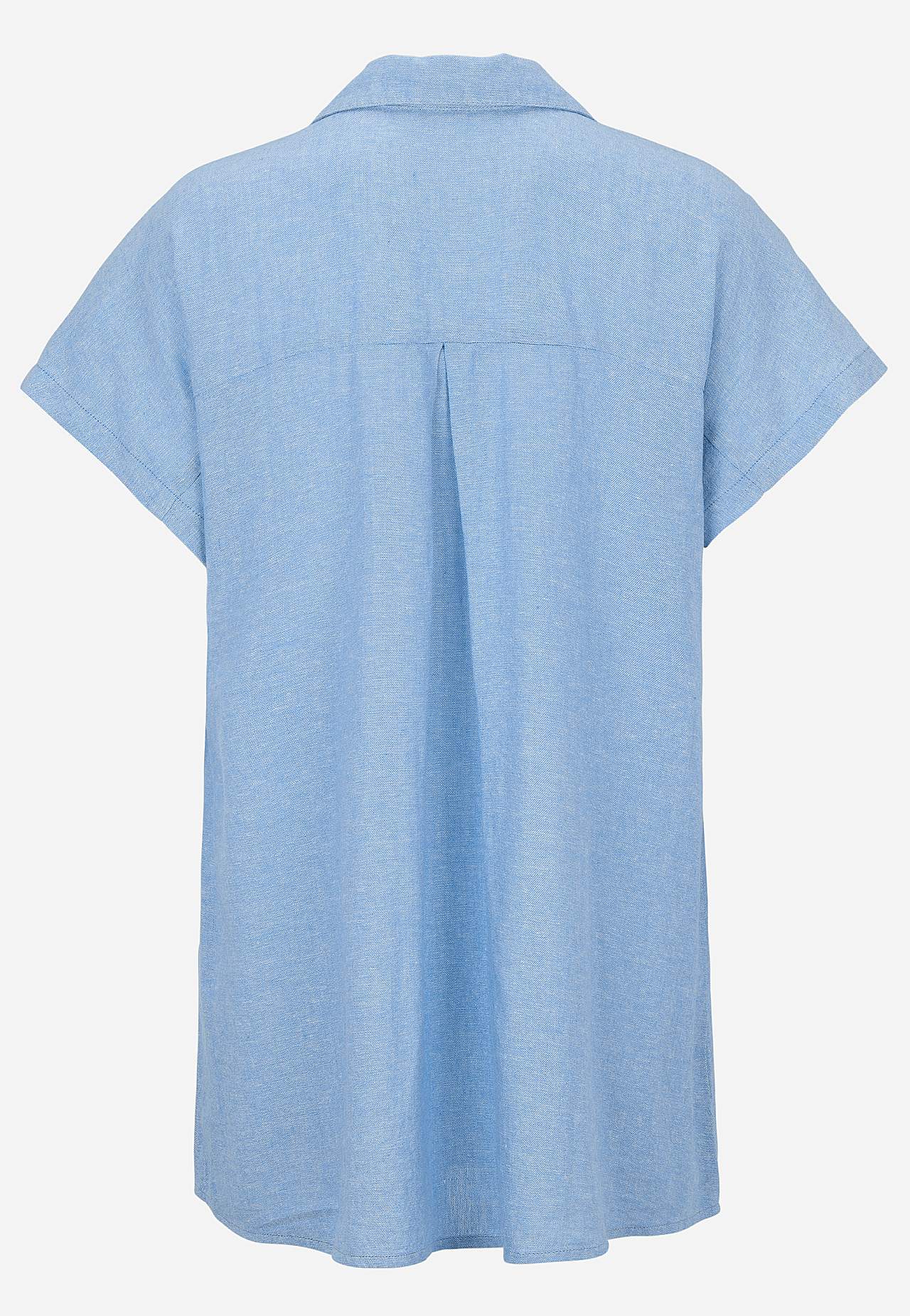 Vävd långskjorta i luftig linne- och viskosmix. Mjukt, lite kraftigare material med naturlig struktur. Ledig passform. Bröstfickor. Ok baktill med dekorativt veck. Rundad nederkant. Längden följer storleken ca 77-84 cm från axeln.