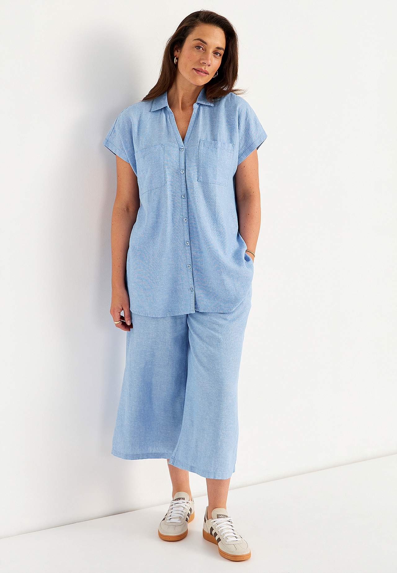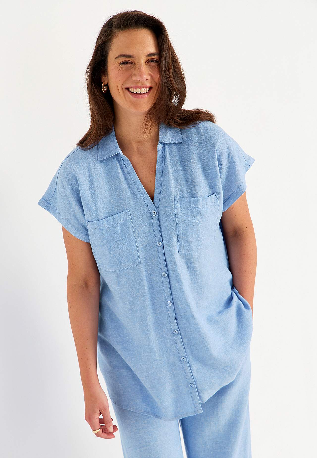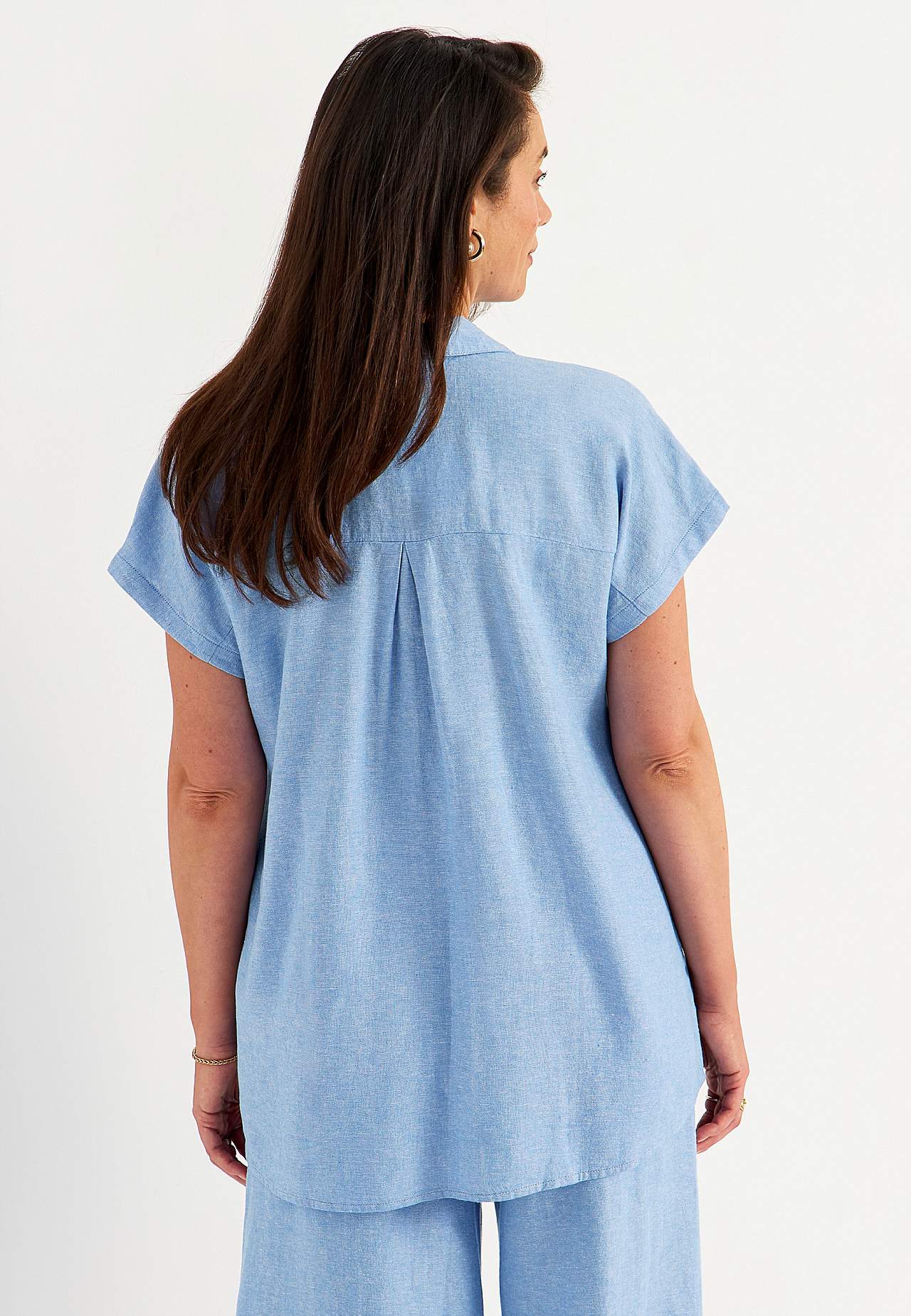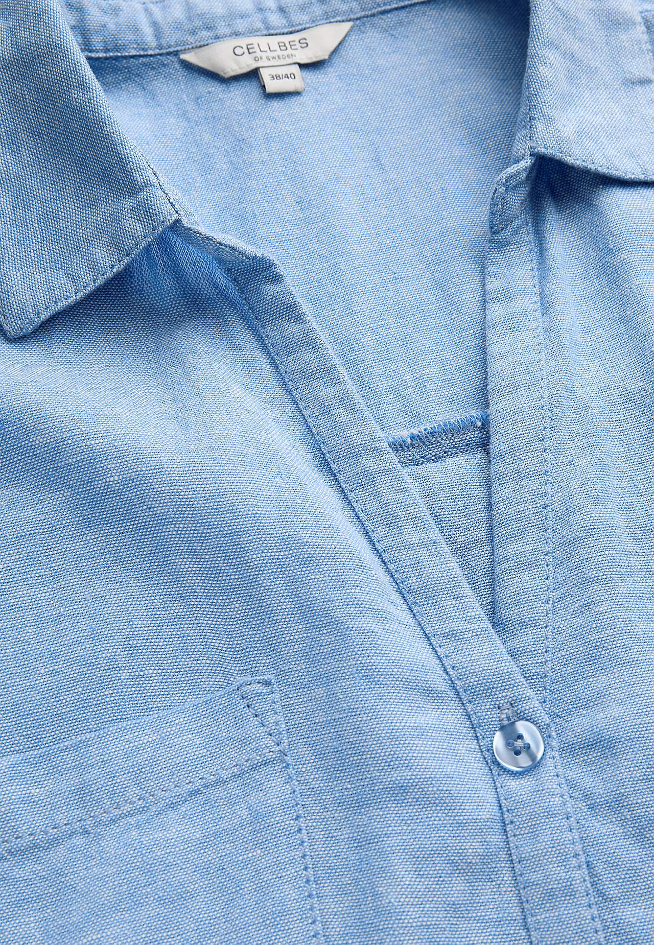 Vävd långskjorta i luftig linne- och viskosmix. Mjukt, lite kraftigare material med naturlig struktur. Ledig passform. Bröstfickor. Ok baktill med dekorativt veck. Rundad nederkant. Längden följer storleken ca 77-84 cm från axeln.