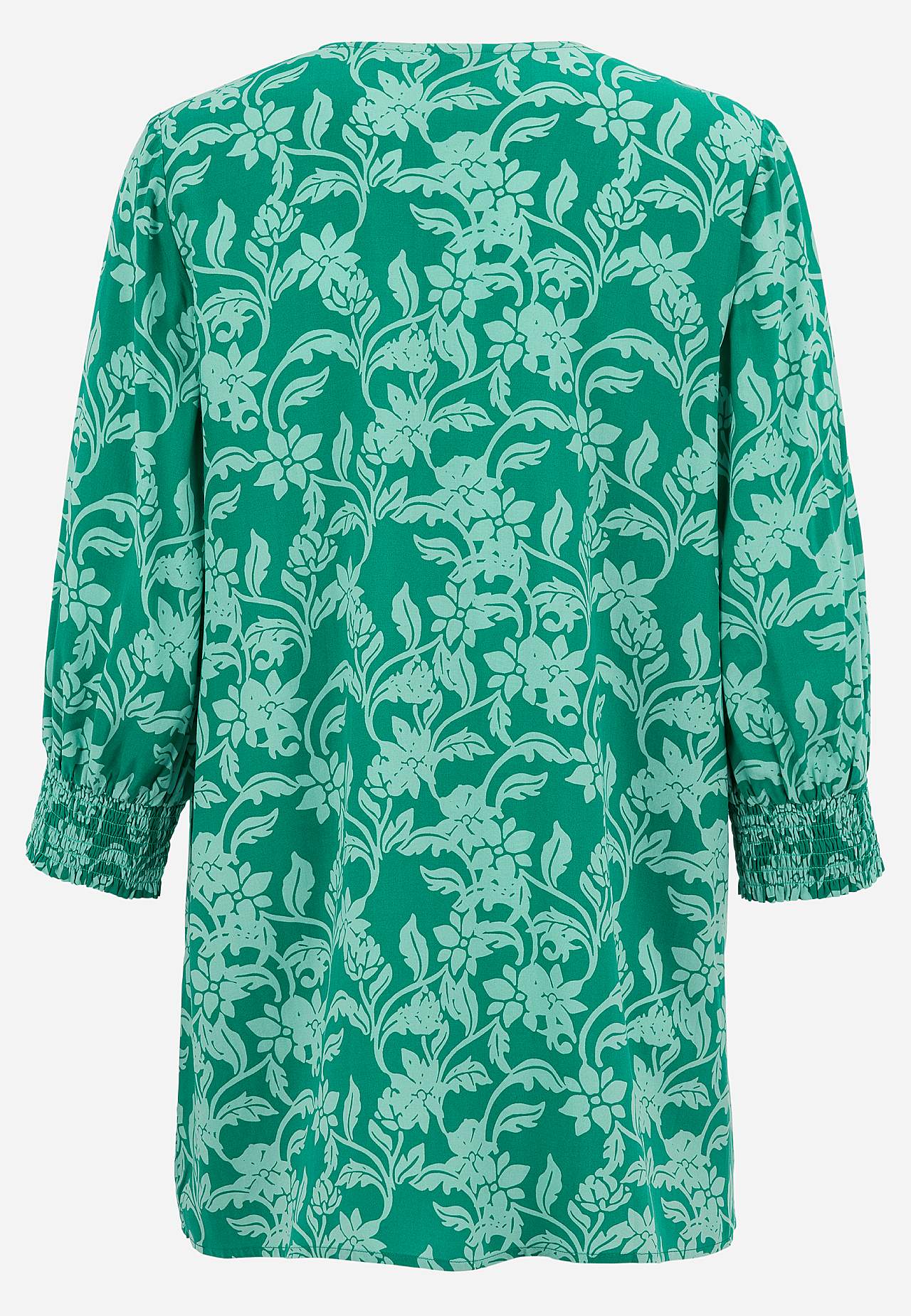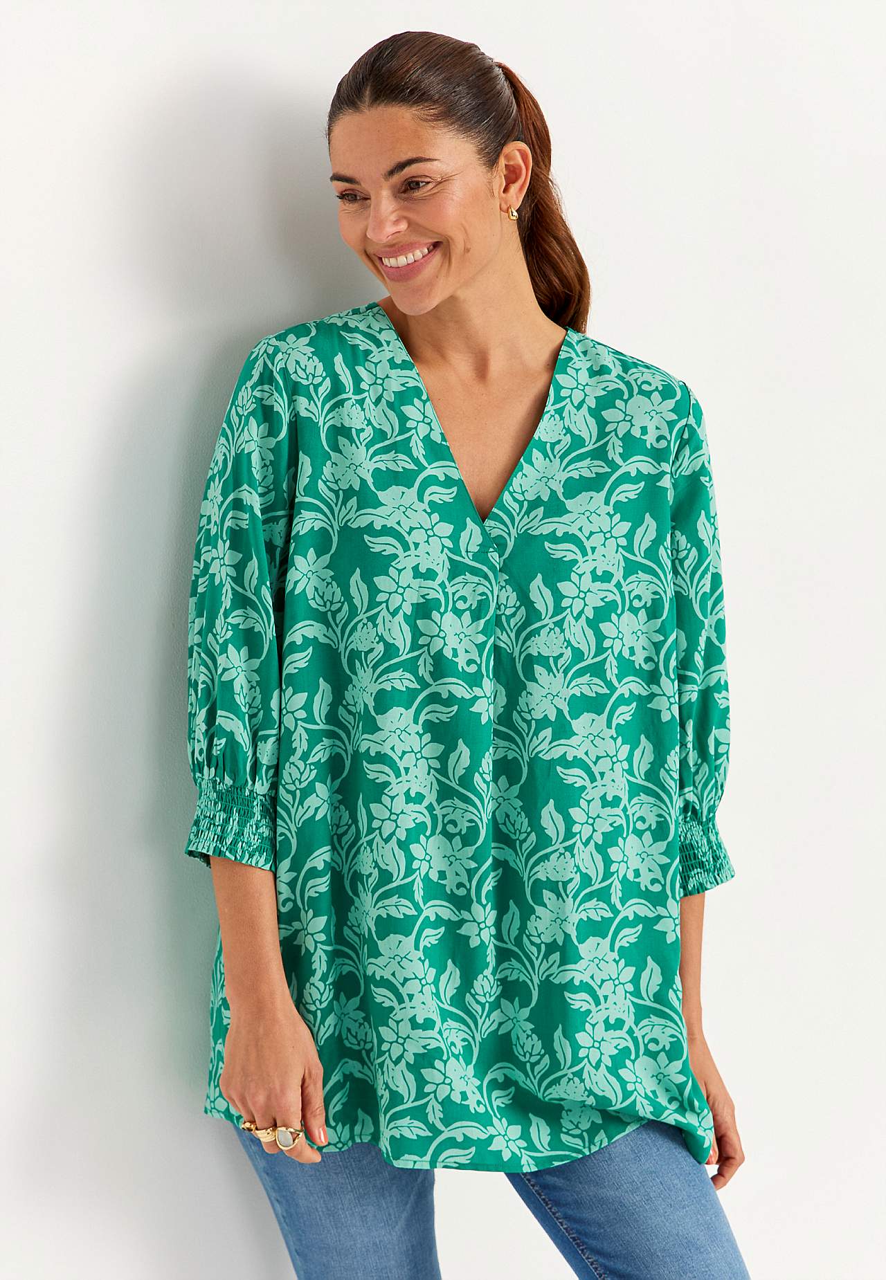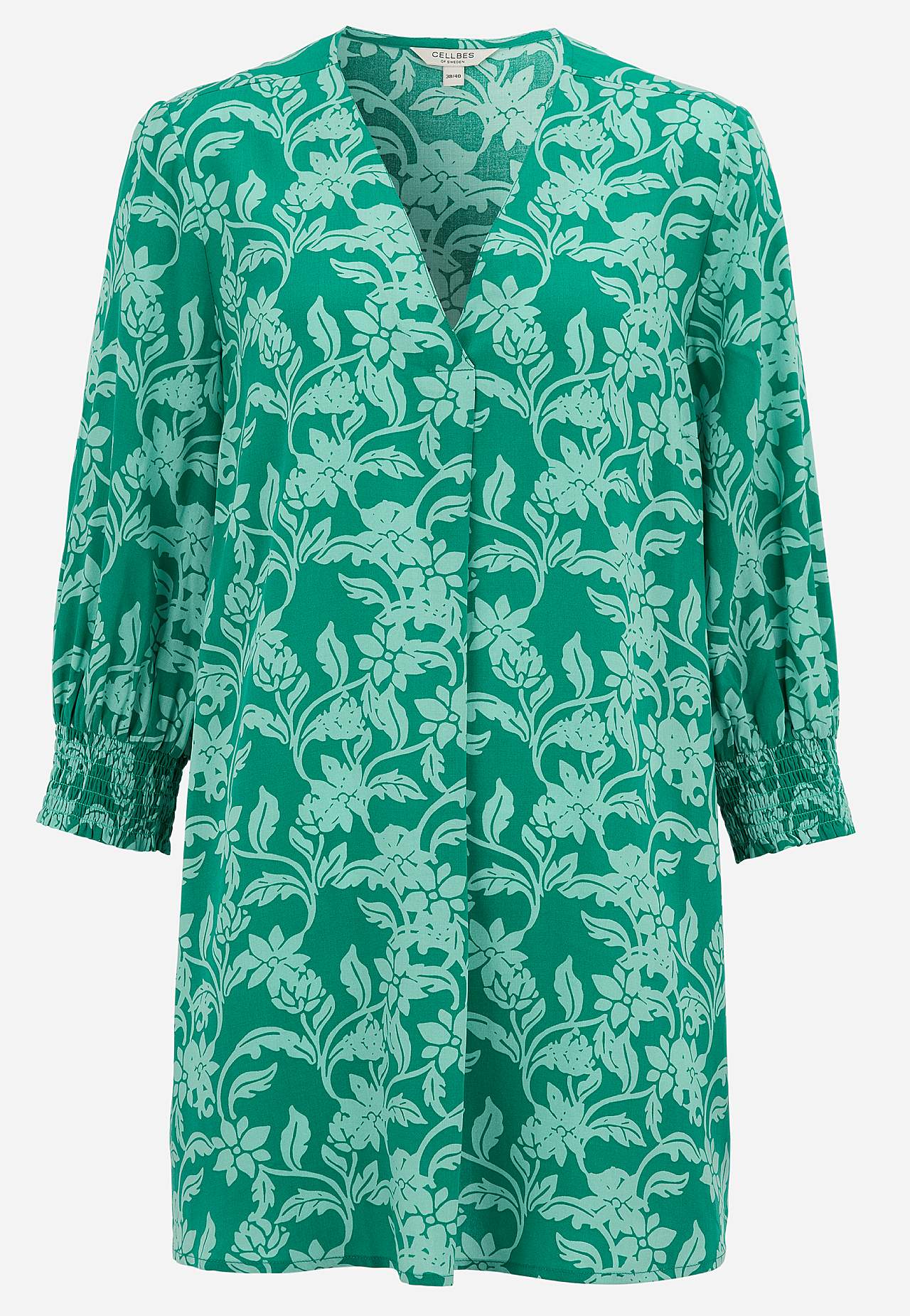 Vävd, mjuk tunika i följsam, sval viskos. A-linjeformad, något lösare passform. Överlappad v-ringning och smickrande veck fram. Rak nederkant. Rygglängden följer storleken ca 77-84 cm.