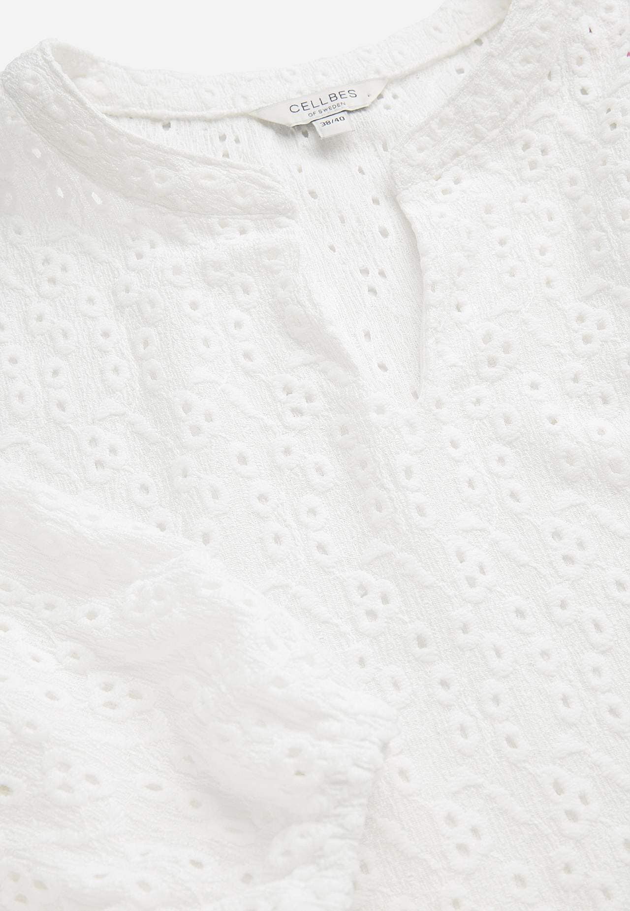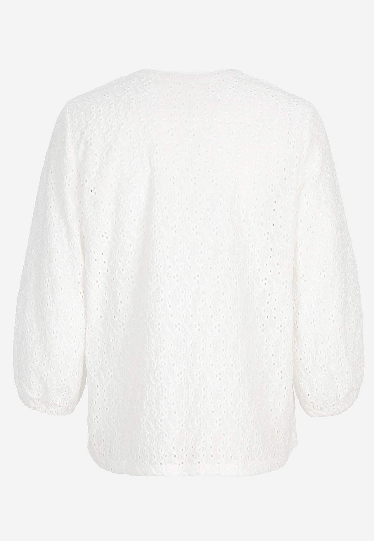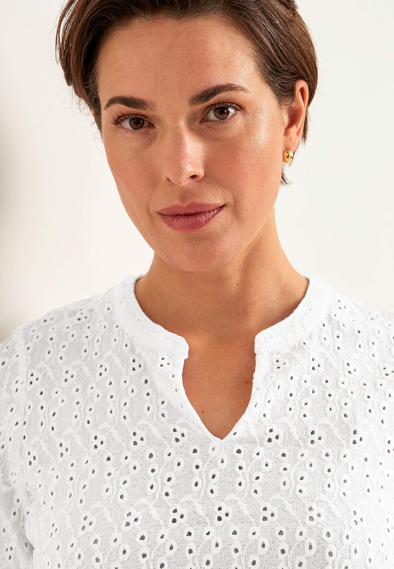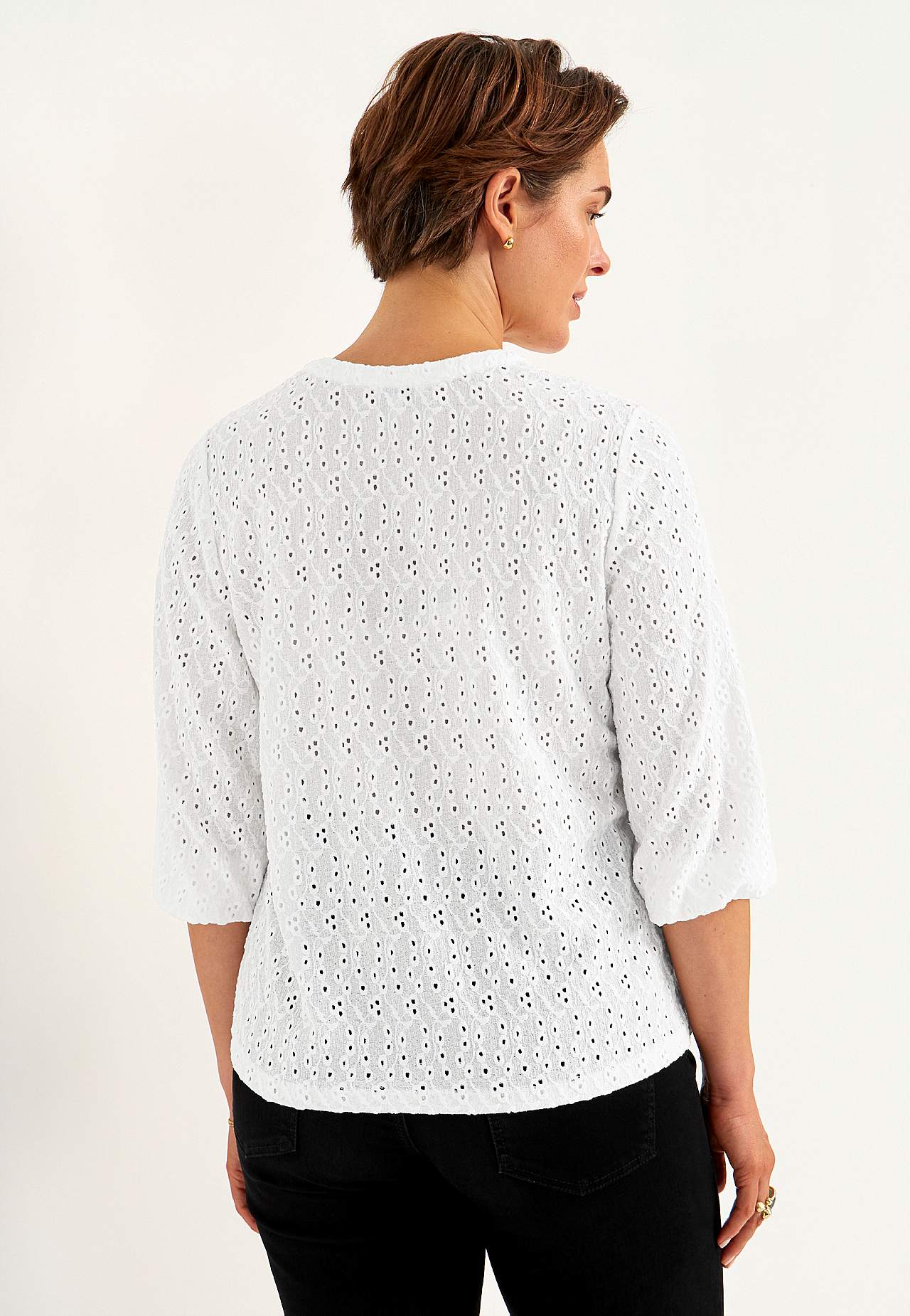 Strukturmönstrad, stretchig topp i broderie anglaise. Normal, något a-linjeformad passform. Rund hals med v-skärning framtill. Trekvartslånga, vida ärmar med resår i ärmsluten. Lätt rundad nederkant. Rygglängden följer storleken ca 61-75 cm.
