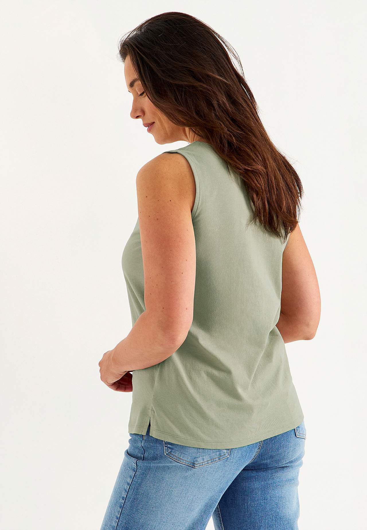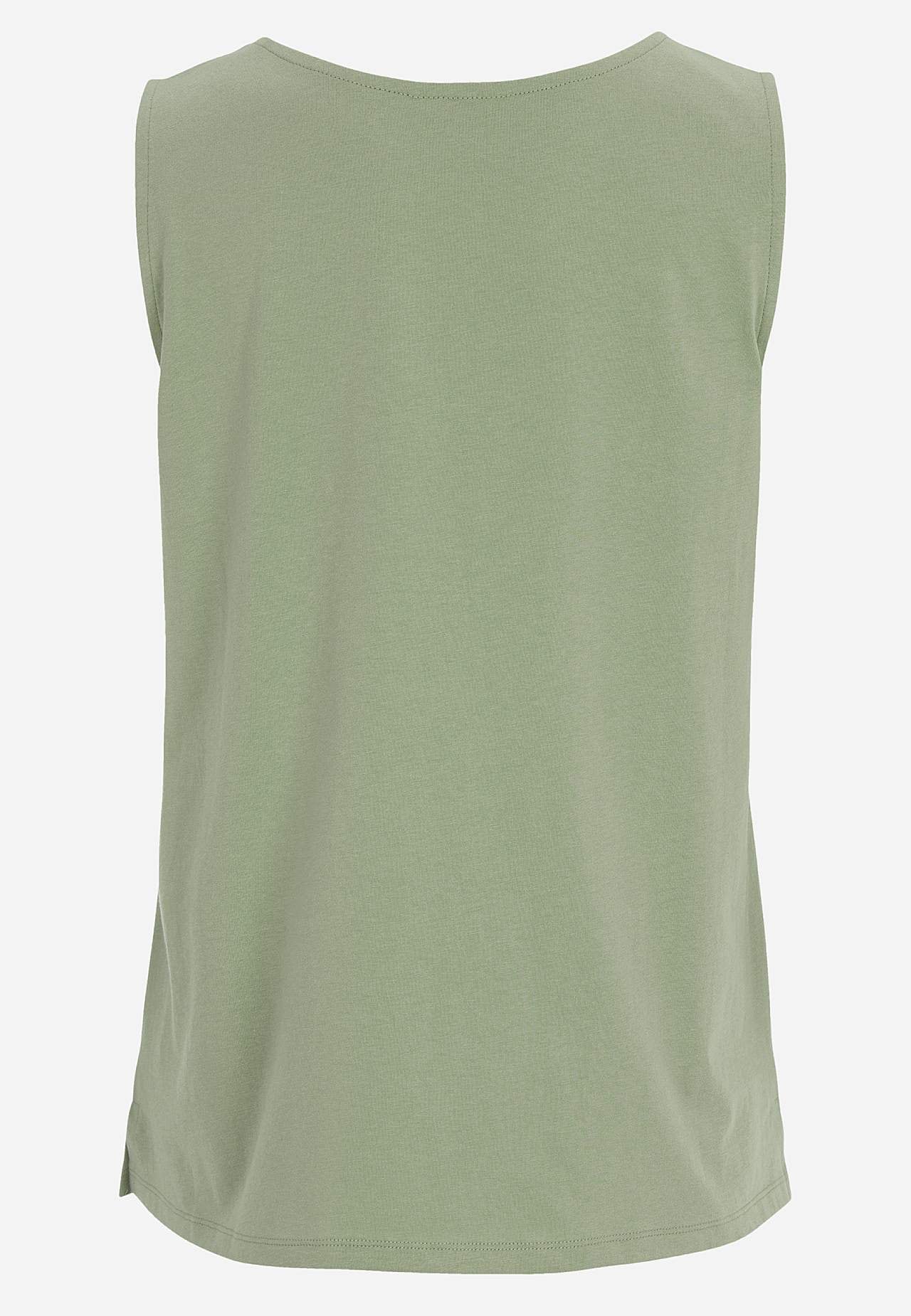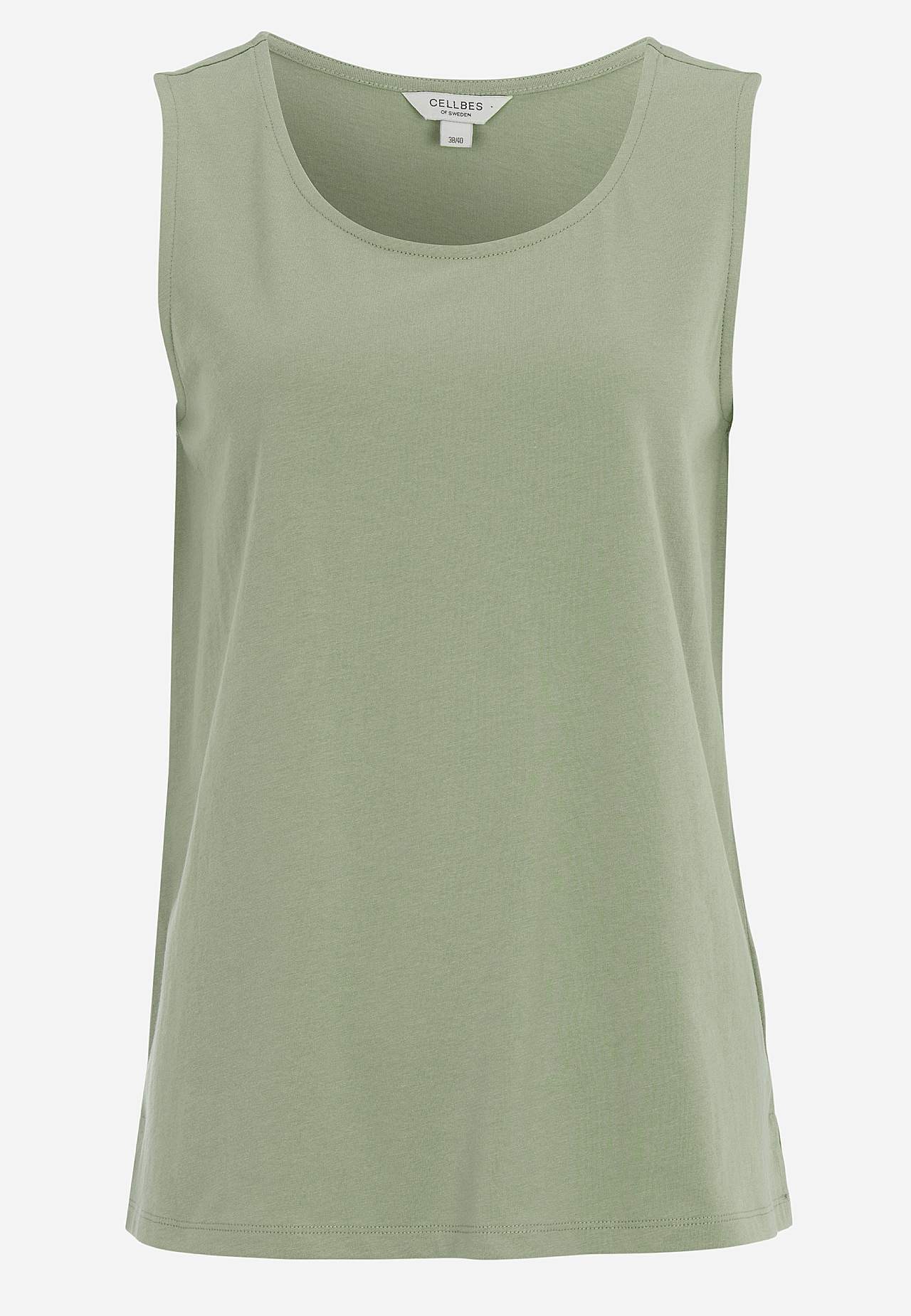 Trikålinne med breda axelband. Ekologisk, skön bomull. A-linjeformad passform. Rund halsringning. Rak nederkant med slits i sidorna. Längden följer storleken ca 62-77 cm från axeln bak.