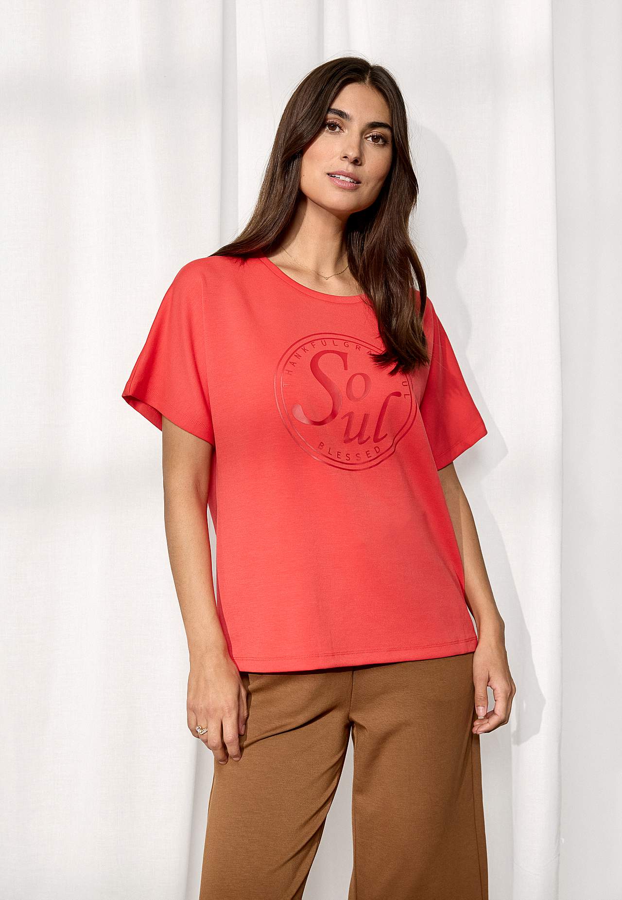 Topp i härligt mjuk modalmix och något kraftigare trikå. Rymlig passform. Texttryck fram. Korta ärmar. Rak nederkant. Längd från axeln ca 61 cm cm i storlek S (38).