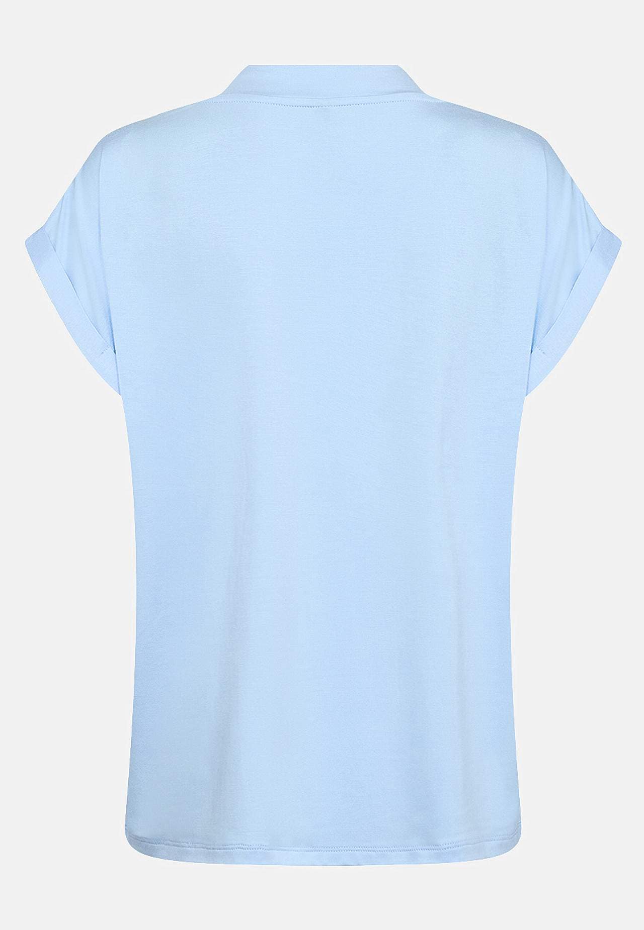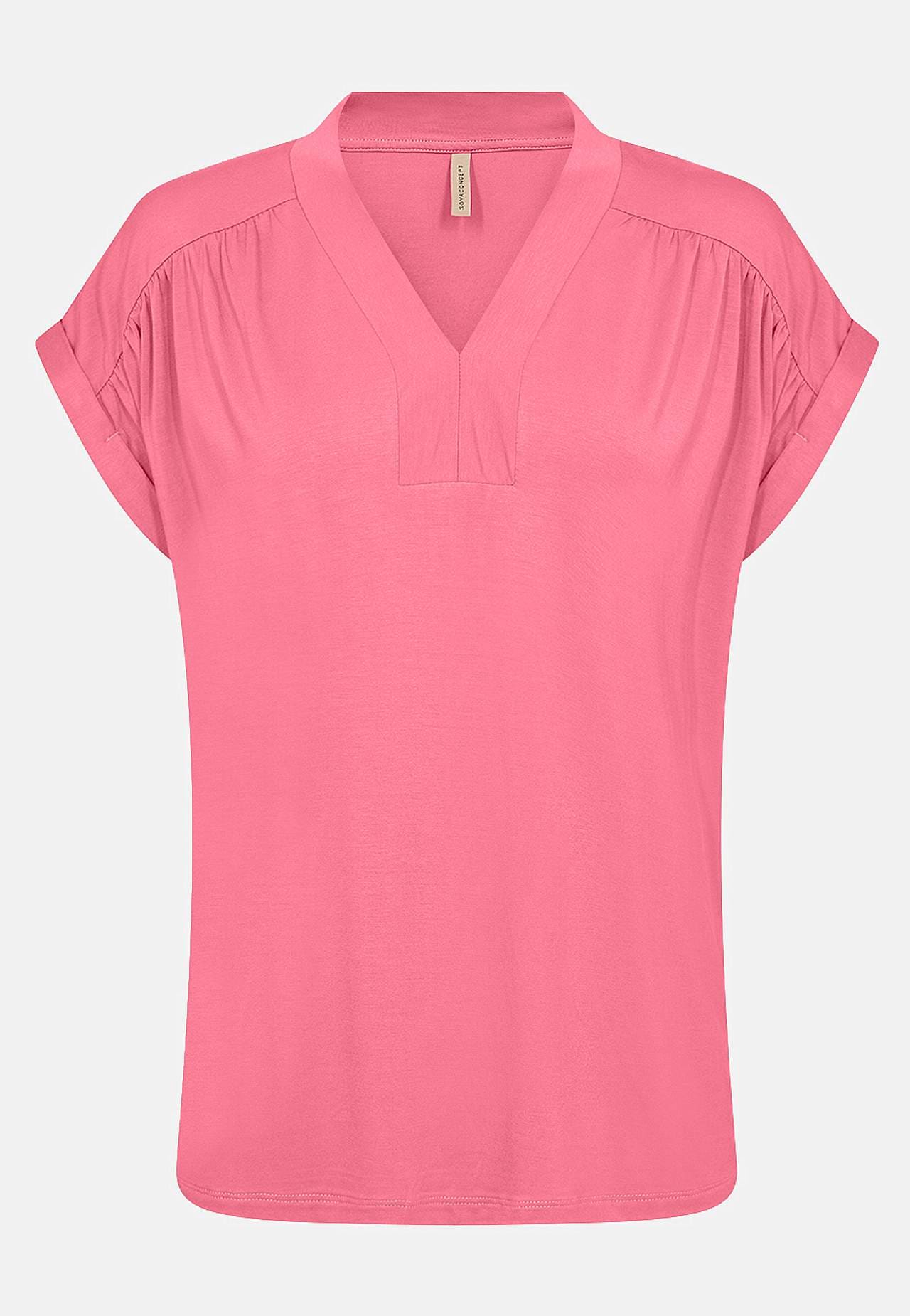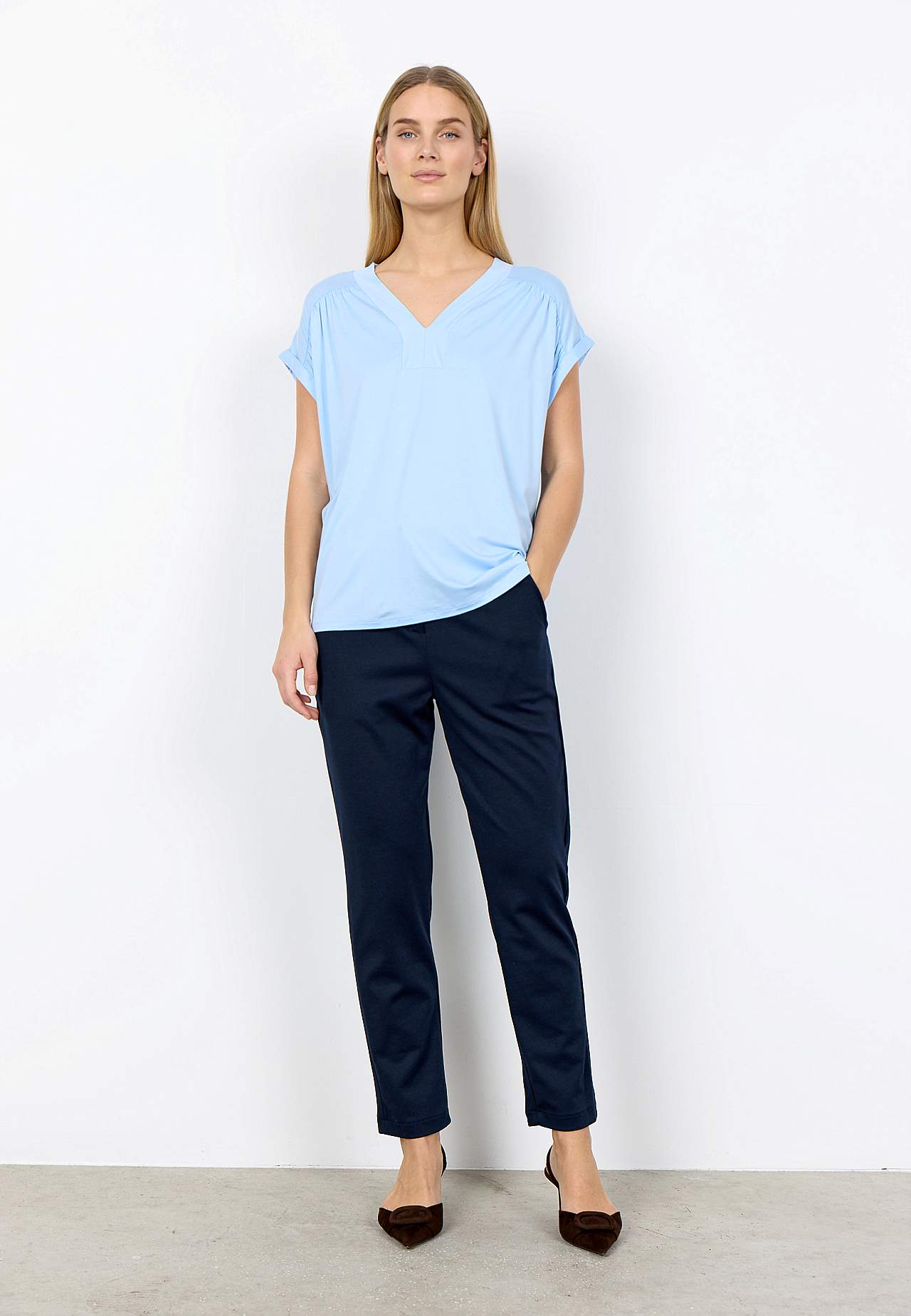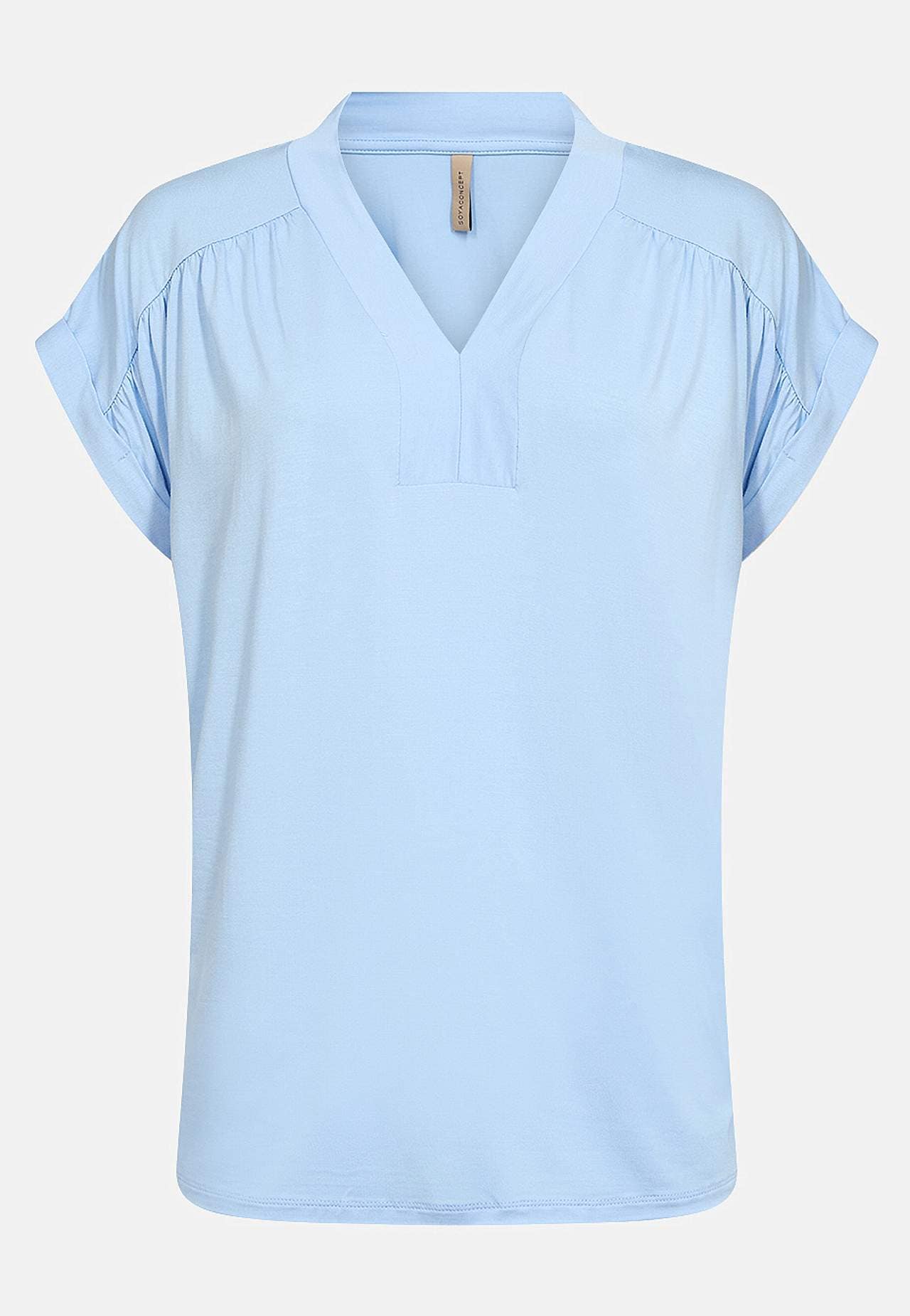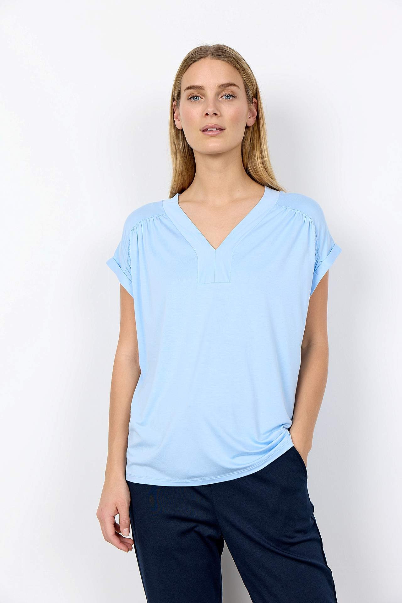 Enfärgad, supermjuk trikåtopp i lyocell. Normal passform. V-ringad hals. Rynkdetalj på axlarna. Uppvikta holkärmar. Rak nederkant. Längd från axeln ca 62 cm i storlek S(38).
