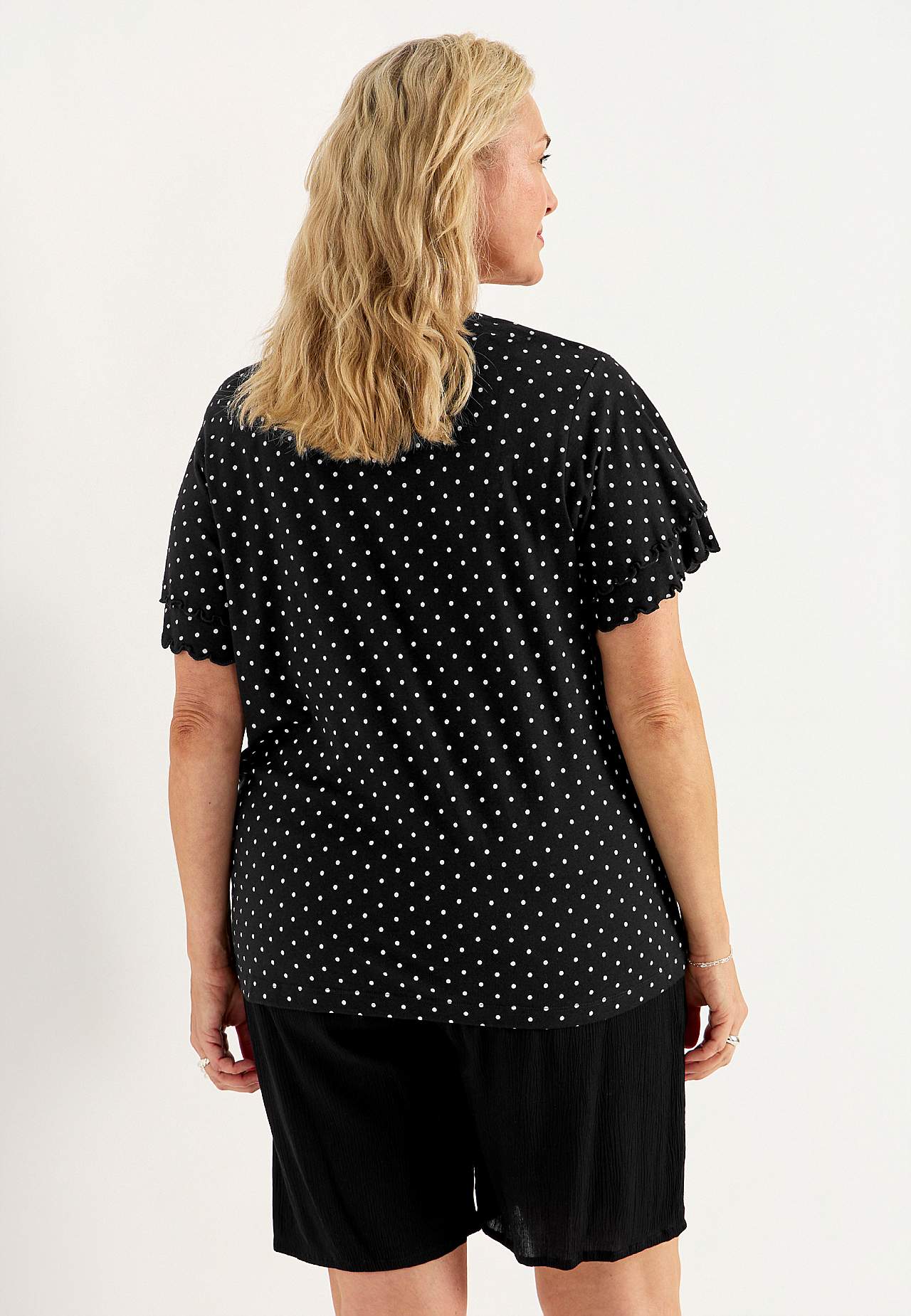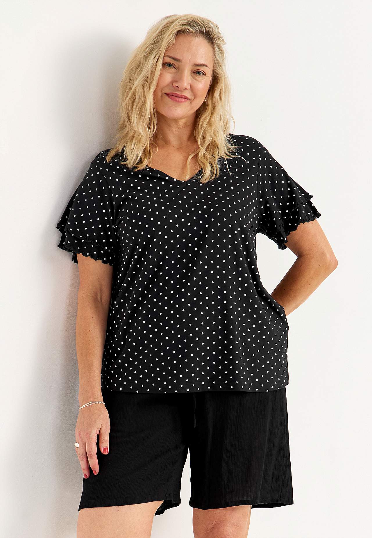 Topp med feminina fjärilsärmar. Mjuk trikå i bomull- och viskosblandning. Lätt a-linjeformad passform. V-ringad halsringning. Korta fjärilsärmar med dubbelt lager och overlockade, dekorativa sömmar. Lätt rundad nederkant. Rygglängden följer storleken ca 65-73 cm.
