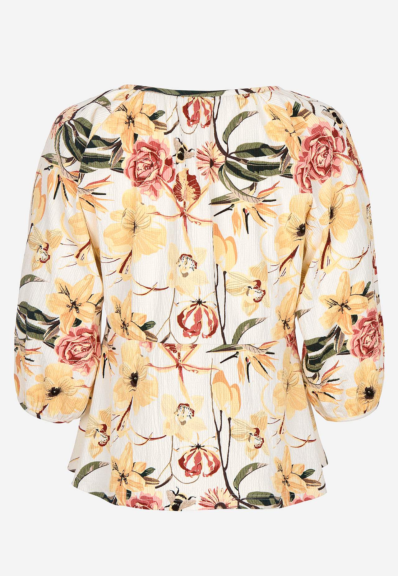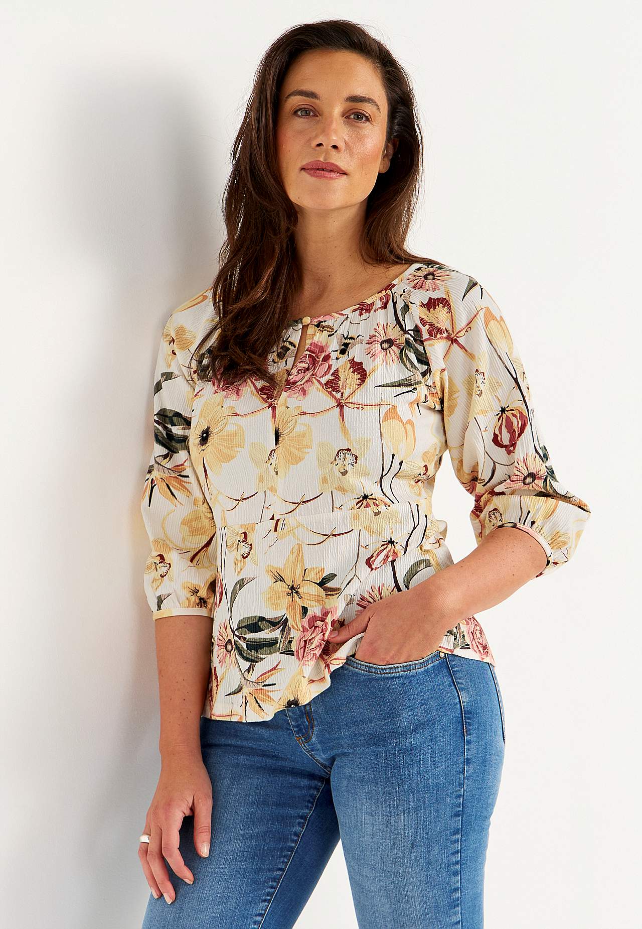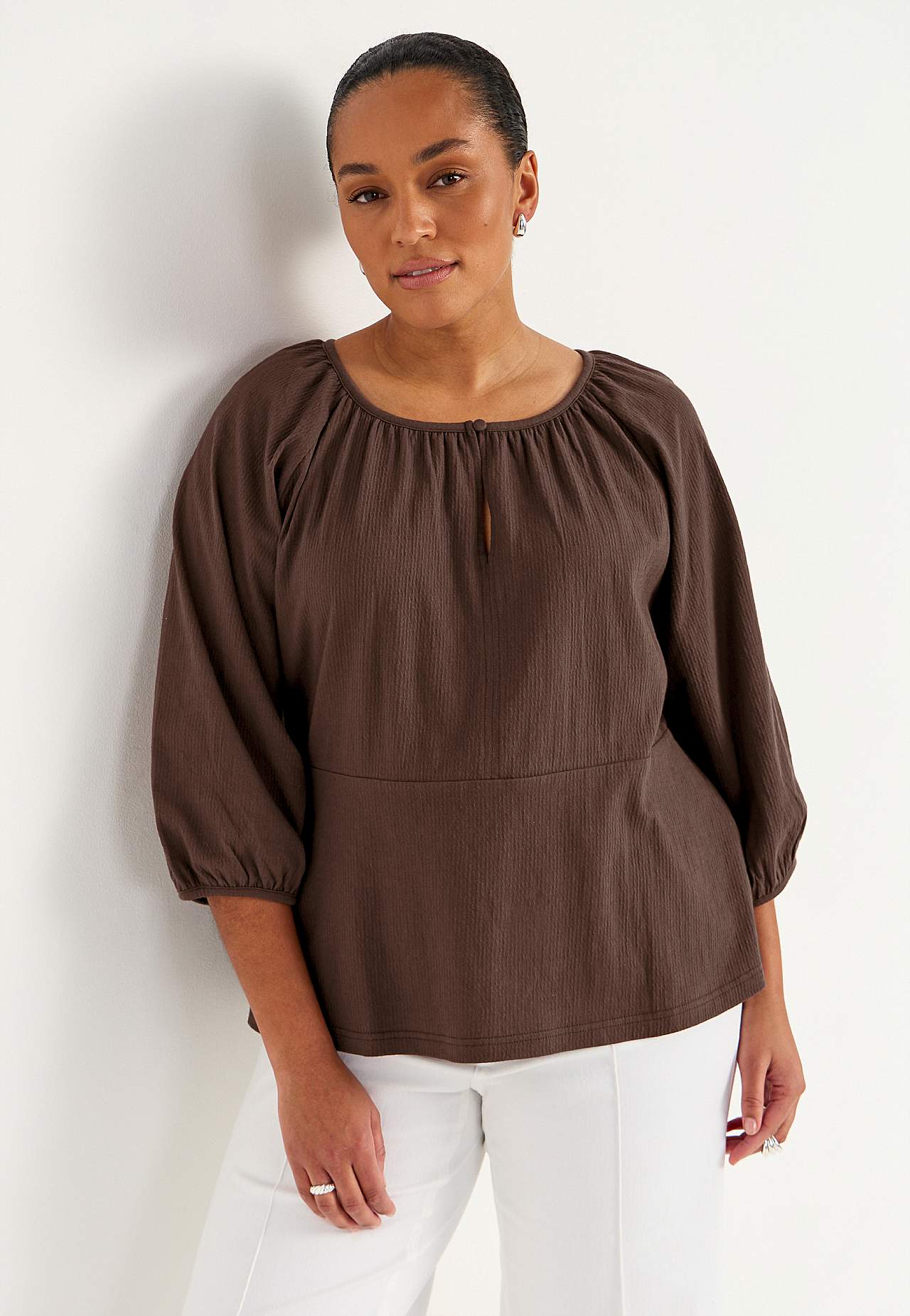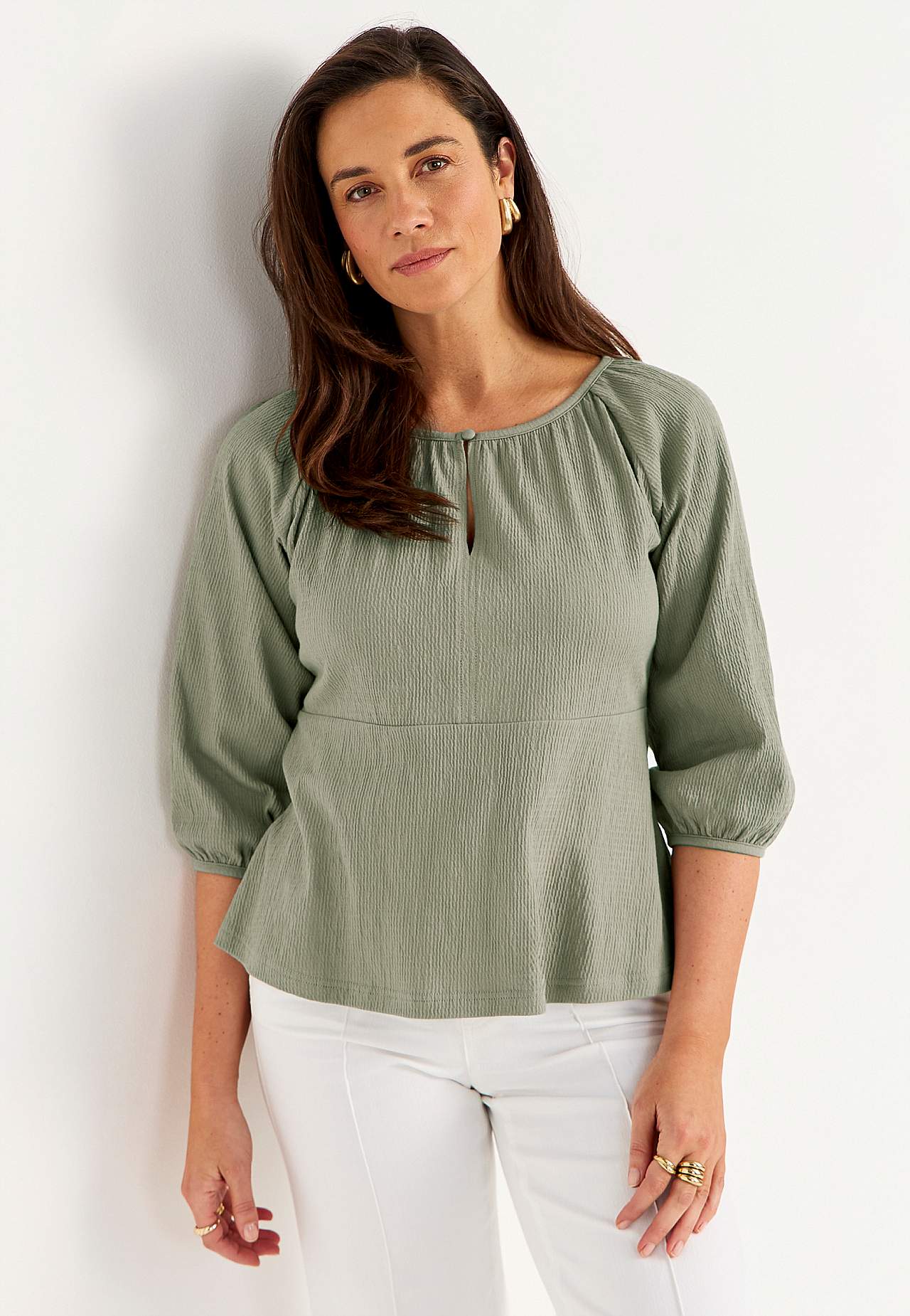 Stretchig, mjuk topp med vågig struktur och peplum-design. Figurnära passform upptill med markerad midja och utsvängd nederdel. Rundad hals med liten, klädd knapp och slits. 3/4-långa, vida raglanärmar med dold resår i ärmsluten. Rundad nederkant. Rygglängden följer storleken ca 60-72 cm cm.