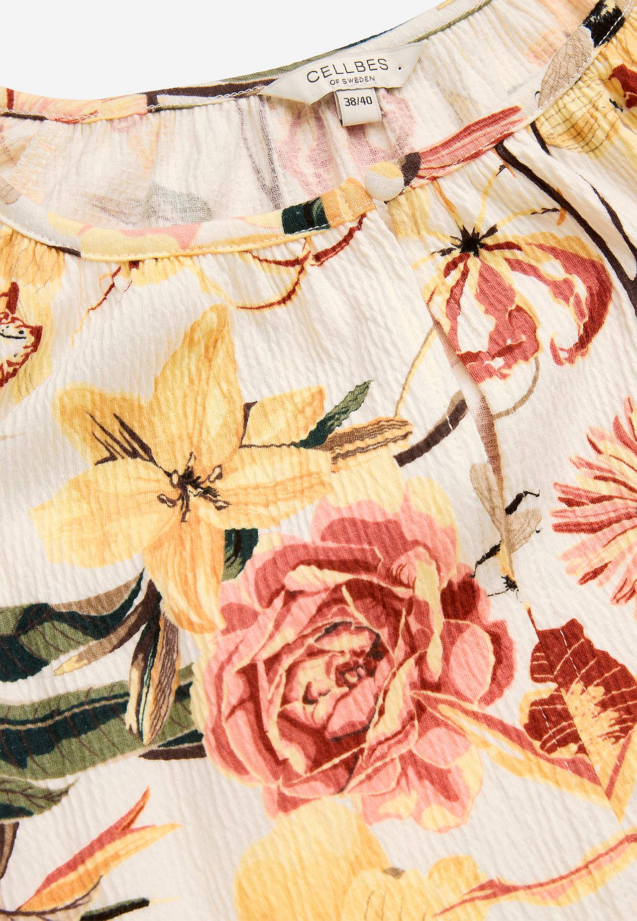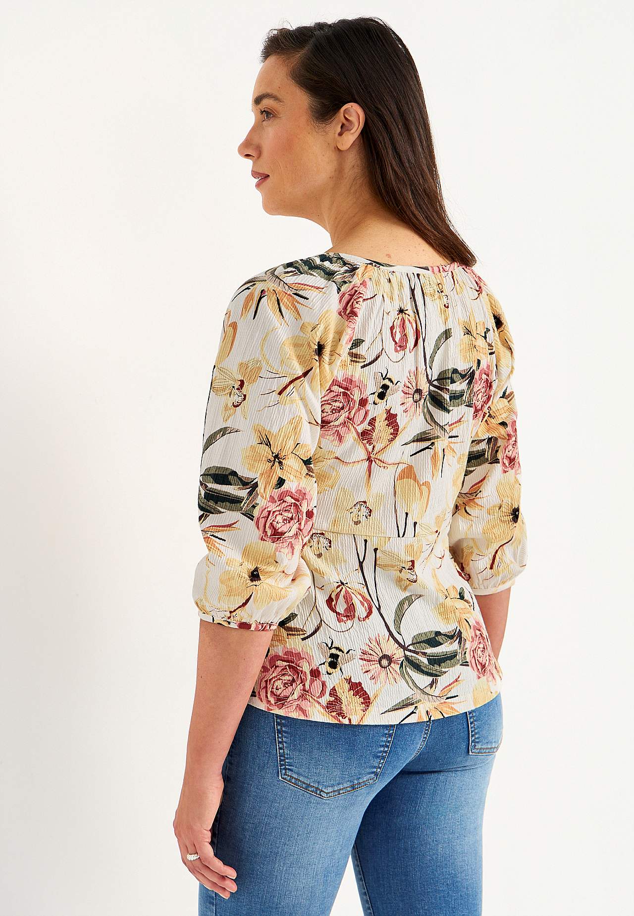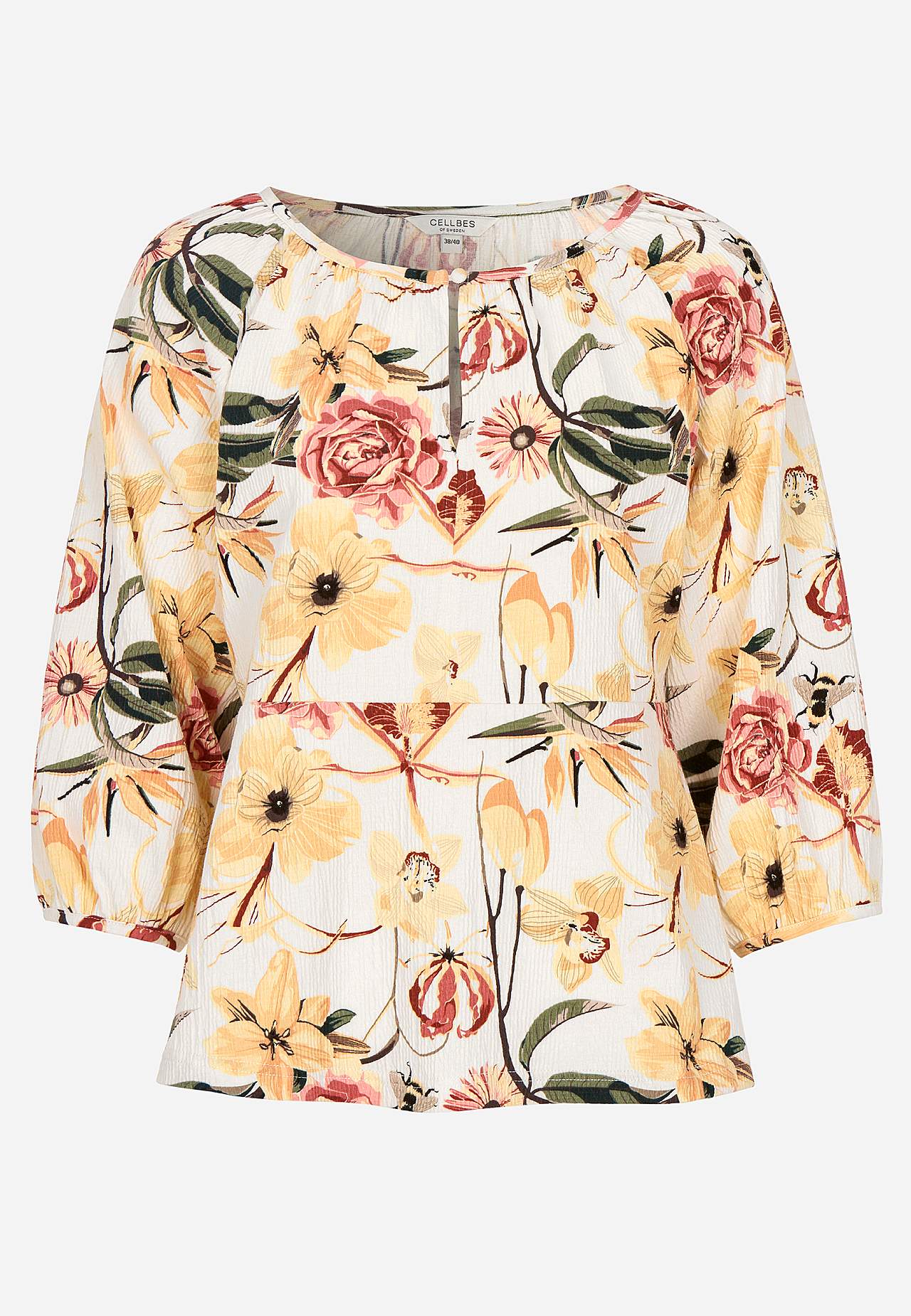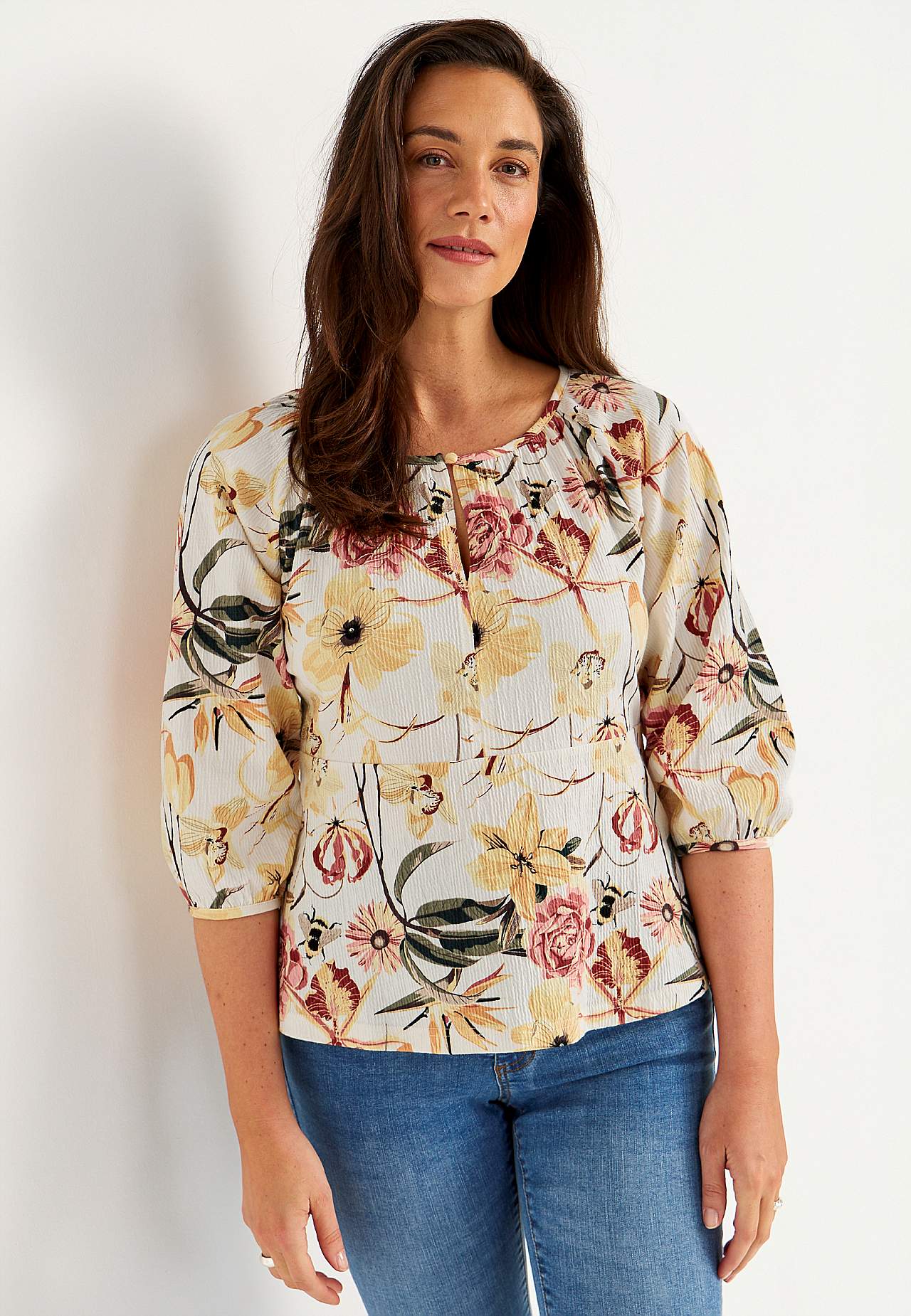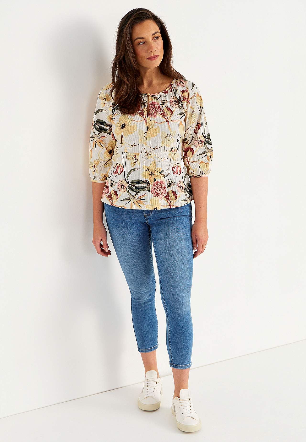 Stretchig, mjuk topp med vågig struktur och peplum-design. Figurnära passform upptill med markerad midja och utsvängd nederdel. Rundad hals med liten, klädd knapp och slits. 3/4-långa, vida raglanärmar med dold resår i ärmsluten. Rundad nederkant. Rygglängden följer storleken ca 60-72 cm cm.