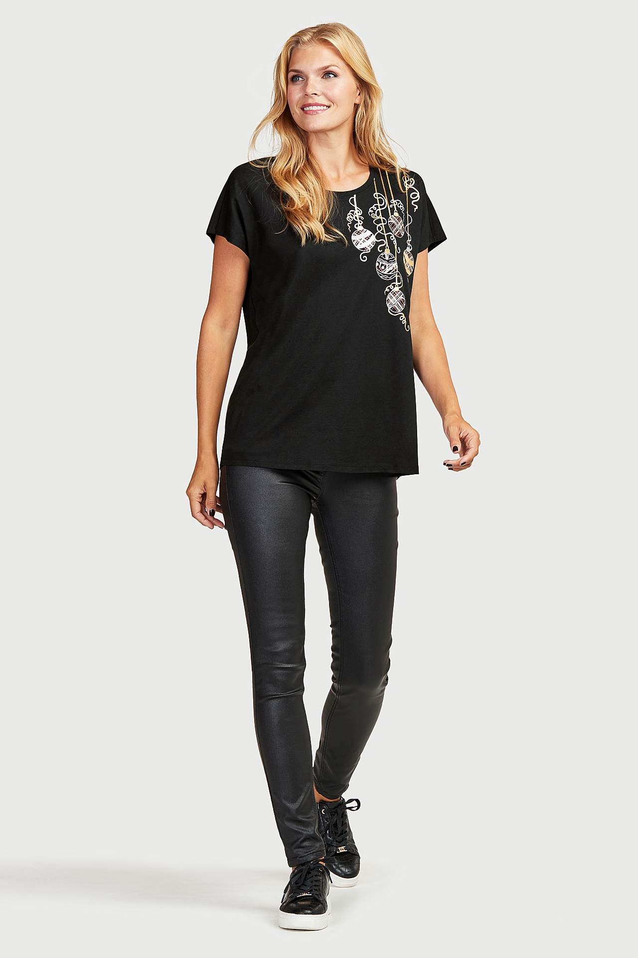 Trikåtopp med ett glansigt mönster perfekt för alla festligheter. Rak modell med en rundhals, korta holkärmar, rundad nederkant och en lite längre baksida. Längden följer storleken ca 70-77 cm från axeln bak.