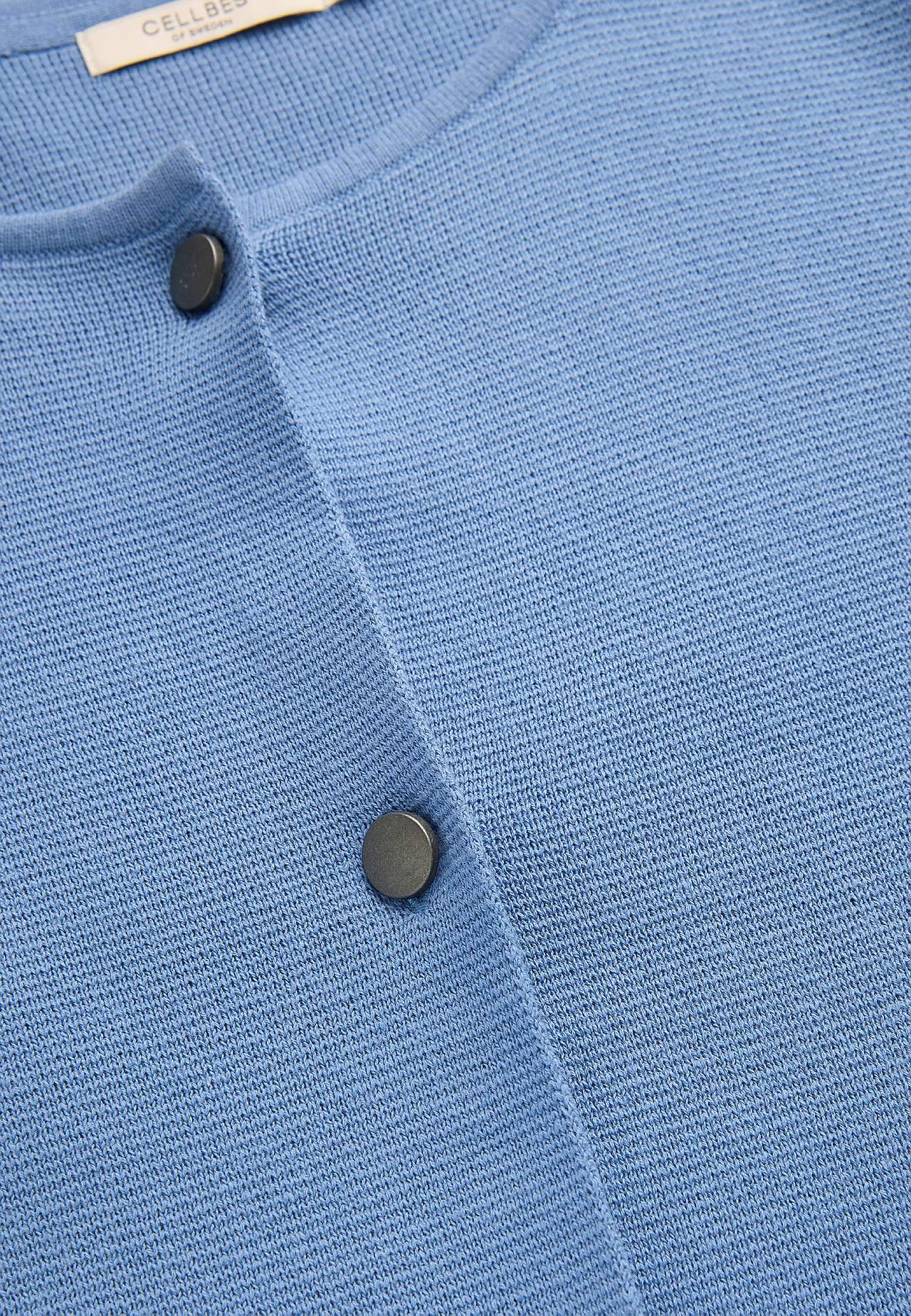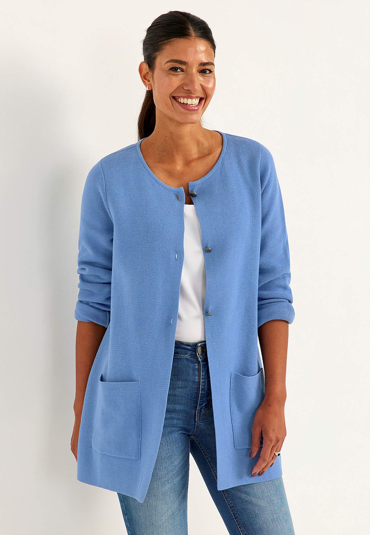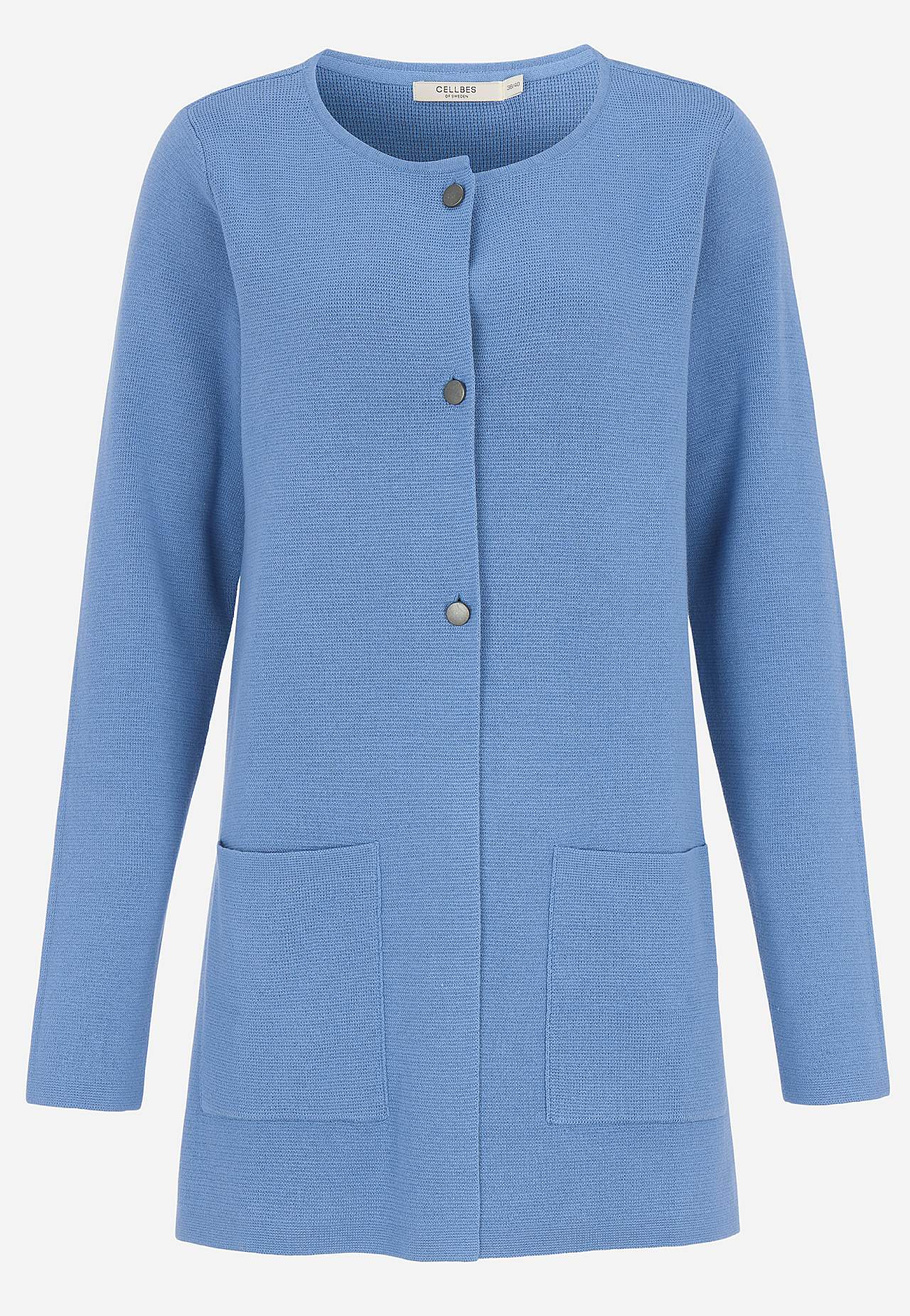Finstickad cardigan i formfast, mjuk bomullskvalitet med fin struktur. Enkel, stilren design perfekt året om. Något längre modell med fickor framtill. Rak passform. Tre antiksilvriga knappar. Längden följer storleken ca 77-86 cm från axeln.