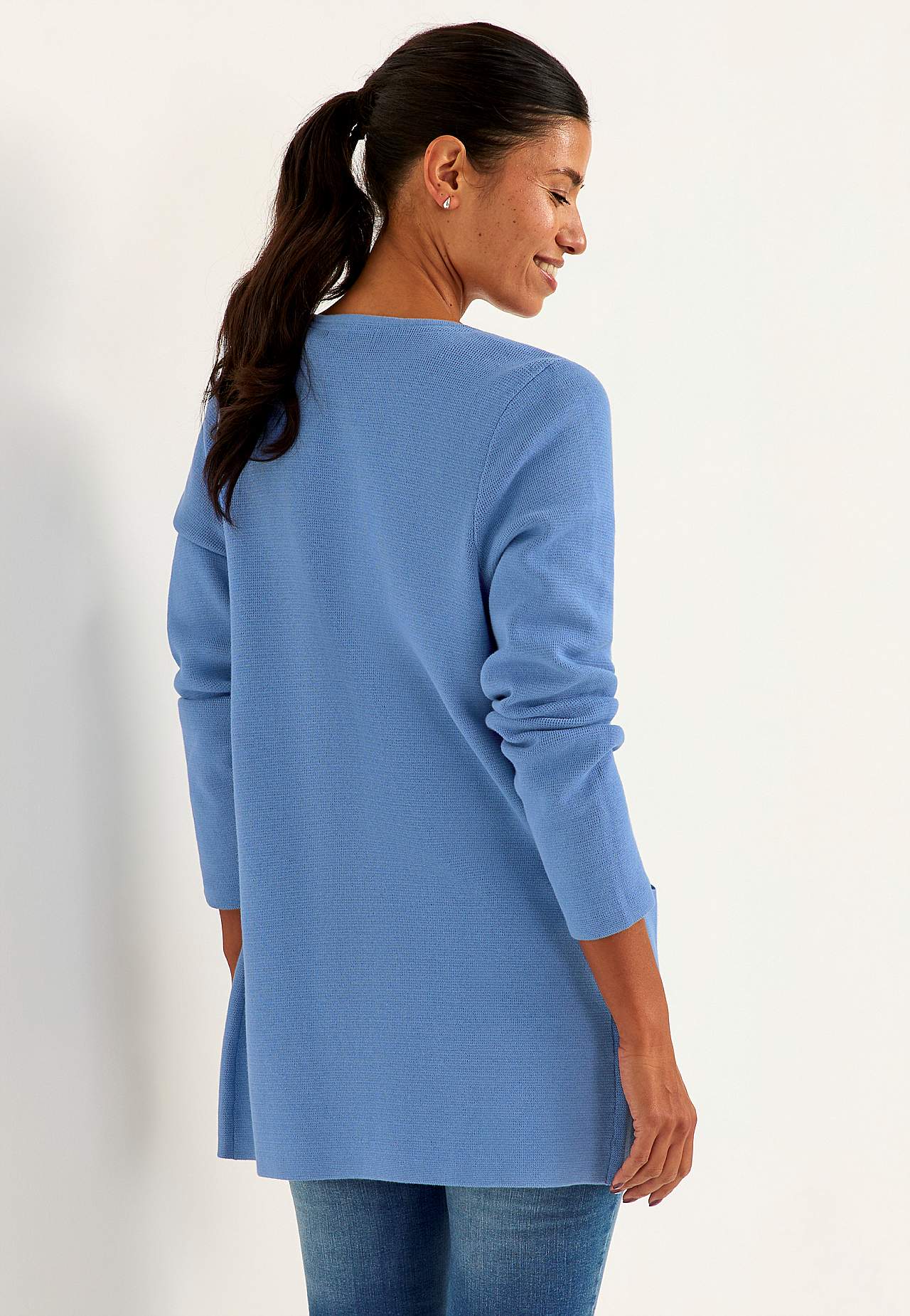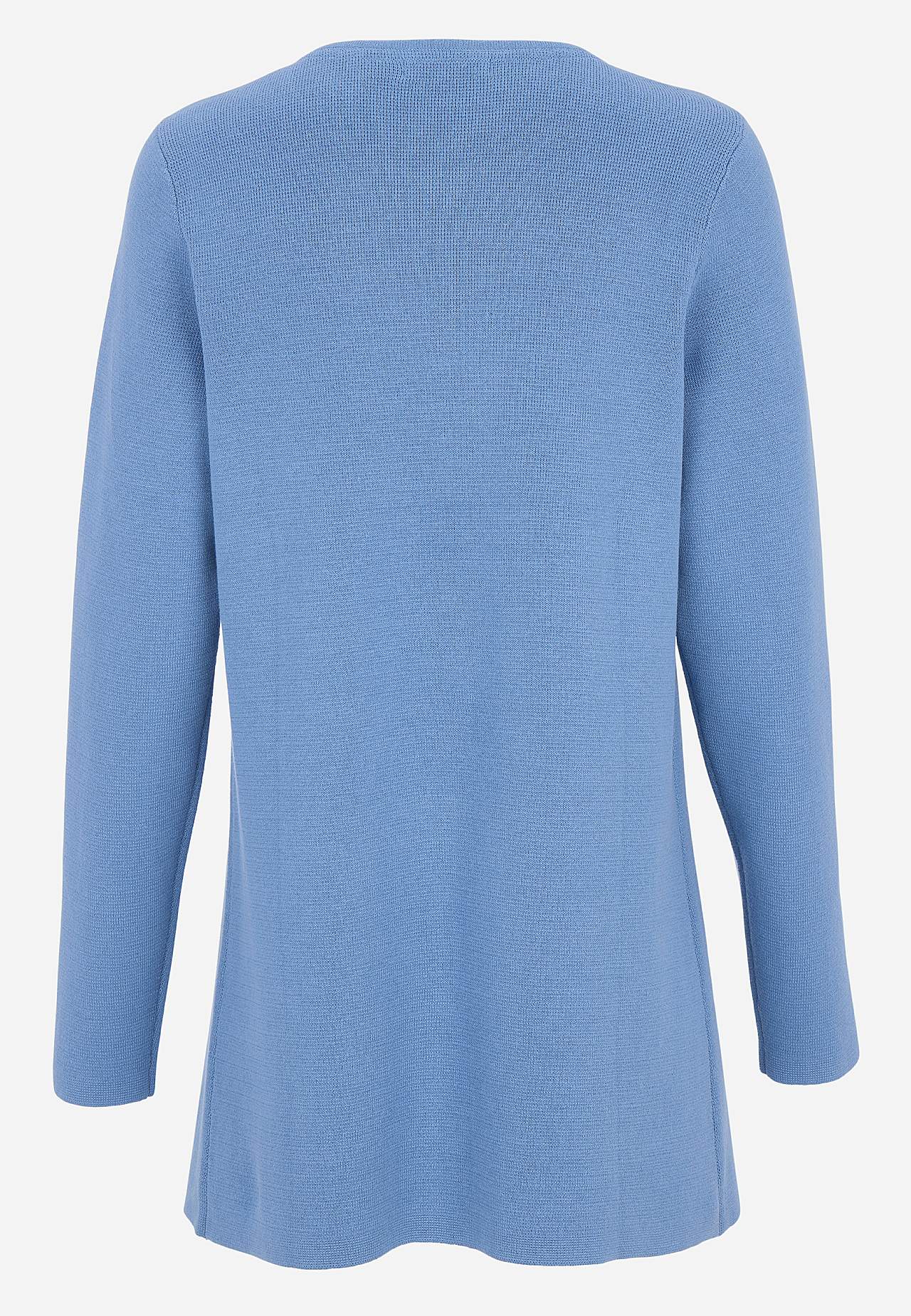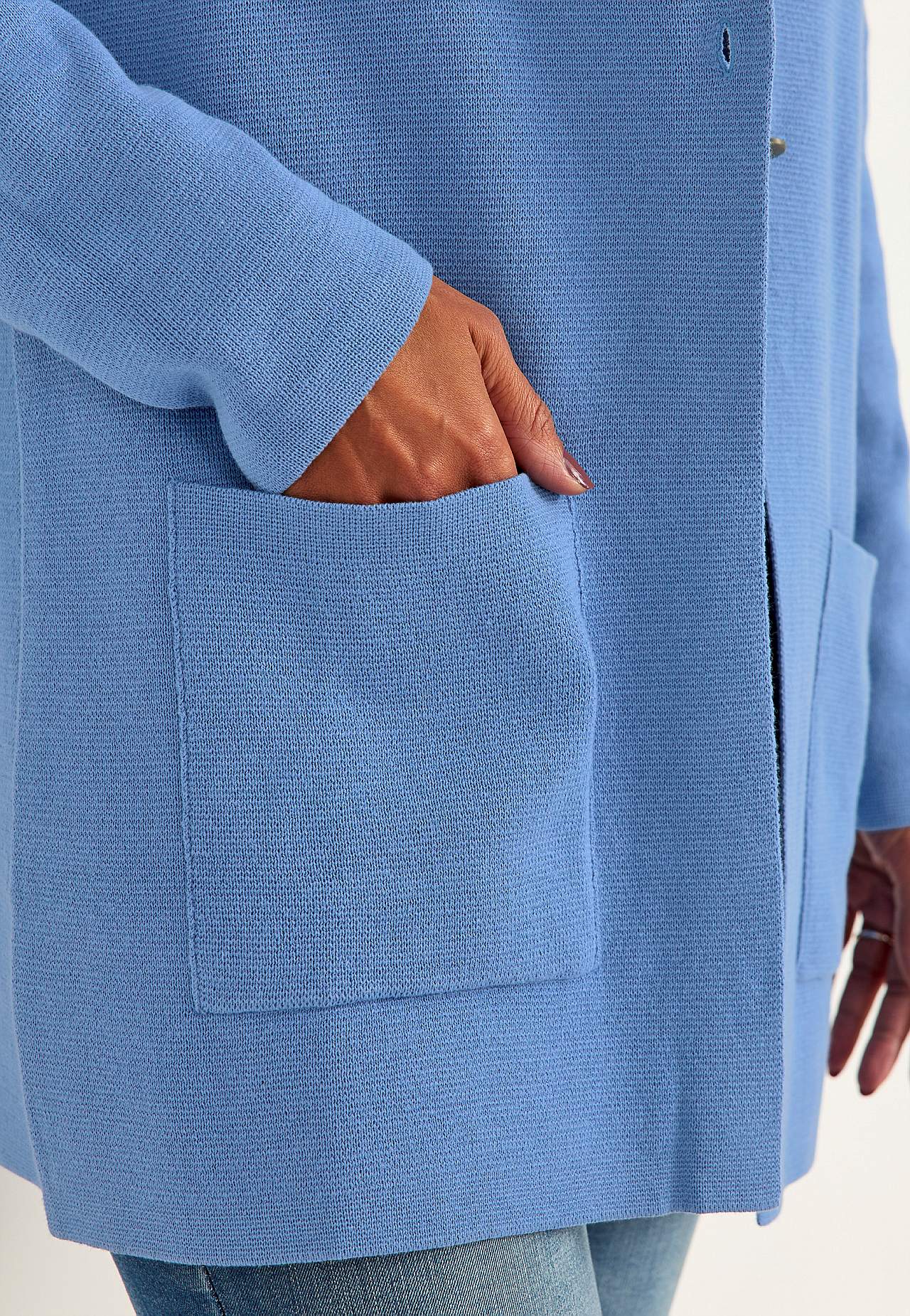 Finstickad cardigan i formfast, mjuk bomullskvalitet med fin struktur. Enkel, stilren design perfekt året om. Något längre modell med fickor framtill. Rak passform. Tre antiksilvriga knappar. Längden följer storleken ca 77-86 cm från axeln.
