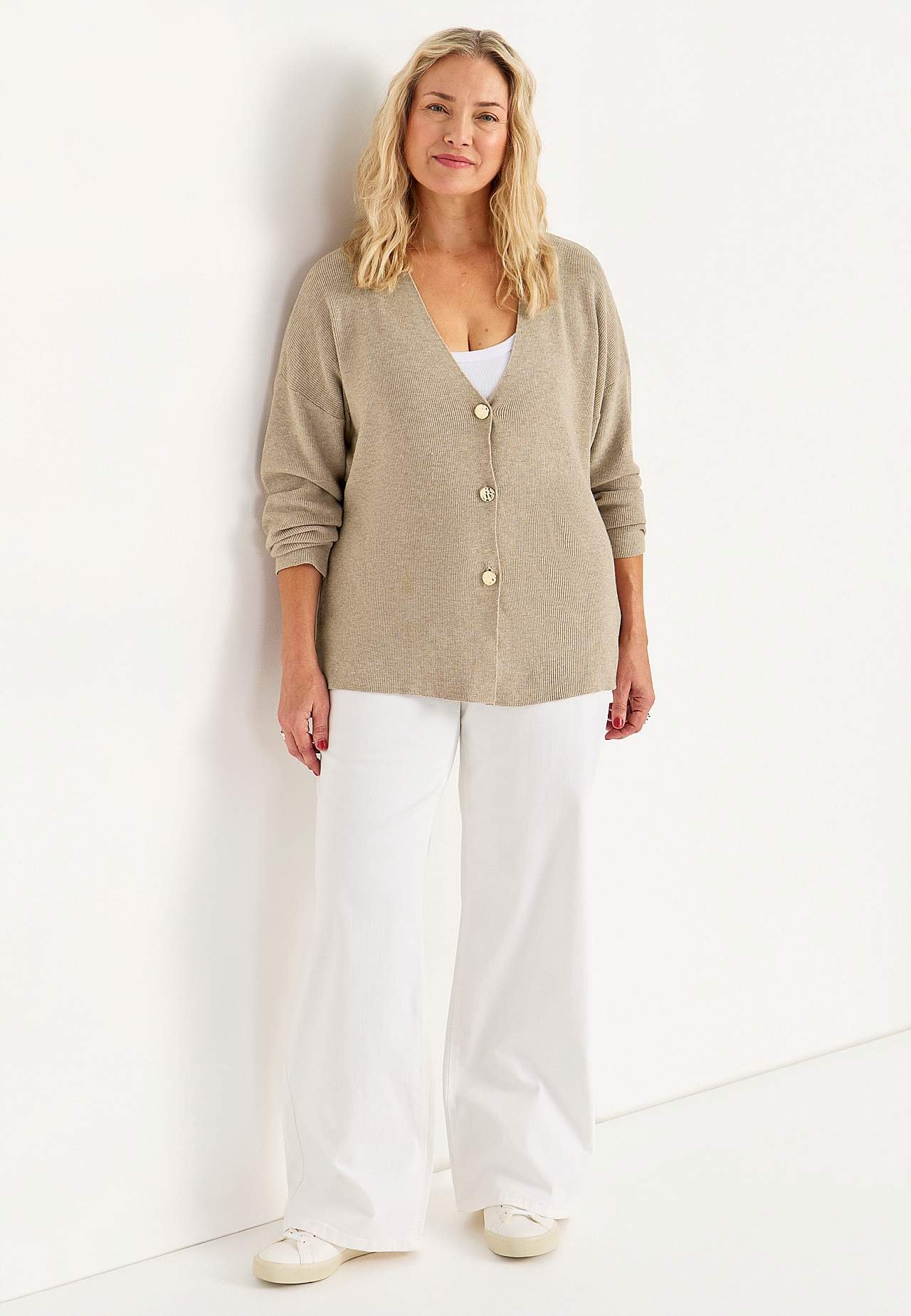 Mjuk, stretchig cardigan med knappar. Lätt figurformad passform. Hals med lite djupare v-ringning. Dekorativa knappar. Lätt nedhasad axel. Långa, raka ärmar. Fin att bära över en topp eller ett linne. Längden följer storleken ca 65-73 cm från axeln.