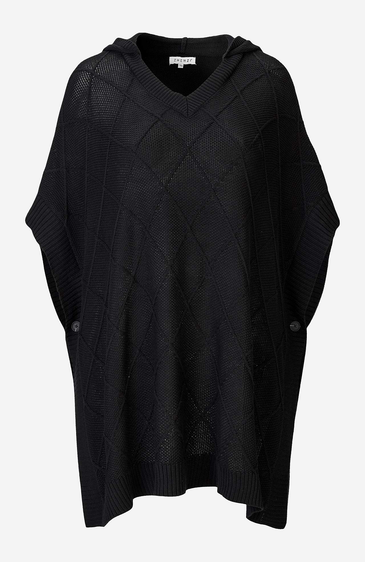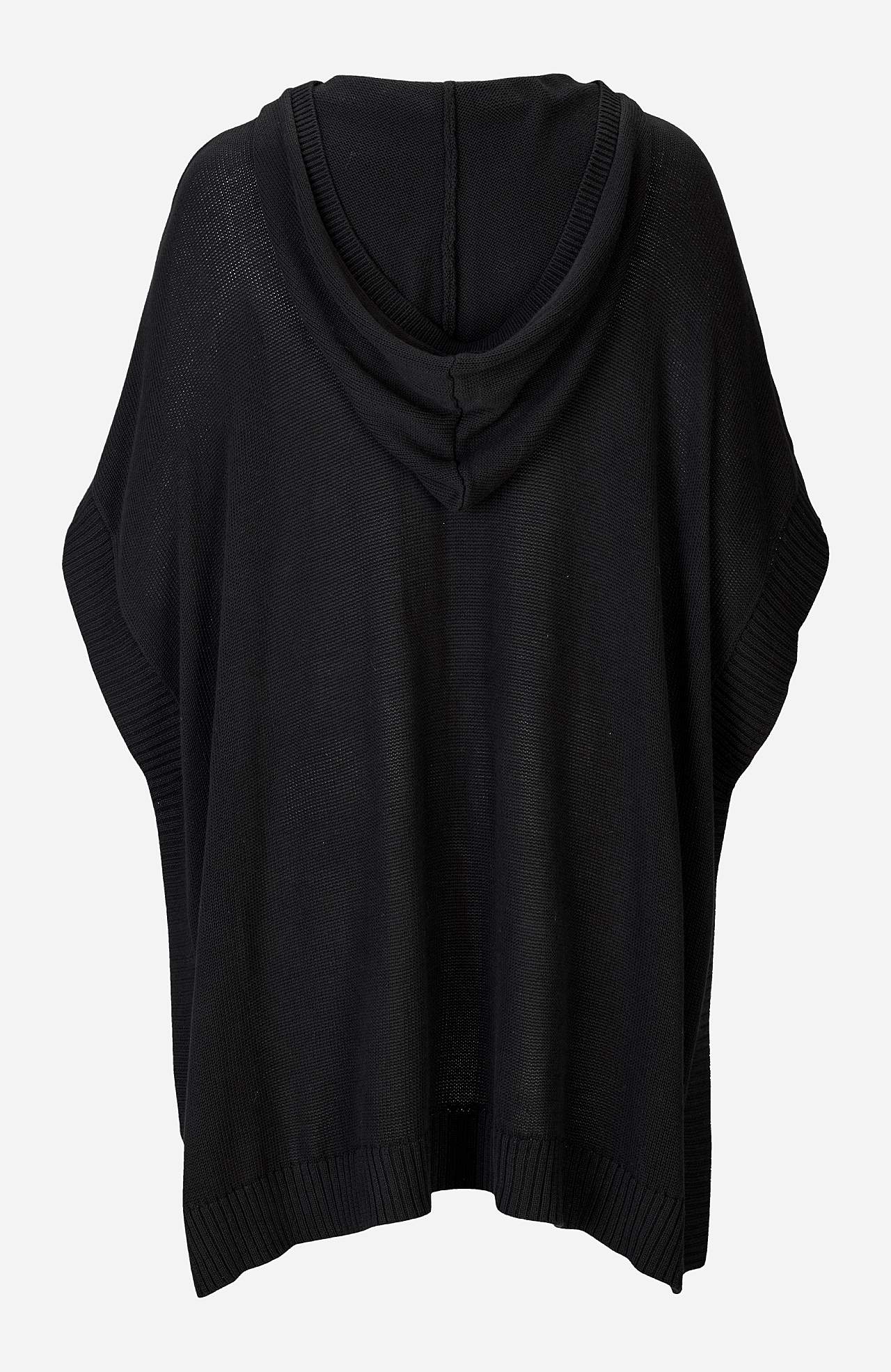 V-ringad poncho med fastsydd huva. Gjord av bomull. Modell med rymlig passform. Öppna sidor med knapp på varje sida. Bred ribbmudd runt om. Längd från axeln ca 83 cm i storlek 46/48 (M).