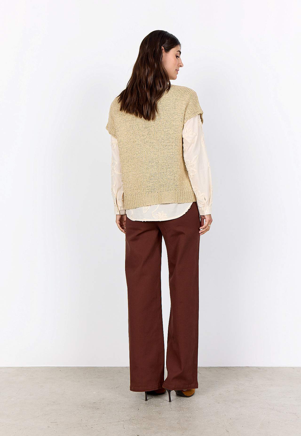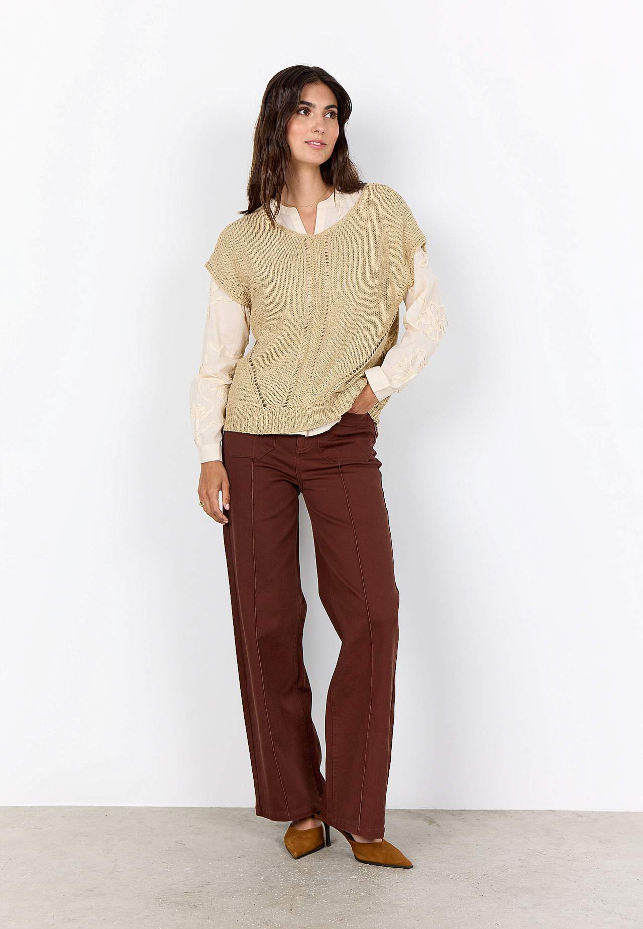 Luftig, mjuk tröja med hålstickat mönster på framsidan. Fin att bära över en topp eller ett linne. Ledig passform. Rundhalsad. Korta holkärmar. Rak, ribbstickad nederkant. Längd från axeln ca 57 cm i storlek 38/40 (S/M).