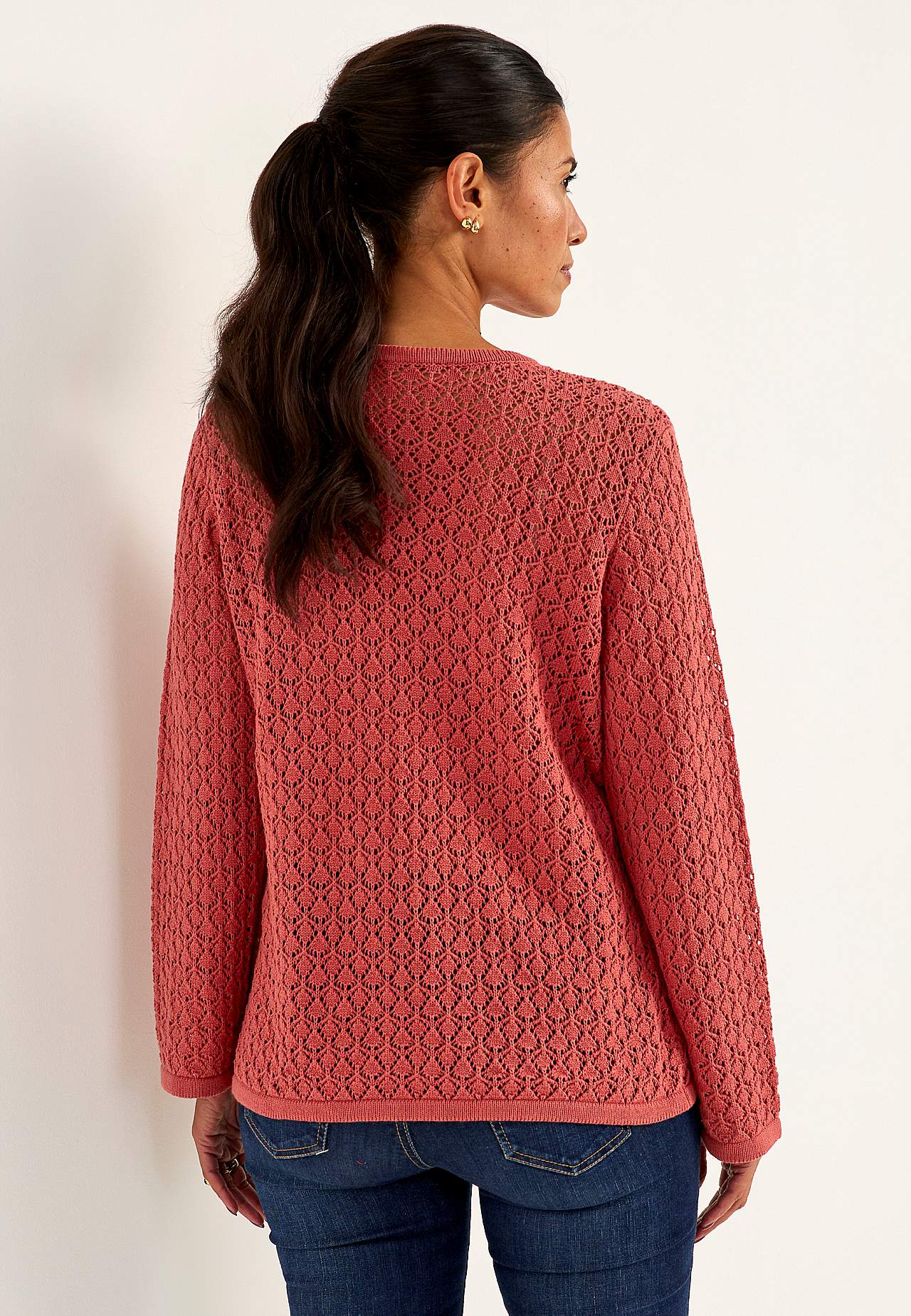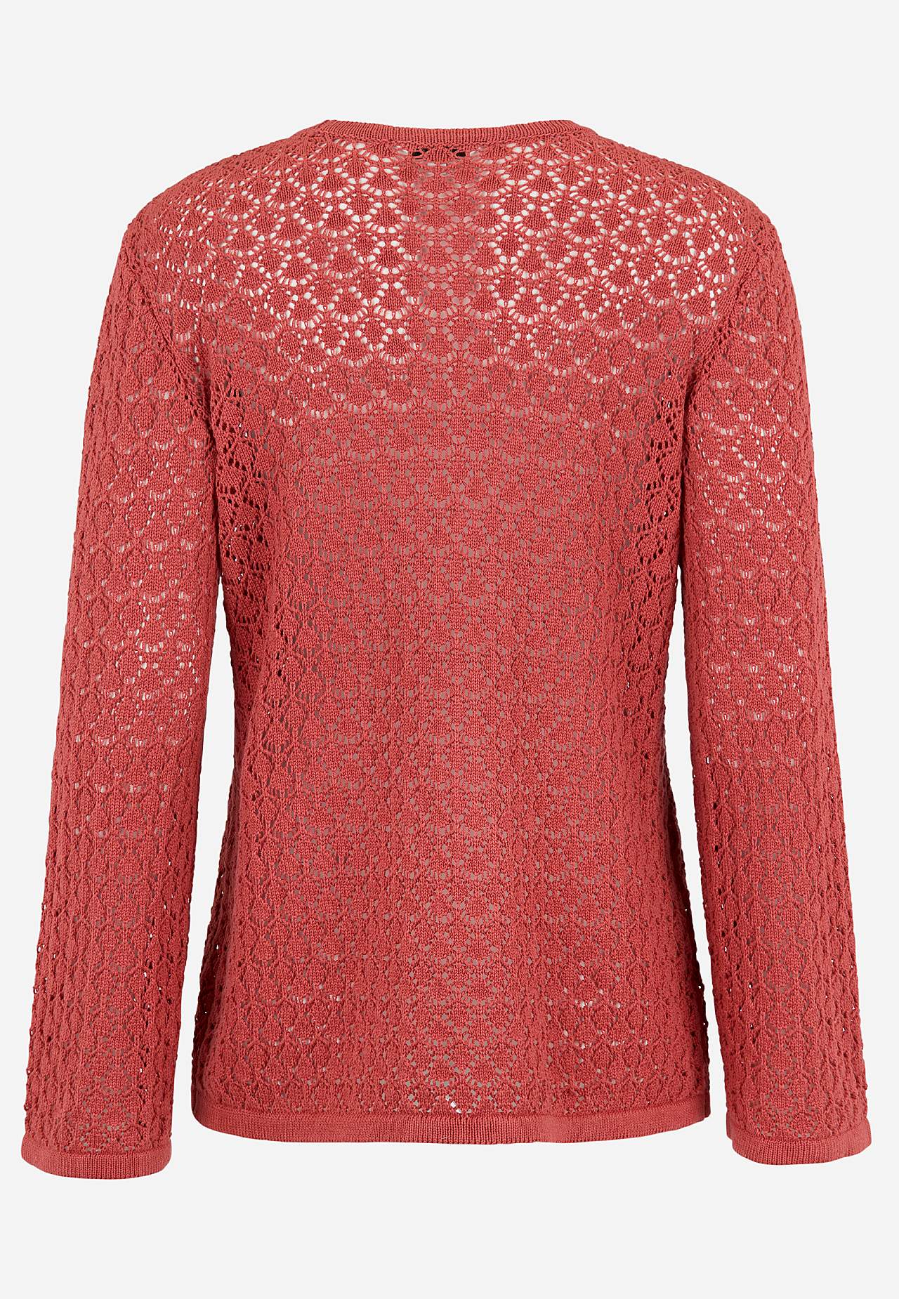 Mjuk, luftig tröja med spetsliknande finstickning. Skön mix av bomull och återvunnen polyester. Fin att bära över en topp eller ett linne. Rak passform. Rund halsringning med ribbstickad kant. Långa ärmar med lätt utsvängda ärmslut med ribbstickad kant. Längden följer storleken ca 63-71 cm från axeln.