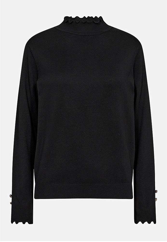 Finstickad, mjuk tröja med lite stretch. Halvpolo med vågig kant. Vida långa ärmar med två dekorativa knappar, vågiga kanter och slits. Ribbmudd i nederkanten. Längd från axeln ca 59 cm i storlek S(38).