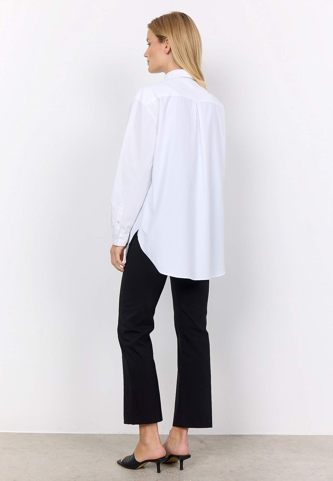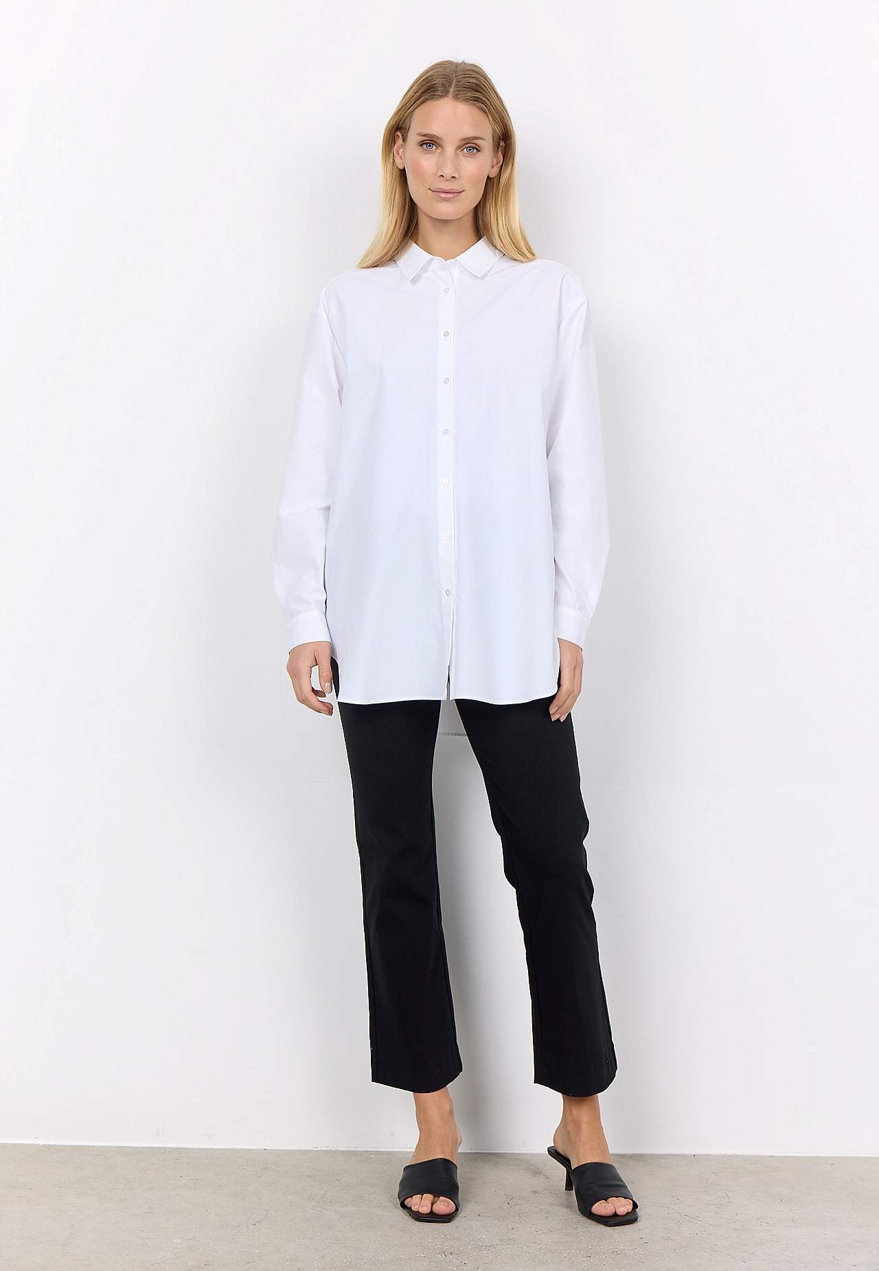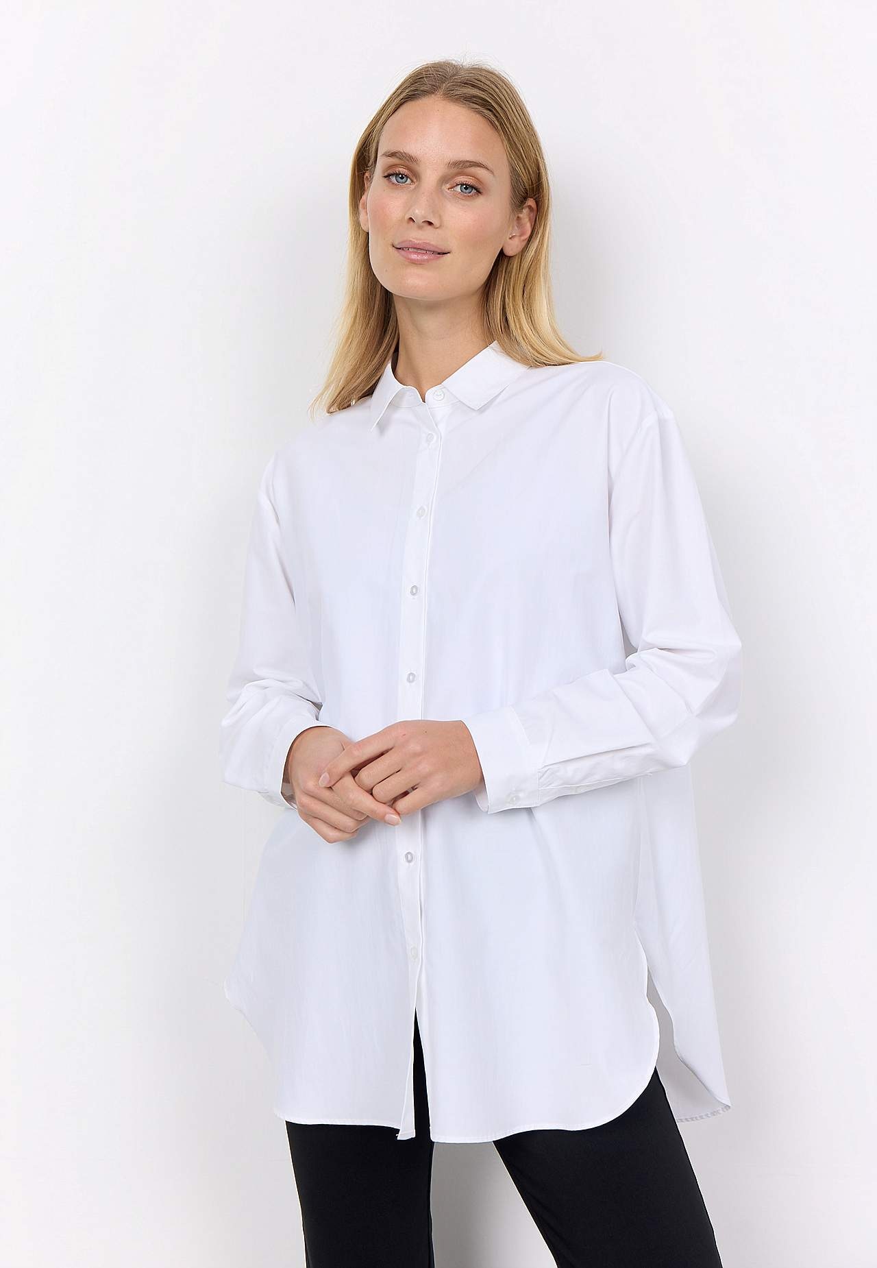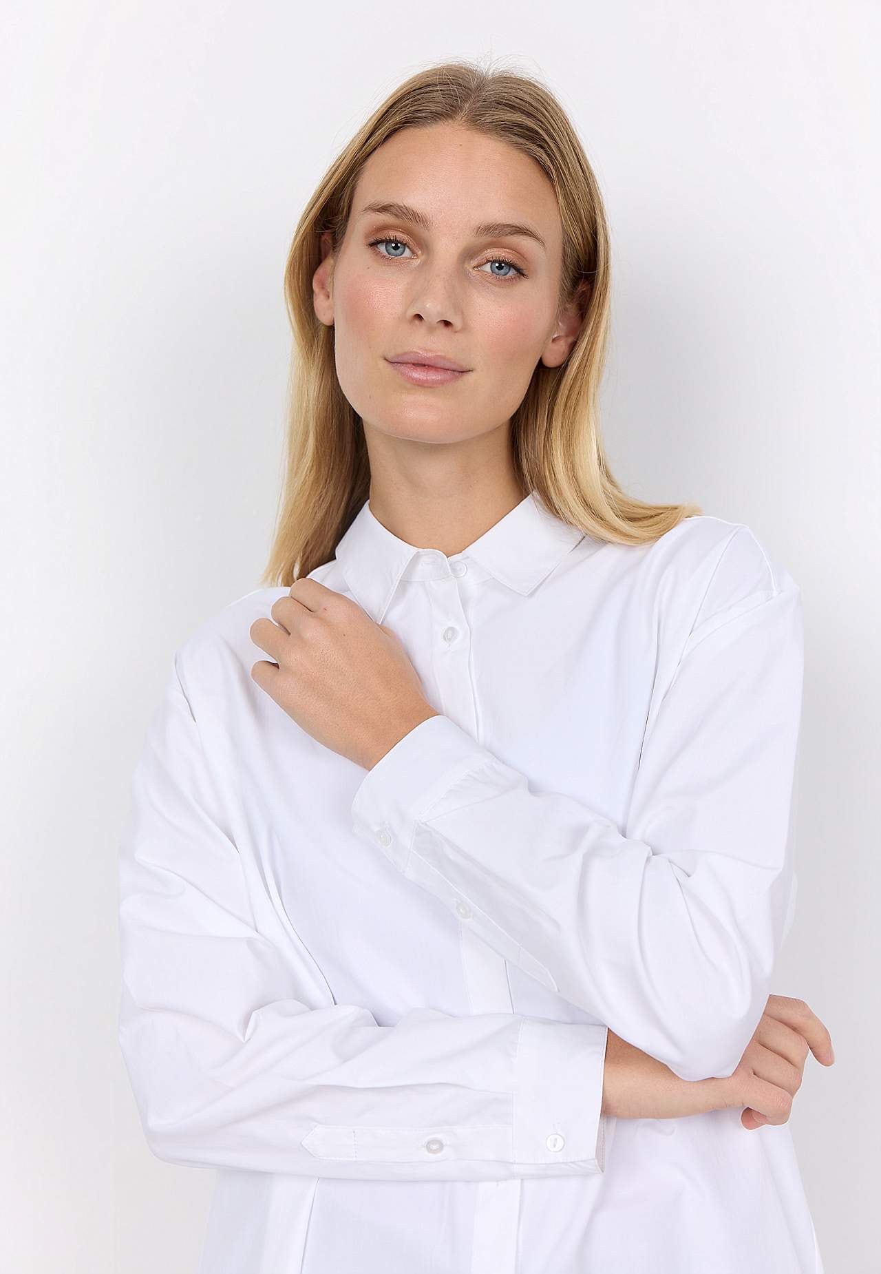 Lite längre skjorta med klassisk krage. Vävt, mjukt material med krispig känsla. Rak passform. Genomknäppt modell. Ok baktill med elegant motveck. Långa ärmar med manschett och knapp. Rundad nederkant. Längd ca 77 cm i storlek S (38).
