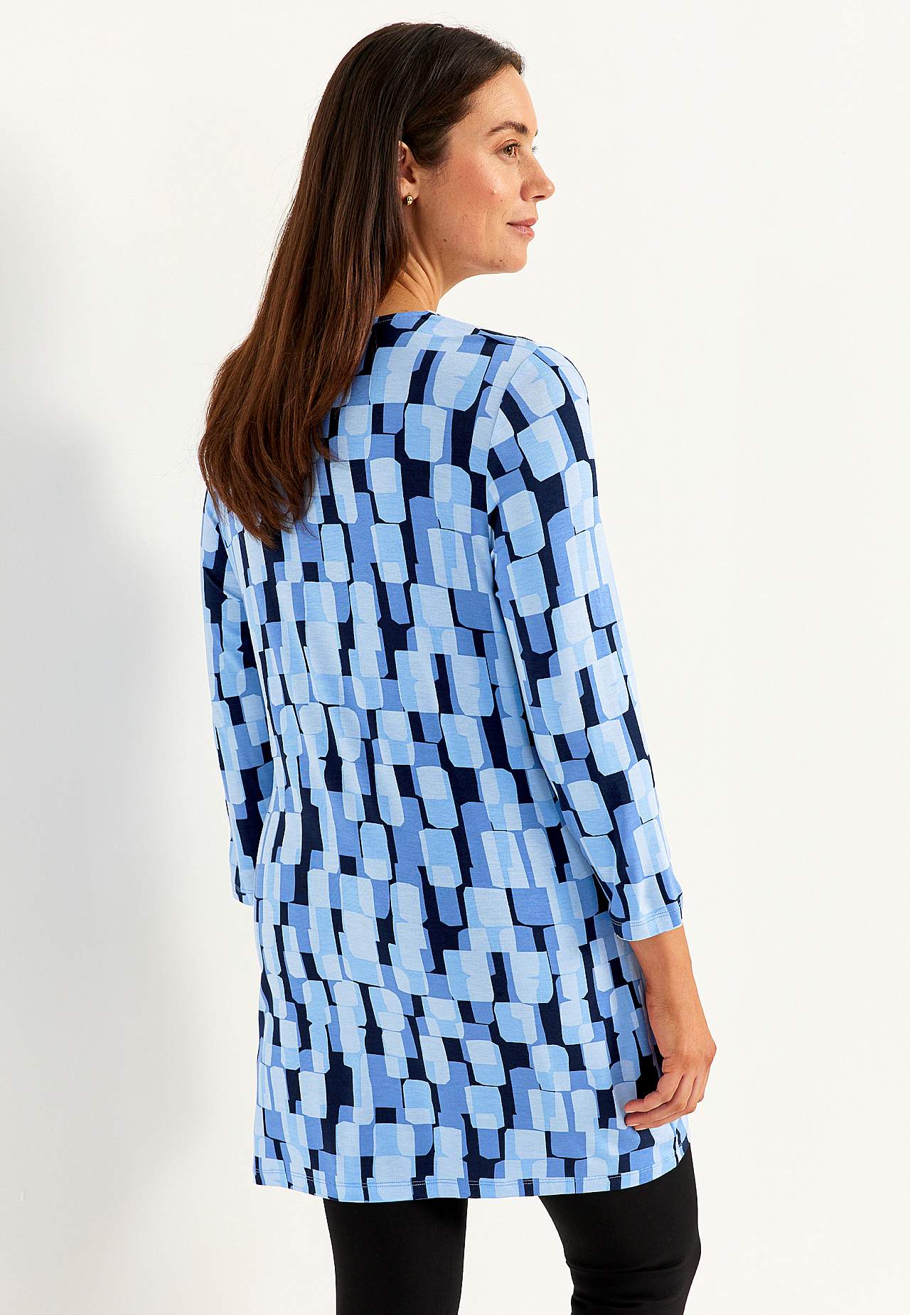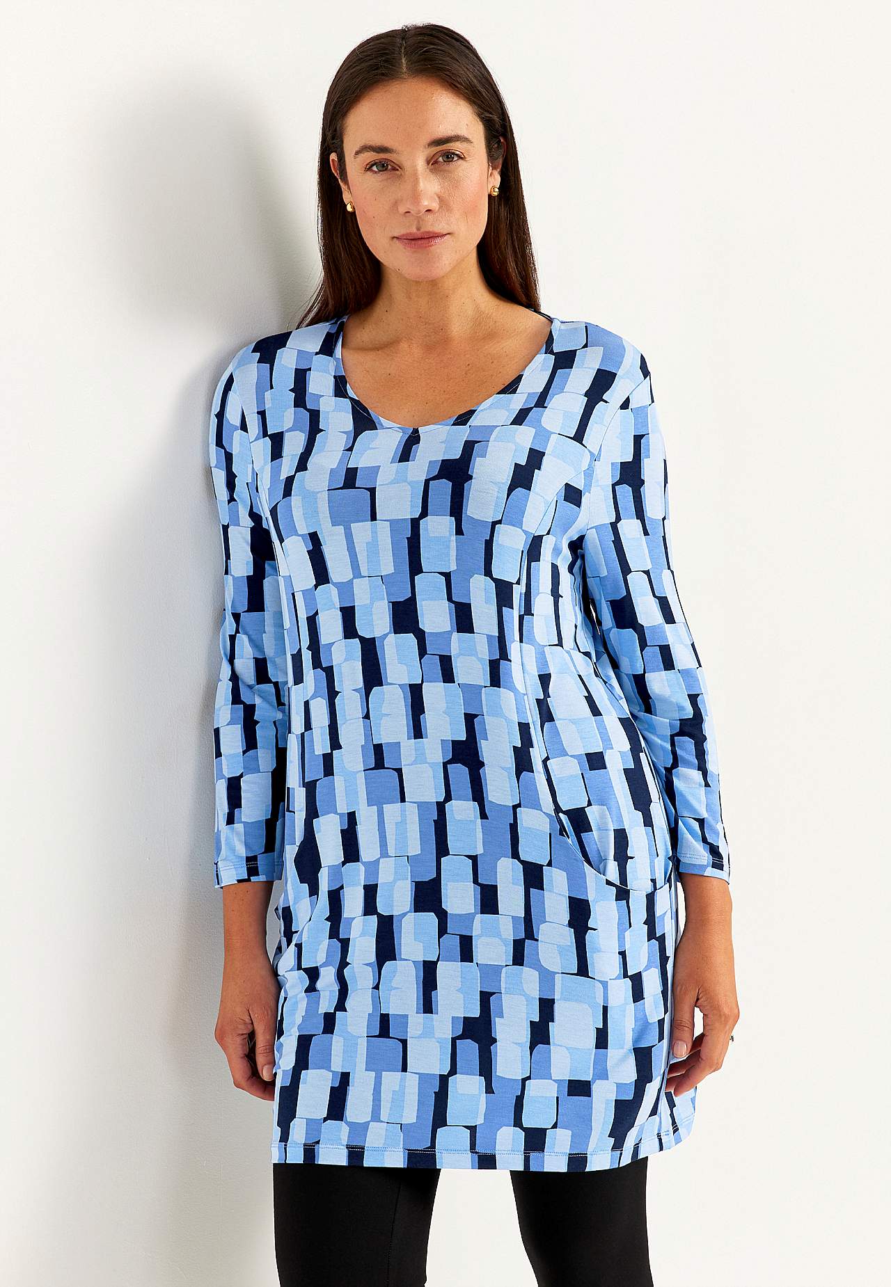 Tunika i underbart mjuk, stretchig viskos. Svalt material med fint fall. Normal passform. V-formad hals. Panelsömmar fram. Fickor framtill. Raka 3/4-ärmar. Rak nederkant. Längden följer storleken ca 82-89 cm från axeln.